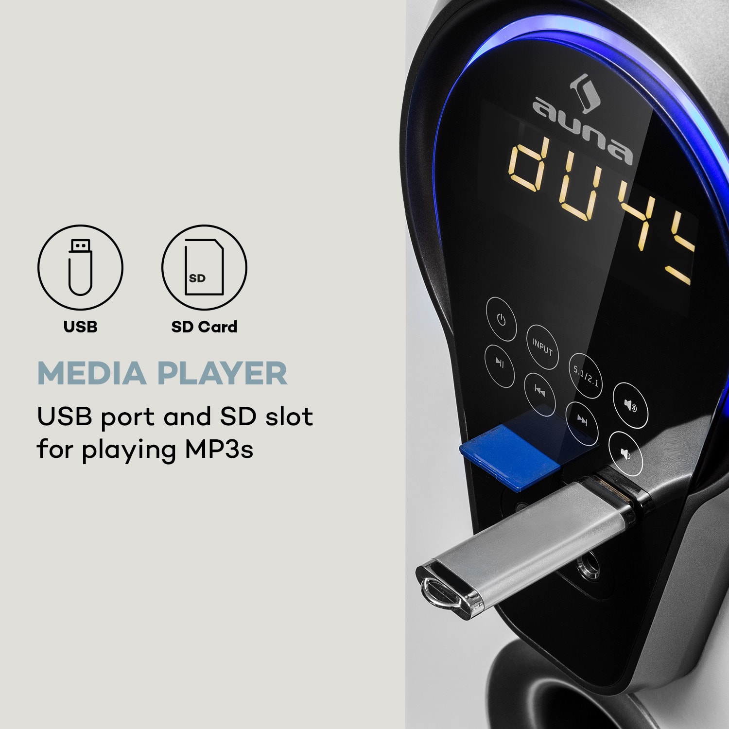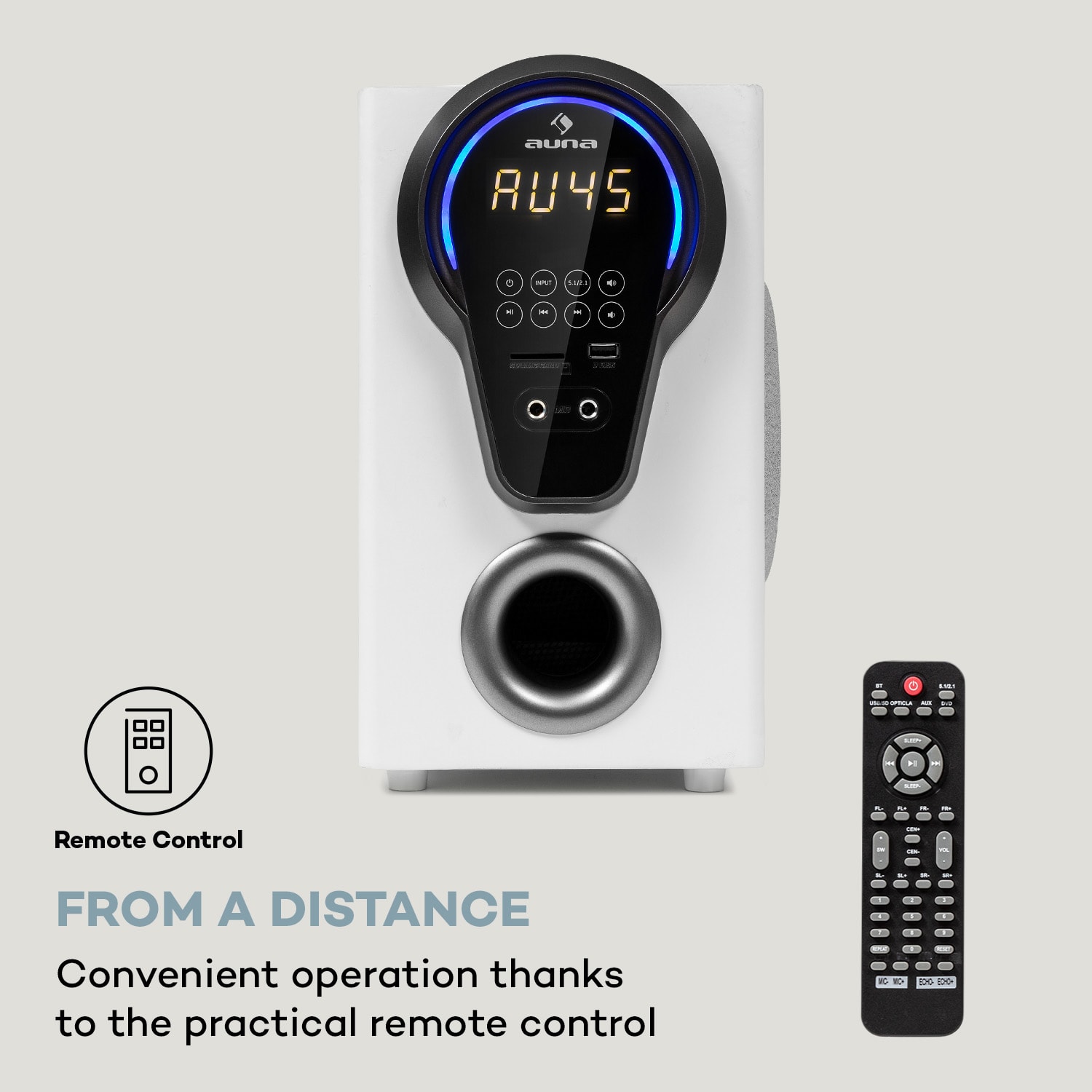 Ako v kine! S 5.1 kanálovým systémom domáceho kina auna Areal 525 DG zažiješ filmy, videohry a hudbu ako intenzívny priestorový zvukový zážitok vďaka veľmi kvalitnému zvuku!Technickým centrom systému domáceho kina je aktívny subwoofer, ktorý riadi a poháňa päť satelitných reproduktorov. 5,25″ basreflexový subwoofer vytvára v spolupráci s reproduktormi, pozostávajúcimi zo štyroch stĺpových a jedného centrálneho reproduktora, oblý, priestor vypĺňajúci zvuk s celkovým RMS výkonom 125 W. 5.1 systém auna Areal 525 DG má mnoho možností pripojenia a svoj zvuk získava z rôznych zdrojov. Cez USB a SD porty zabudované na prednej strane komunikuje surround systém s prenosnými dátovými zariadeniami, ako sú USB kľúče a SD karty, pre jednoduchý prístup k MP3 skladbám. Bluetooth rozhranie okrem toho umožňuje bezdrôtové streamovanie cez smartfón, tablet alebo laptop. Cez zadný AUX blok vstupov možno k zariadeniu auna Areal 525 DG pripojiť audio komponenty každého druhu, ako sú počítače, DVD, CD a MP3 prehrávače. Dva káblové mikrofóny sa dajú pripojiť pomocou dvoch 6,3 mm vstupov. Reťazenie satelitných reproduktorov sa uskutočňuje veľmi jednoducho prostredníctvom cinch konektorov, zatiaľ čo nastavenia menu a zvuku je možné prispôsobiť pomocou dodávaného diaľkového ovládača. Surround systém auna Areal 525 DG presvedčí aj vizuálne a vďaka svojmu elegantnému celkovému dizajnu sa perfektne začlení do akéhokoľvek prostredia obývačky.Priamo uprostred zvuku: zaži skutočný pocit z kina v obývačke s 5.1 systémom domáceho kina auna Areal 525 DG!