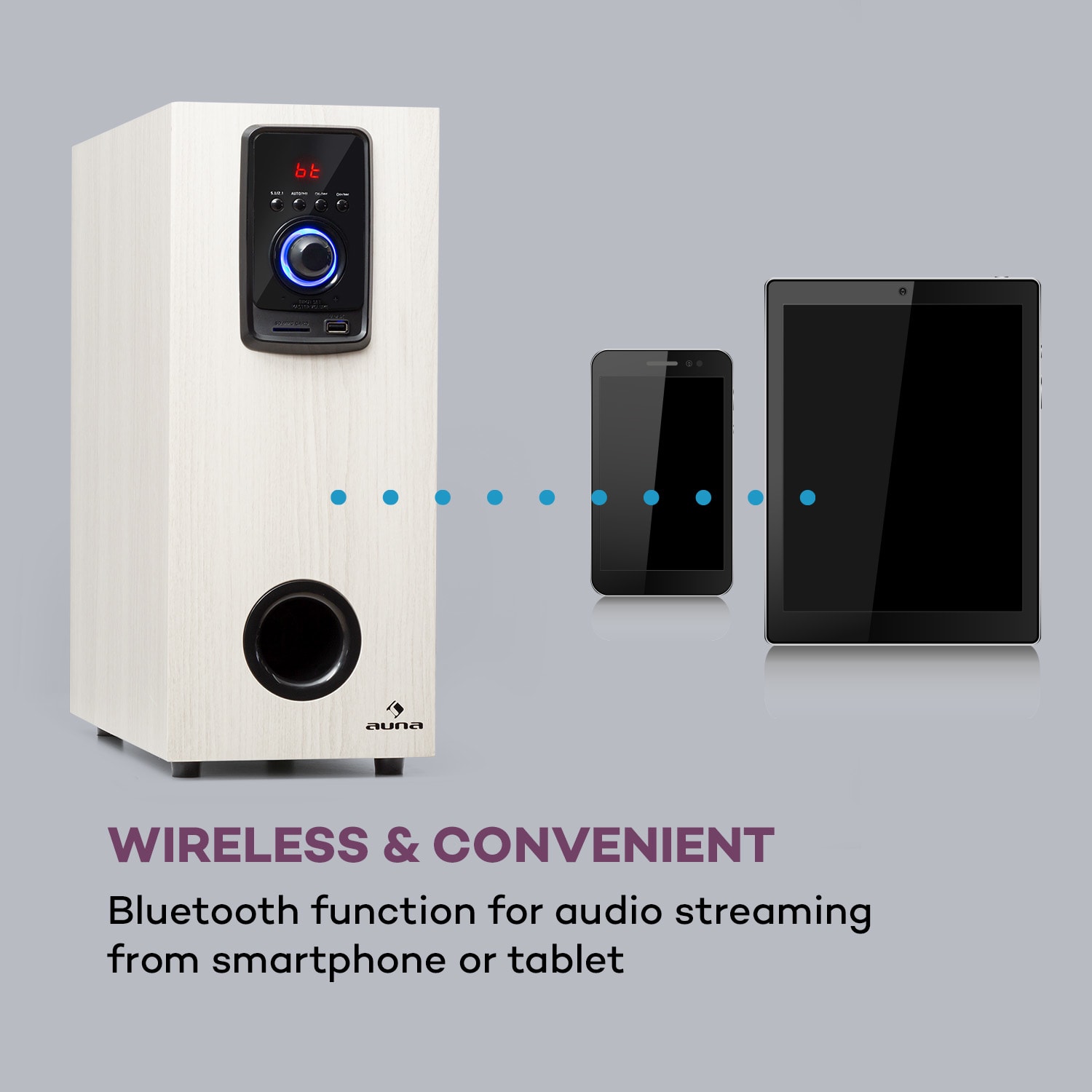 Ako v kine! S 5.1-kanálovým systémom domáceho kina auna Areal Elegance zažiješ filmy, videohry a hudbu ako intenzívny priestorový zvukový zážitok vďaka veľmi kvalitnému zvuku!Technickým centrom systému domáceho kina je aktívny subwoofer, ktorý riadi a poháňa päť satelitných reproduktorov. 5″ basreflexový subwoofer vytvára v spolupráci s reproduktormi, pozostávajúcimi zo štyroch vežových a jedného centrálneho reproduktora, oblý, priestor vypĺňajúci zvuk s celkovým RMS výkonom 190 W. 5.1 systém auna Elegance má mnoho možností pripojenia a svoj zvuk získava z rôznych zdrojov. Cez USB a SD porty zabudované na prednej strane komunikuje surround systém s prenosnými dátovými zariadeniami, ako sú USB kľúče a SD karty, pre jednoduchý prístup k MP3 skladbám. Bluetooth rozhranie okrem toho umožňuje bezdrôtové streamovanie cez smartfón, tablet alebo laptop. Cez zadný AUX vstup možno k zariadeniu auna Areal Elegance pripojiť audio komponenty všetkého druhu, ako sú počítače, CD a MP3 prehrávače. Dva káblové mikrofóny sa dajú pripojiť pomocou dvoch 6,3 mm vstupov na zadnej strane subwoofera. Reťazenie satelitných reproduktorov sa uskutočňuje veľmi jednoducho prostredníctvom reproduktorových svoriek, zatiaľ čo nastavenia menu a zvuku je možné prispôsobiť pomocou dodávaného diaľkového ovládača. Surround systém auna Areal Elegance zaujme aj vizuálne a vďaka svojmu elegantnému celkovému dizajnu vo vzhľade svetlého dreva sa perfektne začlení do akéhokoľvek prostredia obývačky.Priamo uprostred zvuku: zaži skutočný pocit z kina v obývačke s 5.1 systémom domáceho kina auna Areal Elegance!