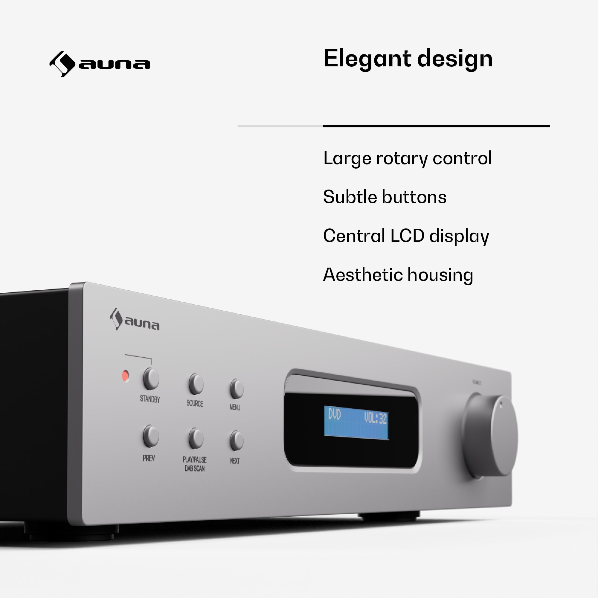 auna Art22 Zosilňovač DAB+ BT je výkonný hi-fi zosilňovač, ktorý prekonáva všetky audiofilské očakávania. S pôsobivým výstupným výkonom 2 x 60 W poskytuje čistý a silný zvuk, ktorý oživí každú hudobnú notu. Vďaka Bluetooth konektivite môžete jednoducho pripojiť svoje mobilné zariadenia a ovládať zvuk pomocou priloženého diaľkového ovládača.Integrované DAB+ rádio s odnímateľnou anténou zaisťuje najlepší príjem. Priame prehrávanie diskov CD a DVD je tiež možné a prináša váš multimediálny zážitok na najvyššiu úroveň. Všestranné možnosti pripojenia, ako je optický a koaxiálny vstup, ako aj výstup REC dopĺňajú rozmanitosť funkcií tohto zosilňovača.Kompaktný dizajn zosilňovača auna Art22 DAB+ BT ho robí priestorovo úsporným a univerzálnym. Vďaka svojim kompaktným rozmerom sa bez problémov zmestí do akéhokoľvek audio nastavenia.
