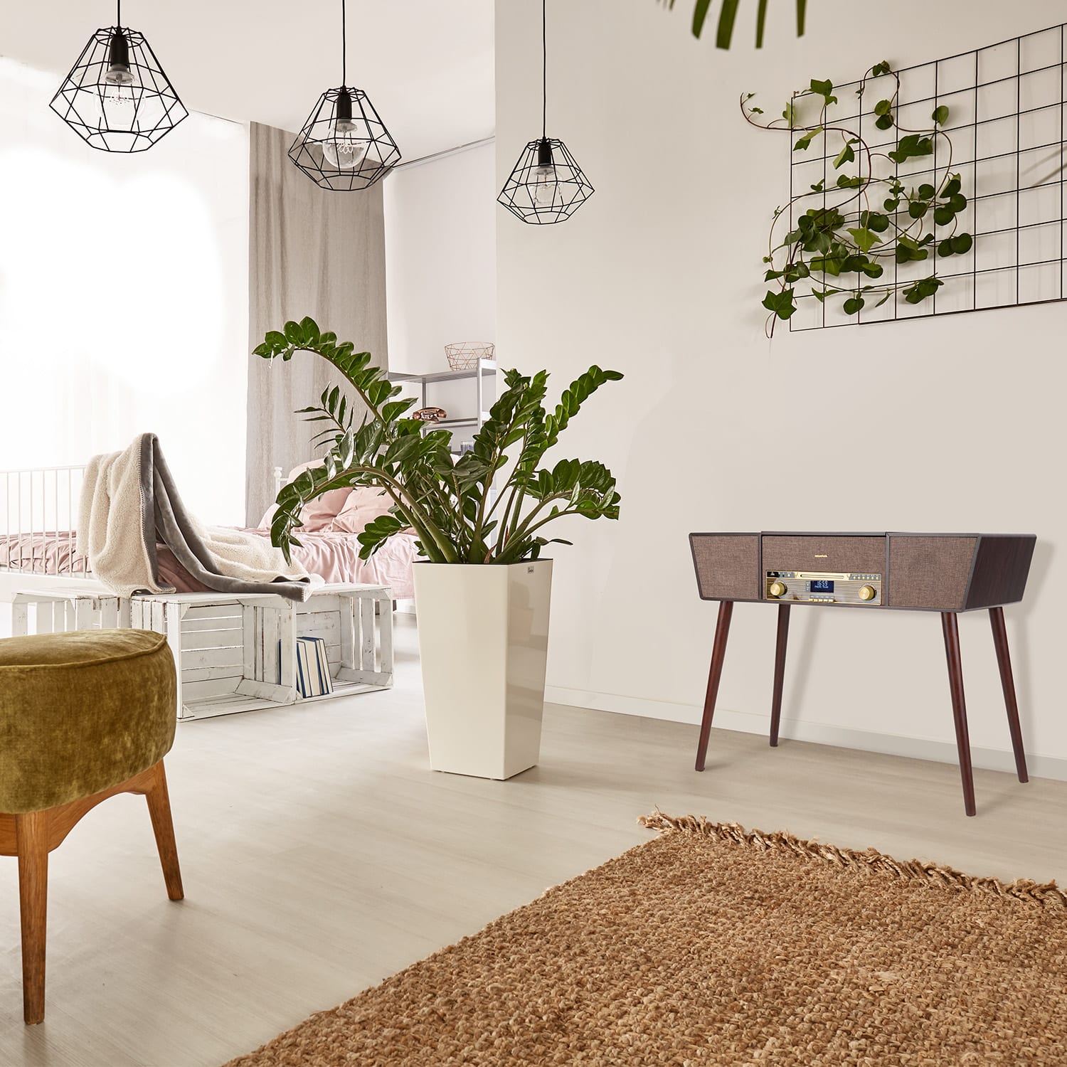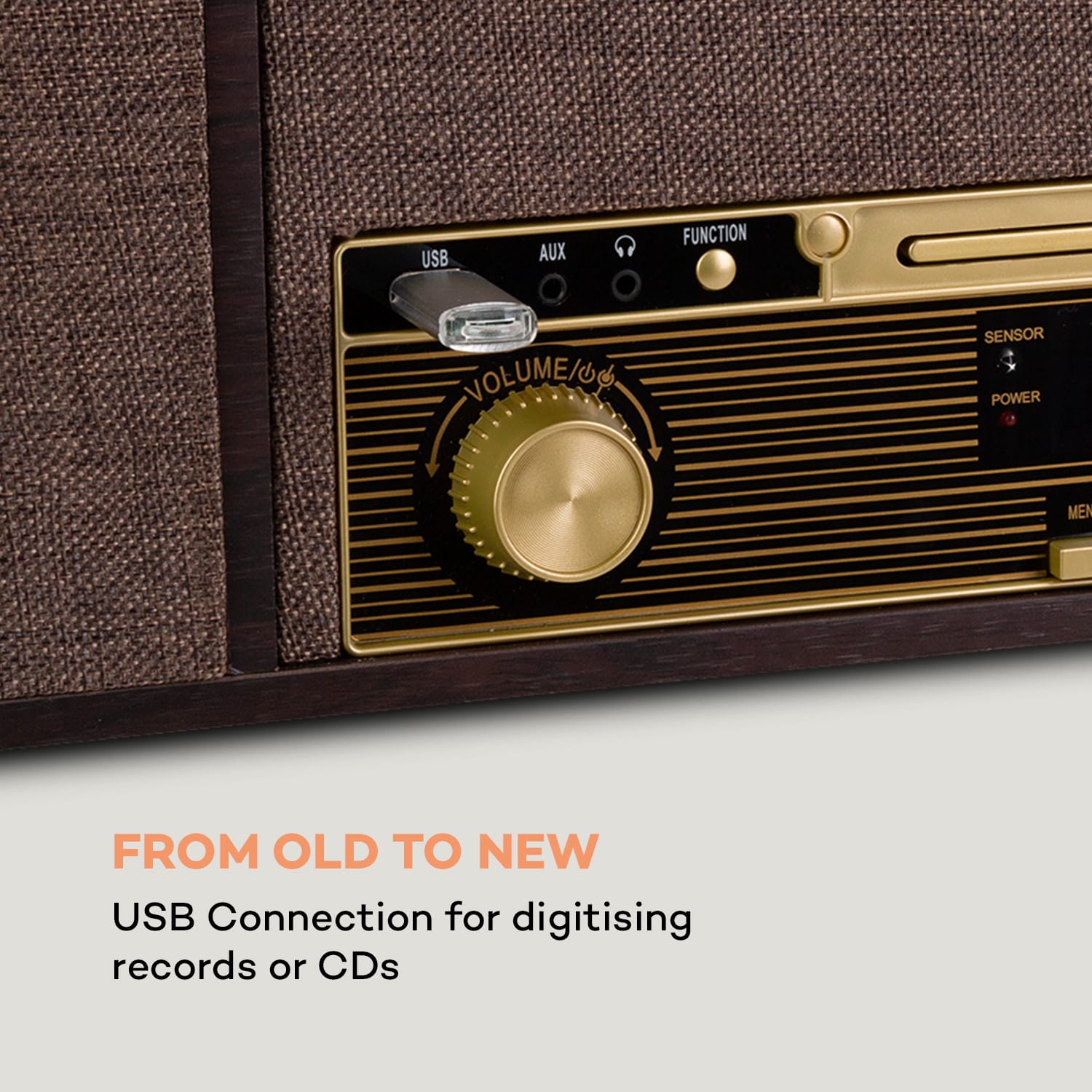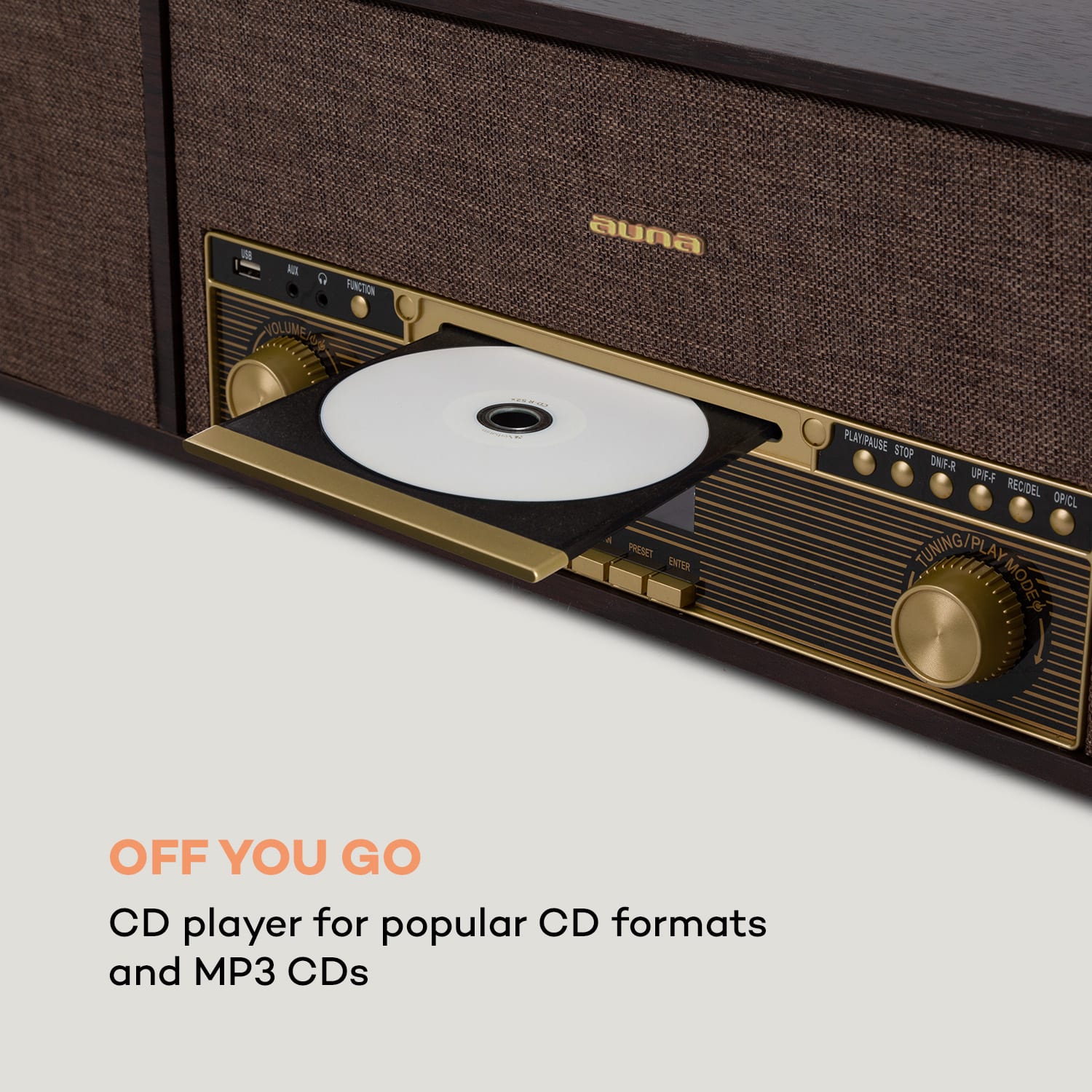 Retro gramofón auna Belle Epoque 1912 je pôsobivý stereo prehrávač v štýlovom dizajne, ktorý kombinuje to najlepšie z minulosti s technológiou budúcnosti.Ku klasickým možnostiam prehrávania patrí aj gramofón, prostredníctvom ktorého je možné prehrávanie vinylových platní v troch rýchlostiach – 33 1/3, 45 a 78 ot./min. Systém má navyše bluetooth pripojenie na streamovanie hudby zo smartfónu, tabletu alebo notebooku, CD prehrávač na MP3 CD a rádiový tuner DAB+/FM. Na obslúženie aktuálnych prehrávacích médií disponuje retro gramofón auna aj USB rozhraním s podporou MP3, ktoré je vybavené funkciou nahrávania: hudba, prehrávaná na gramofóne alebo CD prehrávači, sa dá uložiť na USB kľúč a neskôr spracovať pomocou PC.Elegantná a pevná retro MDF skriňa so 4 odnímateľnými nožičkami robí z retro gramofónu Belle Epoque 1912 od spoločnosti auna zaujímavý dizajnový objekt.