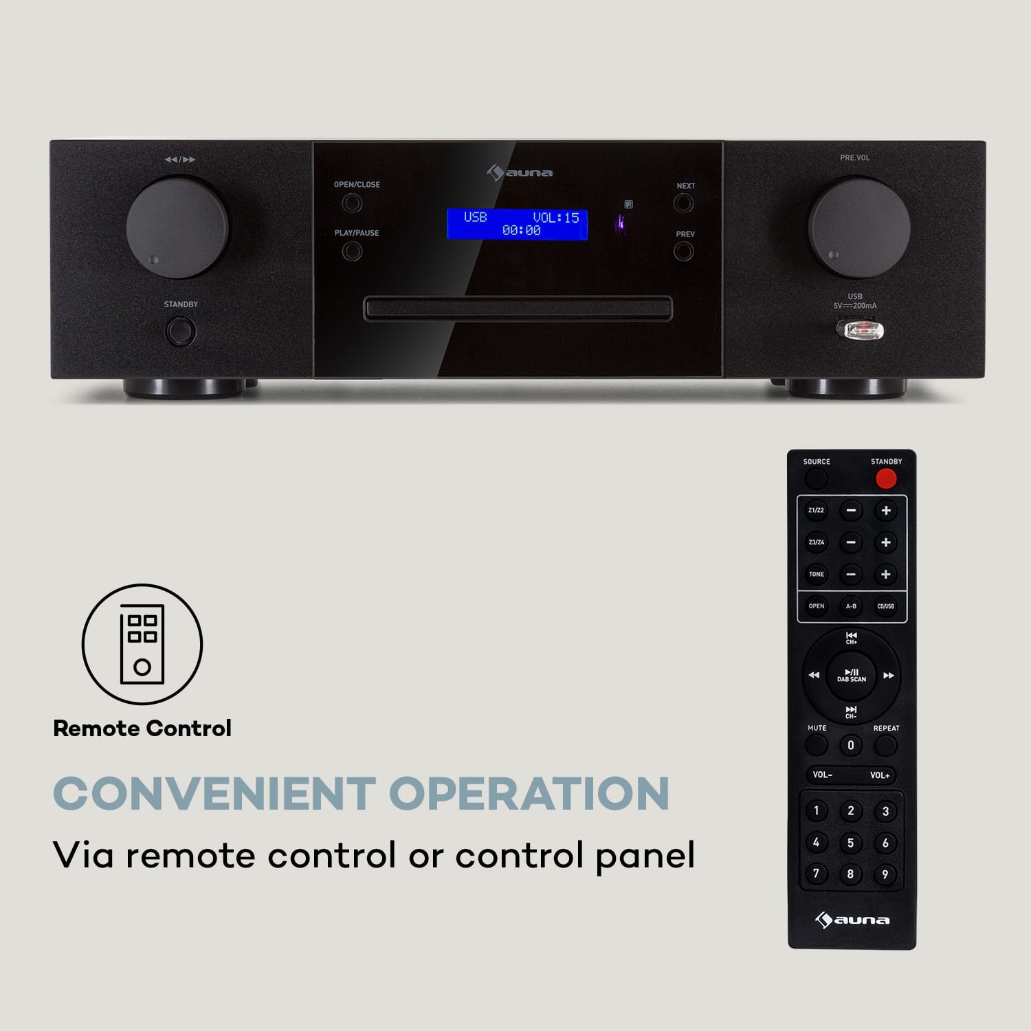 auna CD-1000 DG je klasický CD prehrávač s výsuvným slotom na CD a praktickým diaľkovým ovládaním. Okrem bežných zvukových diskov CD prehráva aj zvukové médiá vo formáte CD-R, RW a MP3. Jeho prehľadný ovládací panel zahŕňa aj LED displej. Okrem toho je na prednej strane CD-1000 DG ľahko prístupný USB slot. Na zadnej strane CD prehrávača nájdete audio výstup na jednoduché pripojenie zosilňovačov, ako aj koaxiálny a optický výstup. Jeho striedmy dizajn pôsobí vďaka hliníkovému prednému panelu stále luxusne. CD prehrávač CD-1000 DG od auna vkusne dopĺňa modernú atmosféru bývania milovníkov Hi-Fi.