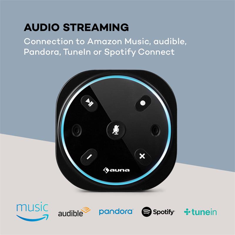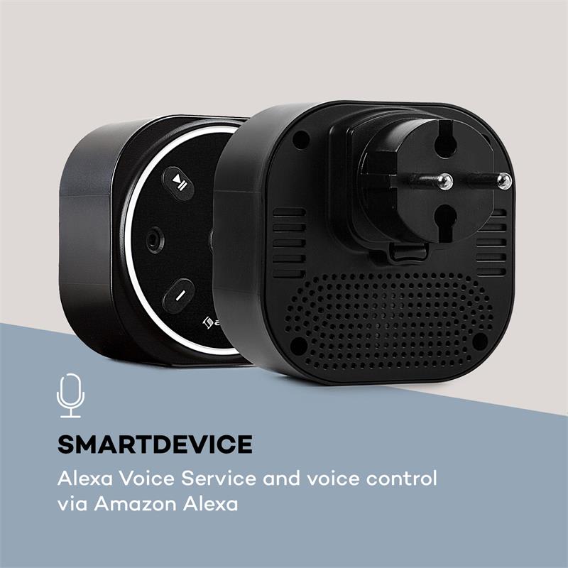 Rozbaľte, zapojte, hotovo! WiFi reproduktor auna Intelligence Plug je inteligentný, priestorovo úsporný a plne mobilný hudobný spoločník do kuchýň, kúpeľní a iných miestností s elektrickou zásuvkou. Inteligentný reproduktor auna Intelligent Plug je Vaše domáce inteligentné zariadenie: netreba tu stláčať žiadne tlačidlá, pretože Alexa VoiceControl umožňuje ovládanie pomocou hlasového príkazu: Alexa hraj hudbu! Zariadenie Intelligence Plug môže vytvárať prostredníctvom siete WLAN kontakt k mnohým audio streamingovým službám, ktoré potom možno používať bez akéhokoľvek pohybu rúk: Amazon Music, audible, Pandora, TuneIn, Spotify Connect atď. Za predpokladu zodpovedajúceho Amazon konta sú dispozícii, samozrejme, aj ostatné funkcie služby Alexa Voice Service: nechajte si pripomenúť termíny, počúvajte svoju obľúbenú hudbu, informujte sa o počasí, môžete si nechať zodpovedať otázky alebo sa zabaviť na vtipe o Chuckovi Norrisovi – funkcie Alexy neustále rastú a uľahčujú každodenný život. Pomocou streamingovej služby TuneIn slúži auna Inteligence Plug ako internetové rádio, ktoré prijíma tisíce rozhlasových staníc z celého sveta a stabilne a bez šumu ich prehráva. Komu by to nestačilo, môže využívať schopnosti inteligentného reproduktora ako bluetooth prijímača a spárovať ho so svojou databázou hudby v smartfóne, tablete alebo v MP3 prehrávači. A v neposlednom rade sa dá inteligentný bezdrôtový reproduktor používať v multiroom prevádzke, a tak vytvárať multiroom prostredie. Týmto spôsobom je možné spárovať až 6 zodpovedajúcich zariadení a nielen zásobovať celý byt hudbou, ale hudbu zároveň nechať presúvať s Vami podľa miesta, kde sa nachádzate. Ak chcete ovládať multiroom sieť alebo sa pripojiť so svojím Spotify Connect Premium účtom, k dispozícii je nekomplikovaná aplikácia auna Intelligence pre iOS aj Android zariadenia. Základné funkcie je, samozrejme, možné používať pomocou 5 tlačidiel aj priamo na zariadení. Či už hľadáte ráno zábavu ku káve, obedný pop & rock alebo večer klasickú hudbu k relaxu vo vani, bezdrôtový reproduktor do zásuvky auna Intelligence Plug Vás počúvne na slovo a bude Vás nasledovať všade, kde je k dispozícii zásuvka a internet. Všimnite si, prosím, že Spotify Connect sa dá používať iba prostredníctvom aplikácie auna Intelligence.
