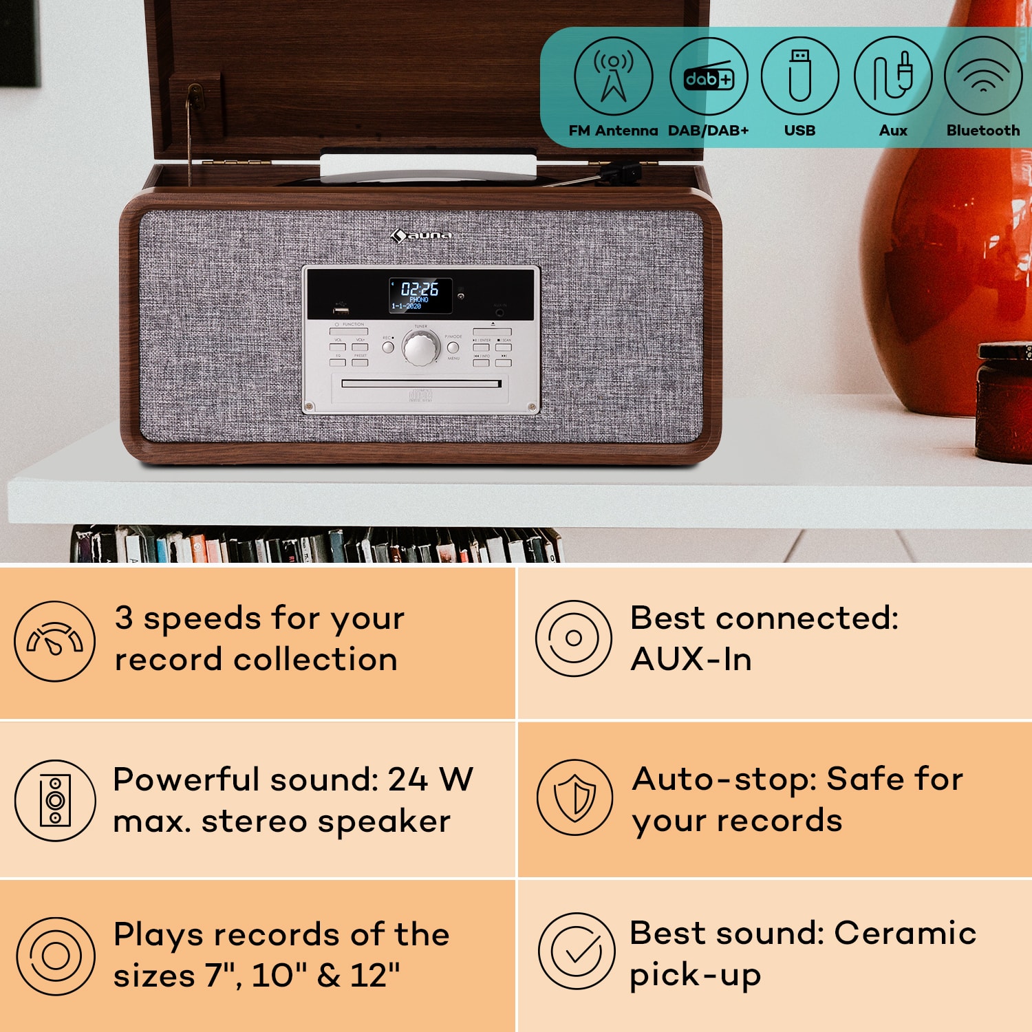 Auna Mary Ann, gramofón, 33 ⅓ / 45 / 78 otáčok/min, CD, DAB+, UKW, BT, USB –Kúpiť