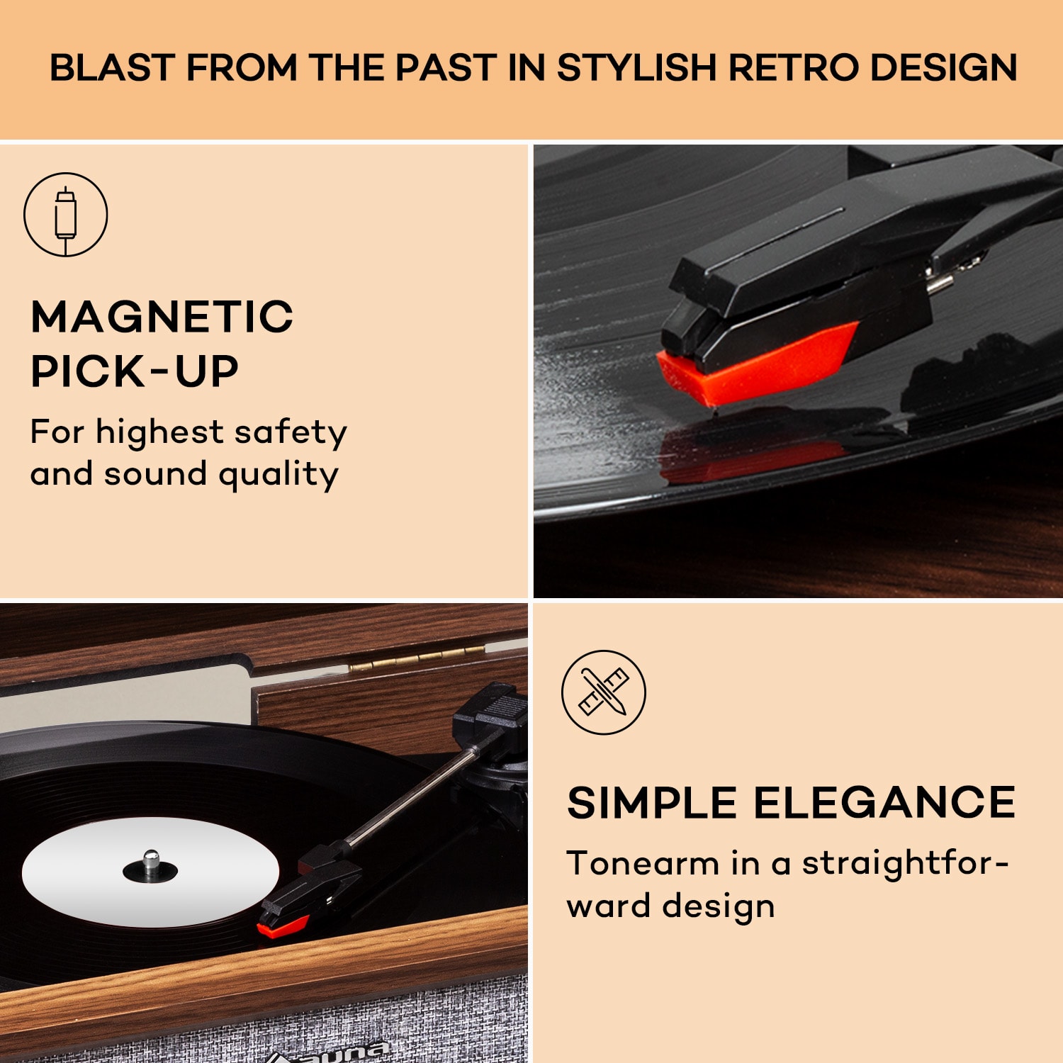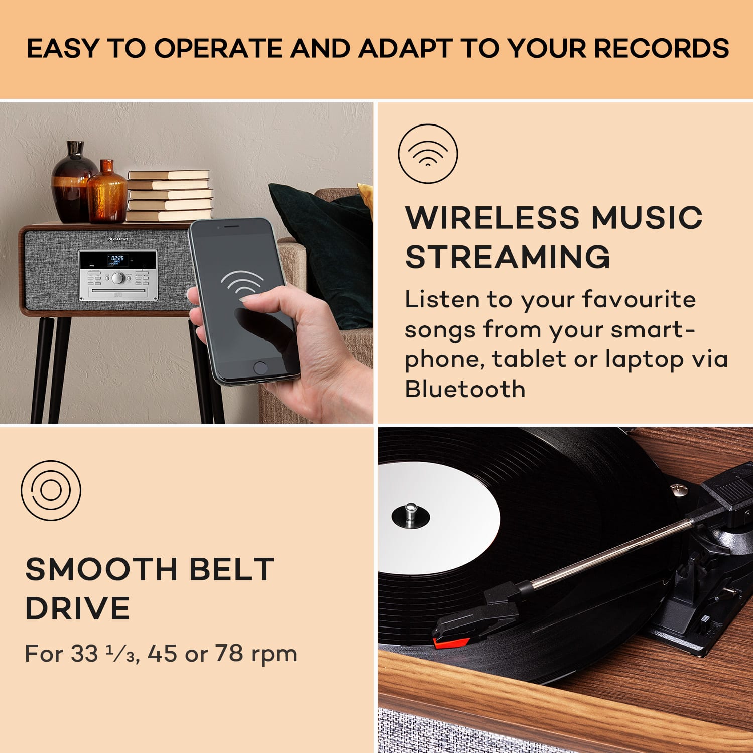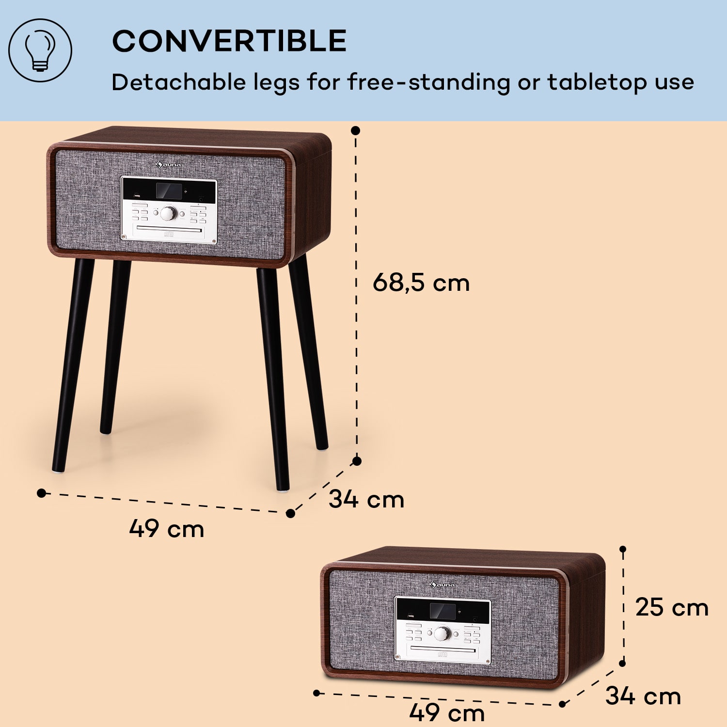 Gramofón auna Mary Ann je moderná technológia v elegantnom retro šate 50. rokov. Vďaka odnímateľným nohám inšpiruje ako variabilný dizajnový nábytok v štýle príručného stolíka alebo ako stolová jednotka so vzhľadom svetového prijímača!Stereo reproduktory sú už integrované v kompaktnom puzdre, takže prehrávač je okamžite pripravený prehrávať hudbu. Všetky tri štandardné veľkosti platní si nájdu svoje miesto na gramofóne. Mary Ann ponúka aj niekoľko ďalších možností prehrávania: prehrávač CD pre formáty CD, CD-R, CD-RW a MP3, ako aj rádio DAB+ a FM s automatickým vyhľadávaním obľúbených rozhlasových staníc vo vysokej kvalite bez šumu. K dispozícii je port USB na prehrávanie súborov MP3 alebo aj na praktické nahrávanie z vinylu, CD alebo rádia. Pripojenie Bluetooth gramofónu auna Mary Ann umožňuje streamovanie zo smartfónu, tabletu alebo počítača.Hudba z dizajnového kusu nábytku: Gramofón Mary Ann od auna oživuje časy veľkých čiernych platní a je ozdobou každého obytného prostredia.