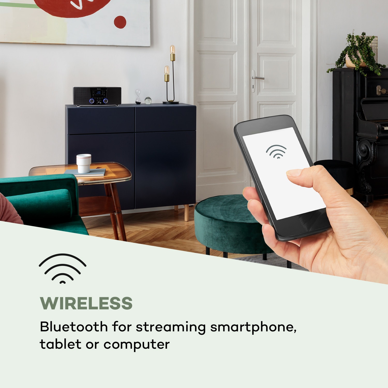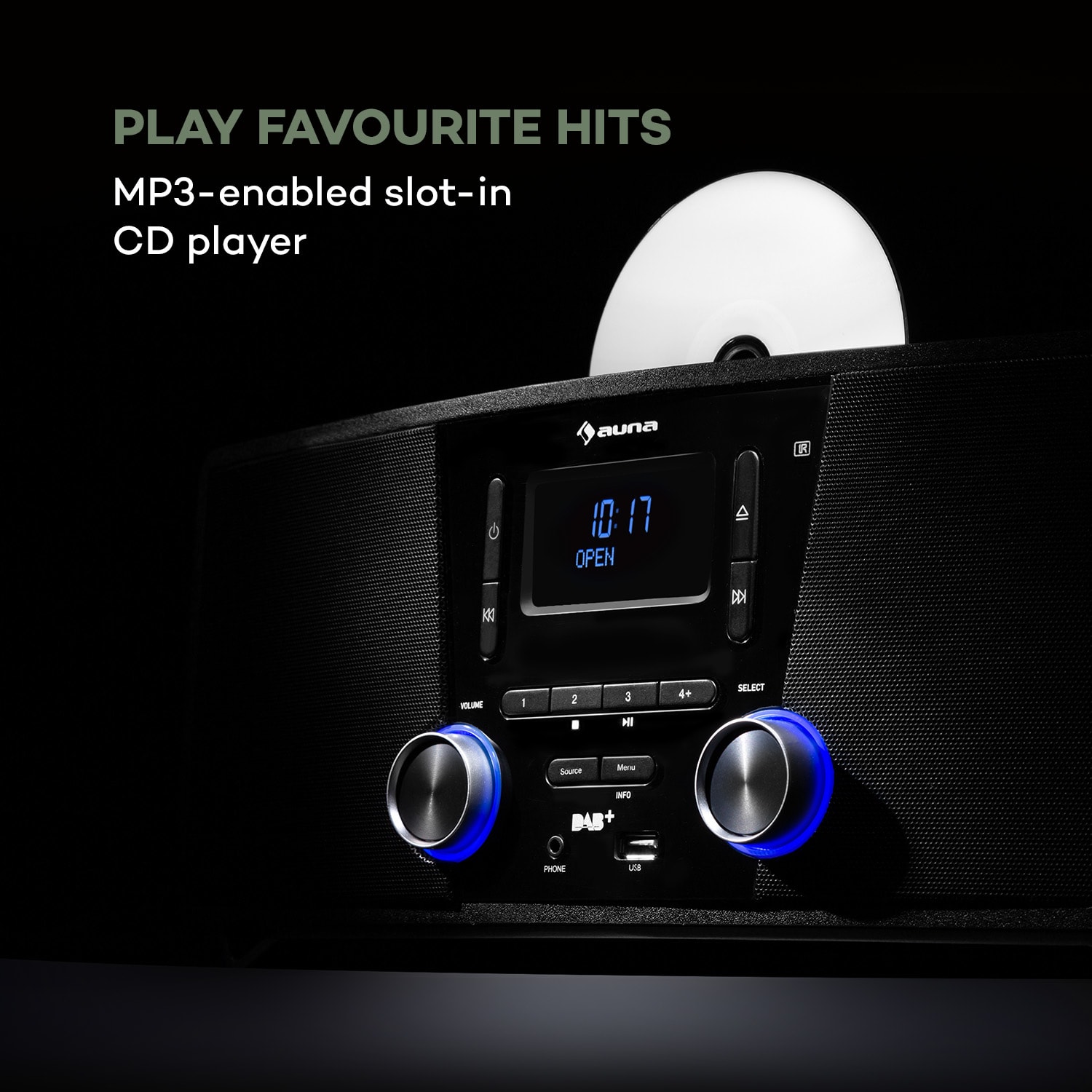 Mikro stereo systém auna Stockton je výkonné a multifunkčné všestranné zariadenie, ktoré aj napriek kompaktným rozmerom obohatí každú domácnosť s najlepšou kvalitou hudby.Slot-In CD prehrávač prehráva okrem bežných formátov aj MP3. Pre bezdrôtové pripojenie je kompaktný stereo systém Stockton vybavený vstavaným rozhraním Bluetooth, ktoré sa rýchlo a ľahko pripája k smartfónu, tabletu alebo počítaču a prehráva ich mediálny obsah.Vďaka DAB+ tuneru stereo systému Stockton je možné digitálne prijímať všetky rozhlasové stanice okrem analógového tunera FM a poskytovať stabilný zvuk bez šumu v najvyššej kvalite zvuku. Informácie DAB + a funkcia RDS sa zobrazujú na OLED-displeji: prehľady programov, informácie, správy alebo hudba sa dajú pohodlne prečítať na veľkom farebnom displeji. Výkonný stereo zvuk s max. výkonom 20 W (2x 5 W RMS) poskytuje dynamický zvuk kedykoľvek, zapínateľný X-Bass a rozsiahle funkcie EQ zaisťujú individuálny zvuk.Ak chcete okrem CD, Bluetooth a DAB + / FM rádia použiť ďalšie zdroje hudby, môžete pomocou AUX-IN pripojiť externé zariadenia alebo pripojiť USB kľúč do USB portu. Ďalšou zvláštnosťou stereo systému je budík a funkcia spánku: tým pádom sa hodí aj na nočný stolík.Mikro stereo systém sa ovláda pomocou ovládania na prednej strane alebo úplne pohodlne na diaľku pomocou diaľkového ovládača.Perfektný zvuk pri kompaktných rozmeroch: mikro stereo systém Stockton od auna.