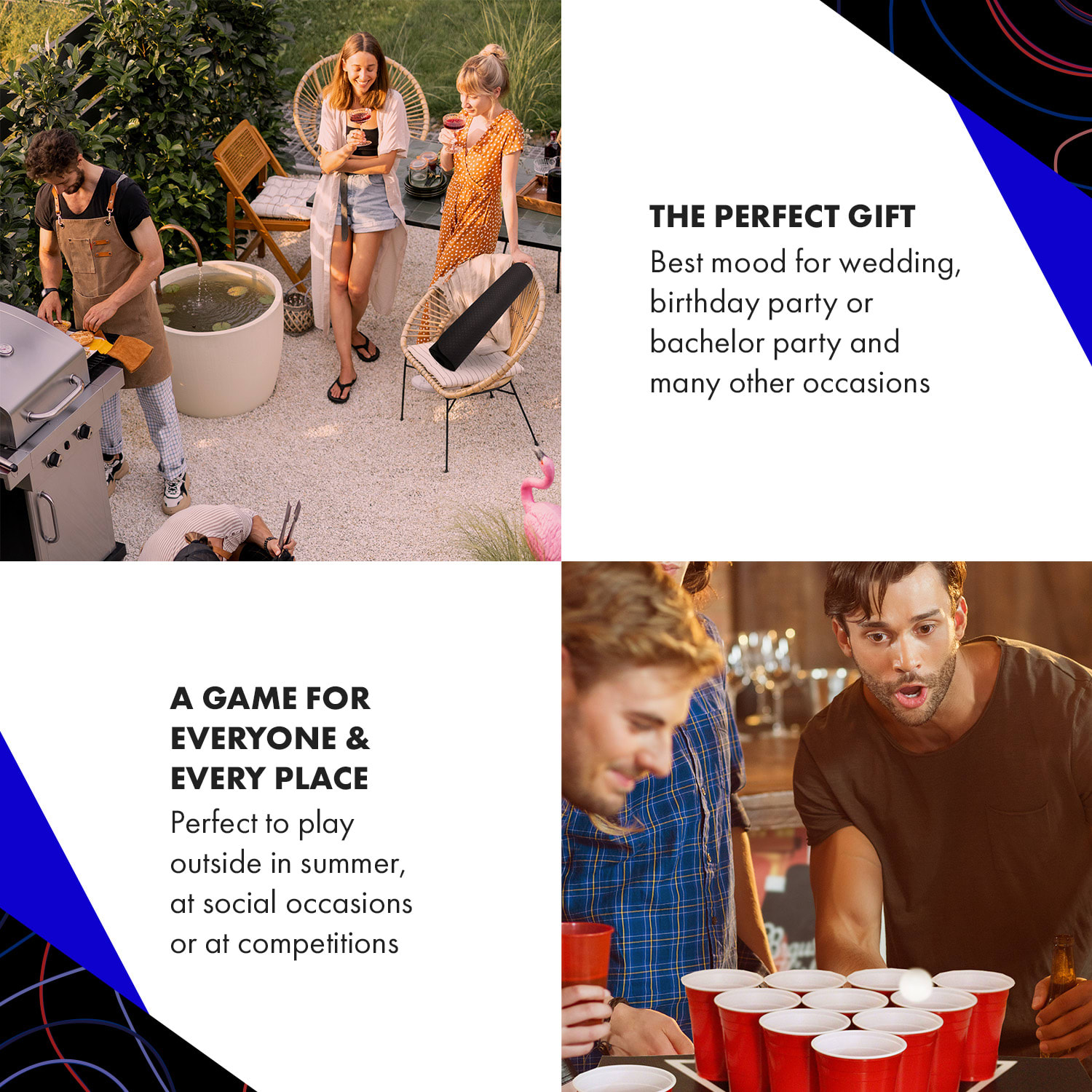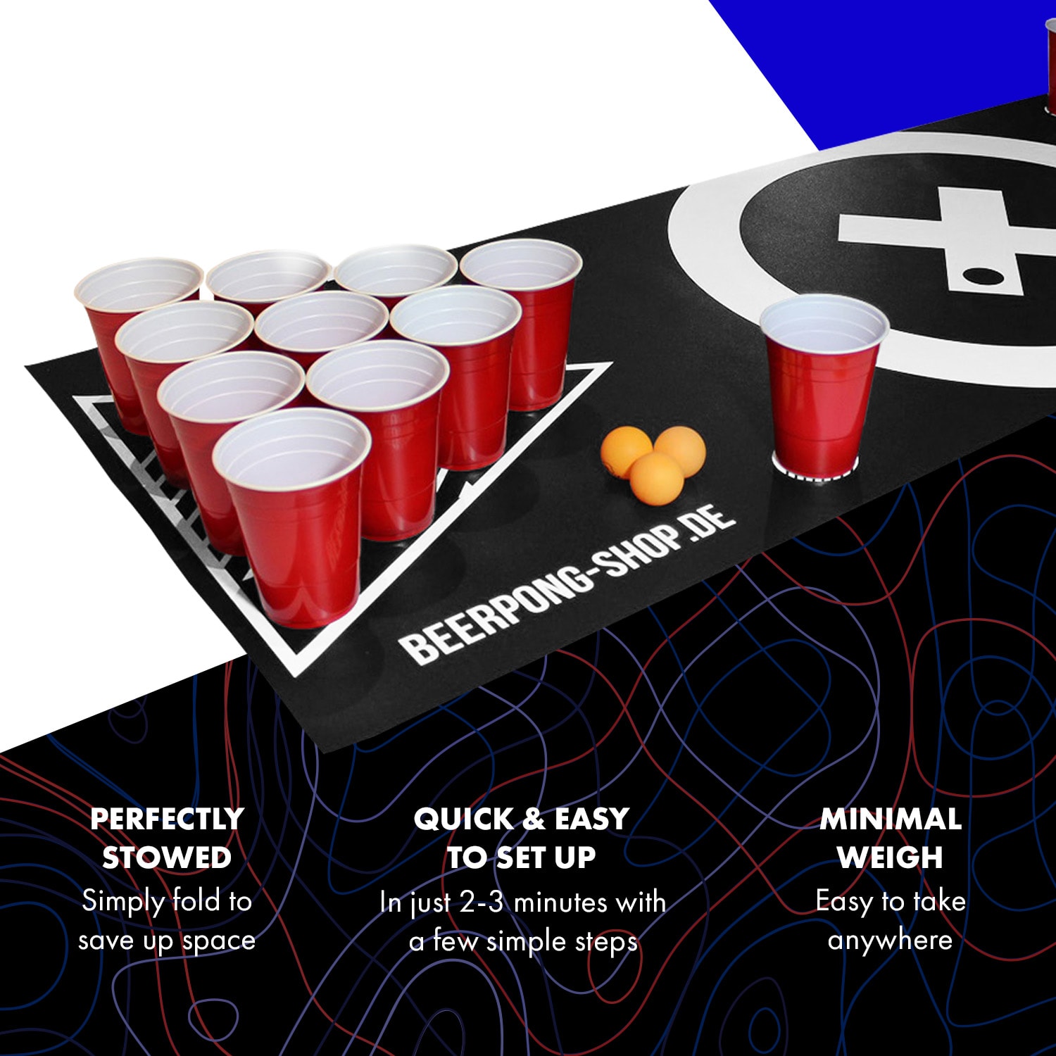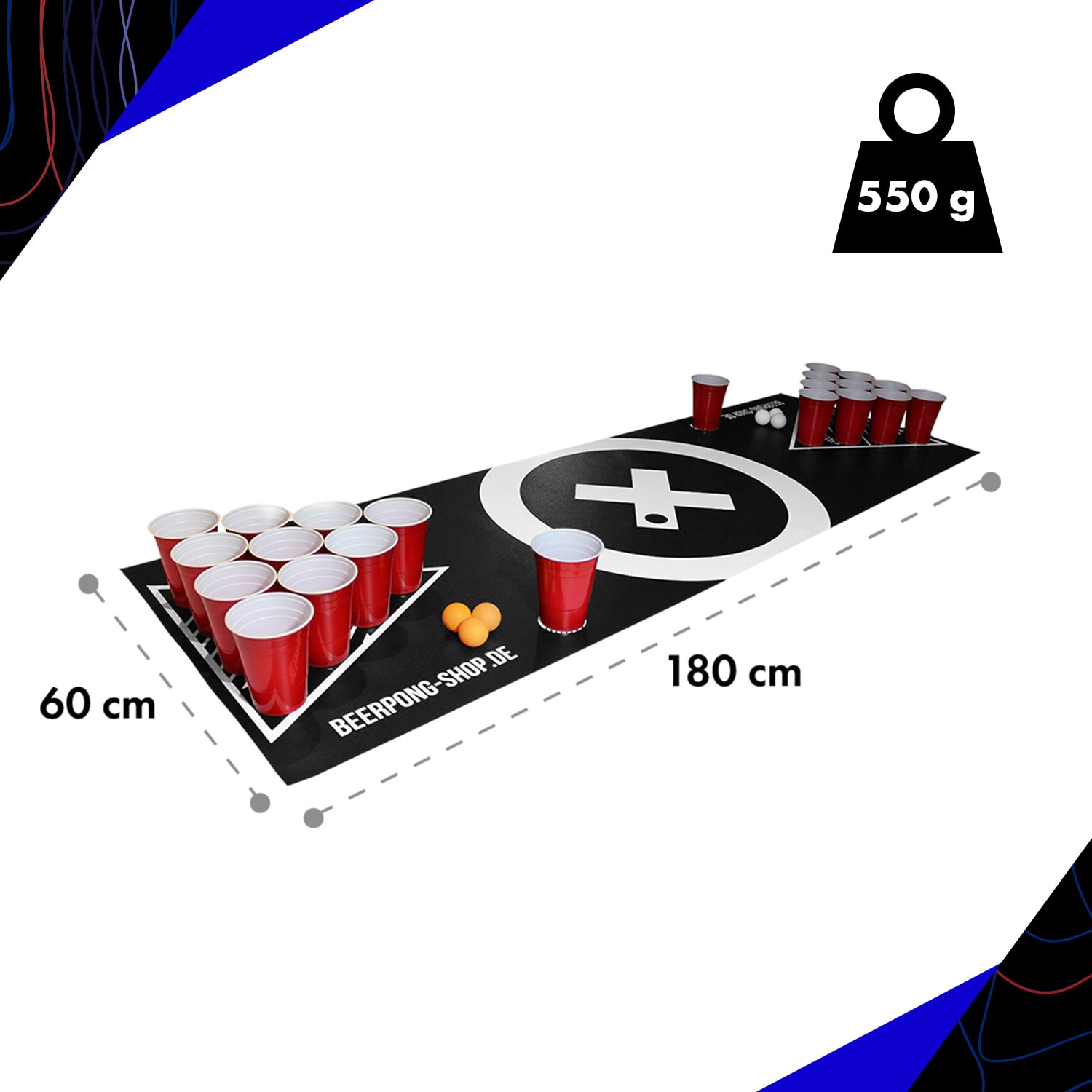 S podložkou s hernou plochou na beer pong Baseliner od spoločnosti BeerCup nie je nuda na žiadnej párty! Pravidelná výzva s priateľmi, turnaje alebo zábava na rozlúčke so slobodou – beer pong je jednoduchá hra pitia a zručnosti, ktorá sa postará o zábavu pri každej príležitosti. Princíp je jednoduchý: ak trafíš pohár súpera, protihráč musí piť! Napínavé variácie tohto základného princípu hry si môžeš prečítať v priložených pravidlách.Naša beerpongová podložka s dizajnom „audio table“ je vyrobená z veľmi kvalitnej PVC tkaniny s rozmermi 180 × 60 cm a umožňuje ti aj z menšieho priestoru vyťažiť 100 % beerpongovej zábavy. Stačí vybaliť, rozvinúť a hra začína. V tejto súprave získaš všetko, čo potrebuješ: červené poháre na pivo, beerpongové loptičky v bielej a oranžovej farbe a tiež náš tlačený súbor pravidiel. Podložka sa zmestí na mnoho bežných stolov a čistí sa veľmi ľahko, rovnako ako všetky naše beerpongové stoly.