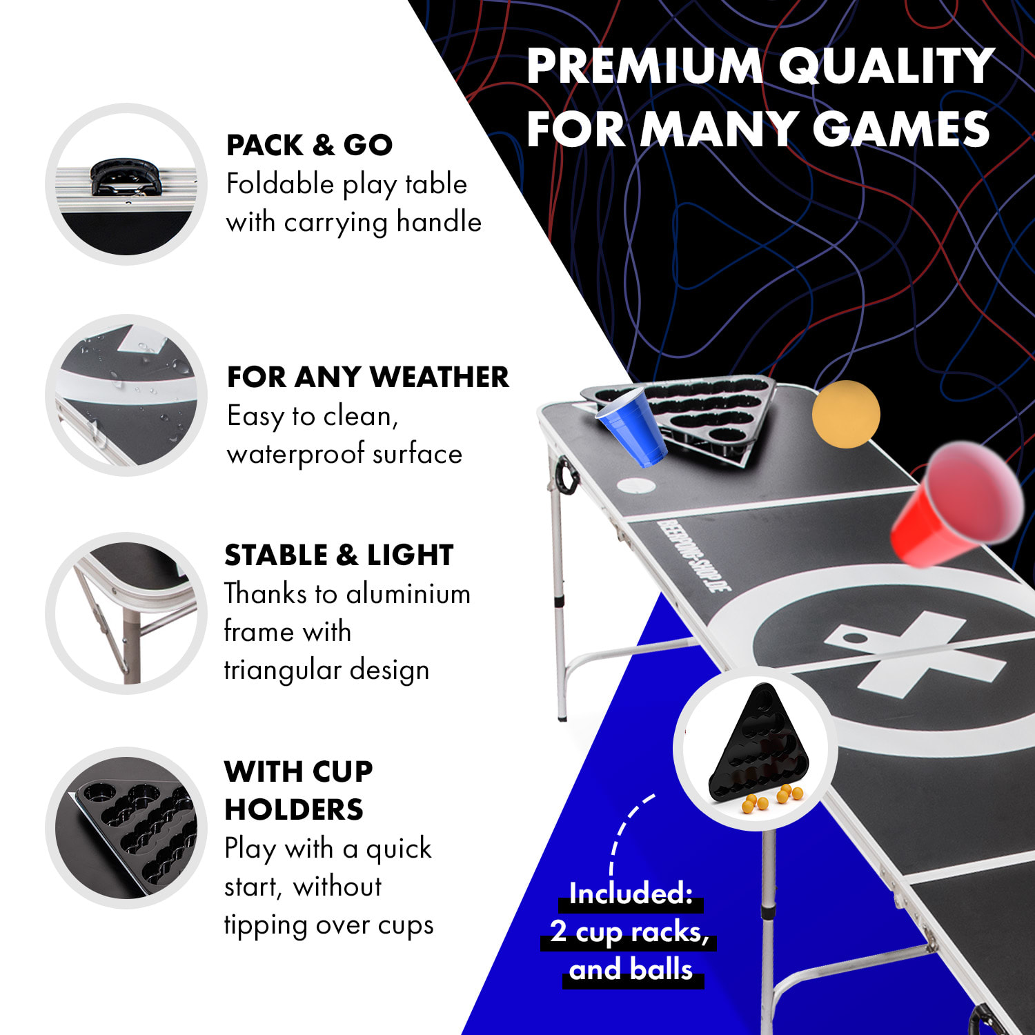 So súpravou so stolom na beer pong Baseliner od spoločnosti BeerCup nie je nuda na žiadnej párty! Pravidelná výzva s priateľmi, turnaje alebo zábava na rozlúčke so slobodou – beer pong je jednoduchá hra pitia a zručnosti, ktorá sa postará o zábavu pri každej príležitosti. Princíp je jednoduchý: Ak trafíš pohár súpera, protihráč musí piť! Napínavé variácie tohto základného princípu hry si môžeš prečítať v priložených pravidlách.Hraj na našich profesionálnych stoloch od spoločnosti BeerCup ako na turnaji „World Series of Beer Pong“ v Las Vegas. Stoly sú výškovo nastaviteľné a zhotovené z pevného hliníka. Za pár sekúnd sú rozložené aj zložené a sú tiež veľmi kvalitné a stabilné. Hracie plochy sú zdokonalené výraznou 2-farebnou potlačou a majú melamínovú povrchovú úpravu odolnú proti vode. V dodávaných beerpongových stojanoch sú navyše poháre perfektne umiestnené, nemôžu sa prevrátiť ani zošmyknúť. Ďalšou zaujímavosťou je integrovaný držiak na loptičky pod stolom, v ktorom je možné skladovať 6 dodávaných loptičiek na beer pong.