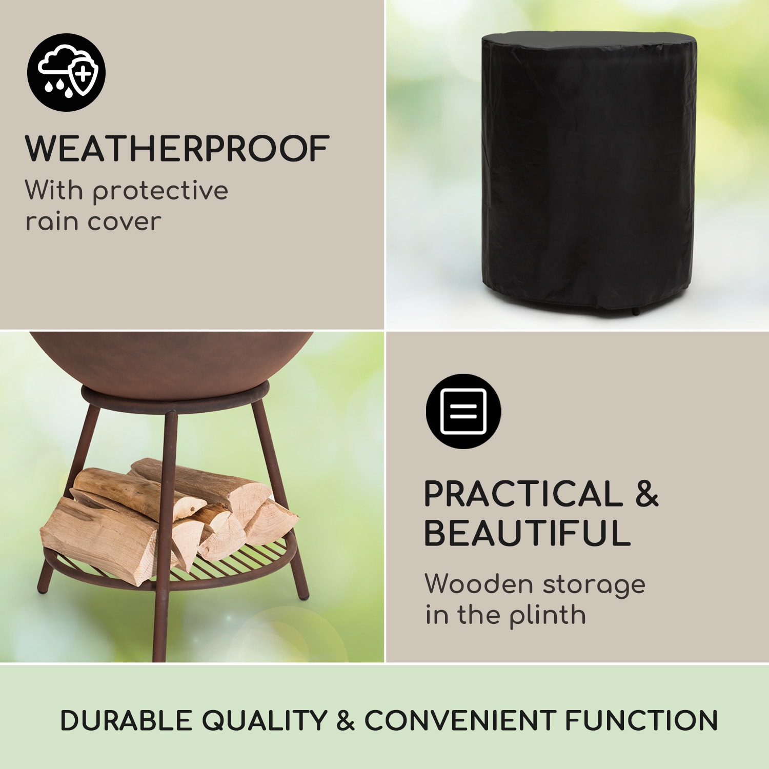 Ohnisko blumfeldt Azuma je gril a romantické ohnisko zároveň – dizajnovo výrazný pútač pozornosti pre vašu záhradu alebo terasu.Zažite všestrannú atmosféru táboráku s výhľadom na hrejivé plamene: Tu môžete grilovať pohodlne v horizontálnej polohe alebo môžete pologuľu nastaviť diagonálne pre hru ohňa chránenú pred vetrom. Ohnisko Azuma od blumfeldt je vďaka svojej 2 mm hrubej oceľovej stene veľmi robustné a bezpečne stojí na vyvýšenom stojane s tromi nožičkami. O pohodlie pri grilovaní, ohrievaní a vychutnávaní sa stará aj spodná polica, na ktorú môžete dekoratívne uložiť potrebné polená. Pre dlhodobú radosť a ochranu ohniska slúži aj kryt pred dažďom a vetrom. Vďaka priloženému pohrabáču a popolníku je jednoduché rozložiť oheň a vychutnávať si pohodové večery.