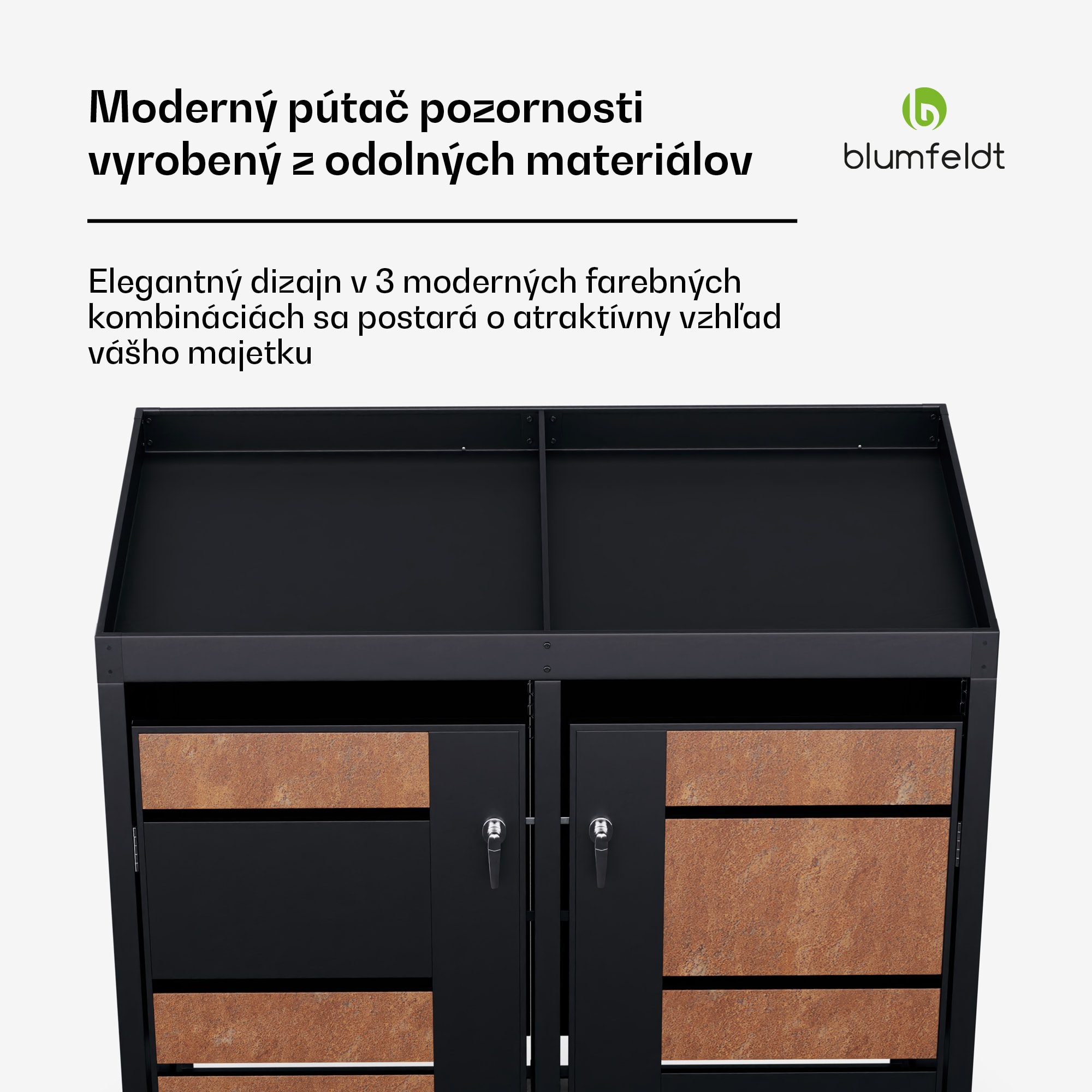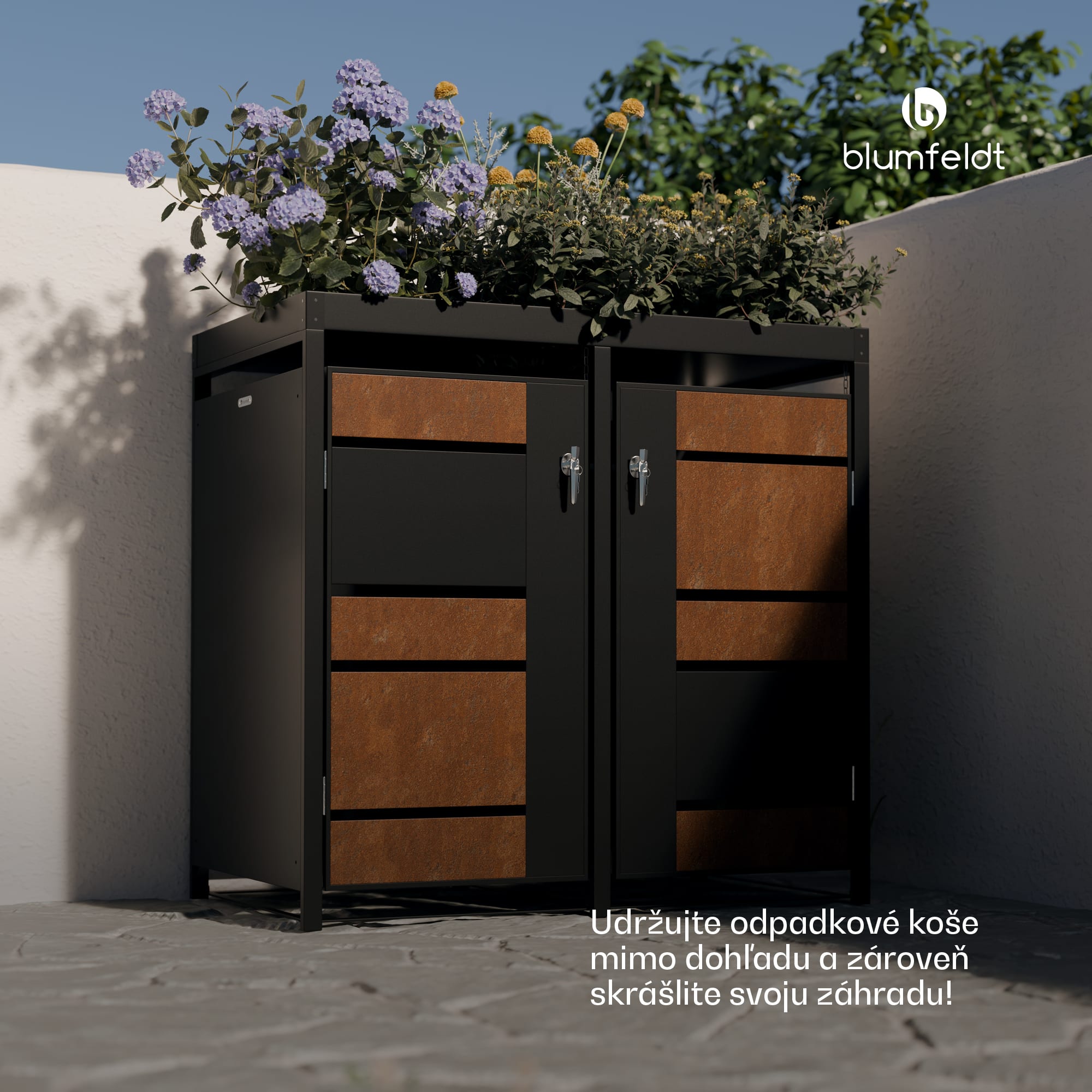 Box na odpadky Blumfeldt BinSafe je elegantným riešením na diskrétne ukrytie 2 odpadkových košov a zároveň vylepšenie vonkajšieho priestoru. S 2 uzamykateľnými dvierkami je ľahko prístupný spredu. Okrem toho box na odpadky s výsadbovou strechou ponúka možnosť ozvláštniť úložný priestor zeleňou. Integrované debničky na rastliny majú odtokové otvory na odvádzanie prebytočnej vody. Moderný dizajn dodá vášmu vonkajšiemu priestoru atraktívny a moderný vzhľad. Box je vyrobený z pozinkovanej ocele odolnej voči poveternostným vplyvom, a preto je mimoriadne trvácny a odolný voči poveternostným vplyvom. Či už ide o 60-litrové, 120-litrové alebo 240-litrové koše, box na odpadky BlumfeldtBinSafe ponúka priestor pre všetky štandardné veľkosti. Vďaka dodaným zámkom s kľúčmi sú vaše koše v bezpečí. Vďaka svojej vysokokvalitnej konštrukcii a praktickým funkciám je box na odpadky Blumfeldt BinSafe ideálnou voľbou na prehľadné uloženie vašich odpadkových košov a dodanie štýlu vášmu vonkajšiemu priestoru.