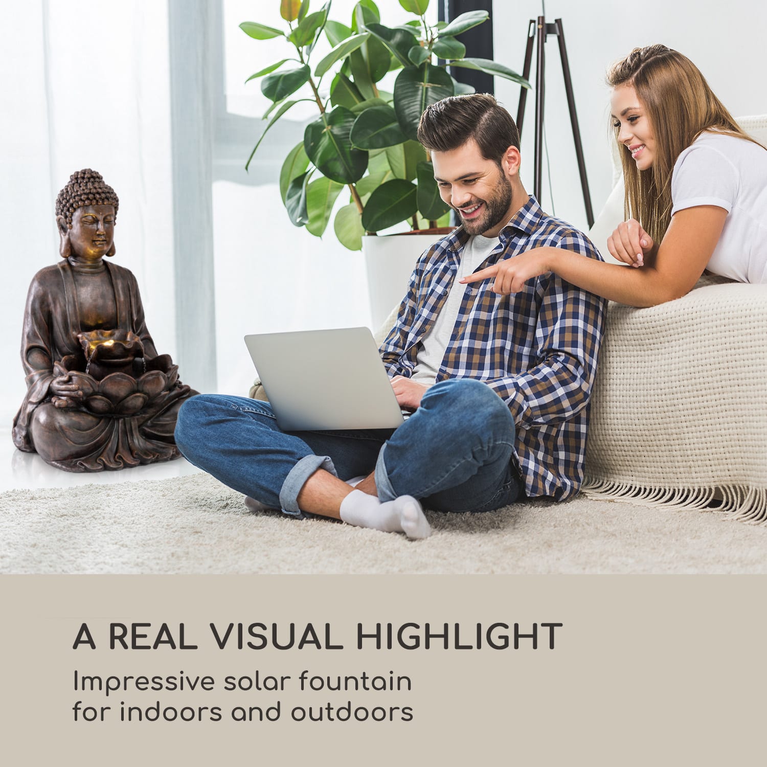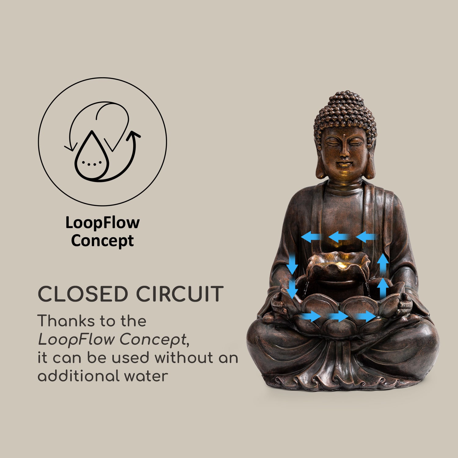 „Dharma“ opisuje Budhovu náuku a zákon existencie. Rovnomenná solárna fontána od spoločnosti blumfeldt ponúka odpočinkové a upokojujúce hodiny s relaxujúcou sochou Budhu.Solárna fontána Dharma je svojimi rozmermi 48 × 71 × 41 cm (Š × V × H) príjemne kompaktná a naplní obývacie priestory aj záhrady harmonickou atmosférou. Vďaka technológii SunRiver Technology je zaručená solárna prevádzka, ktorá je nezávislá od elektrickej siete, čo nielen šetrí náklady na elektrinu, ale tiež uľahčuje nájdenie vhodného umiestnenia fontány. Vďaka decentnému osvetleniu má postava mimoriadny lesk a aj vo večerných a nočných hodinách je estetickým stredobodom okolia. V byte má okrasná fontána okrem relaxačného efektu aj ďalší pozitívny vplyv na zdravie: automaticky zvlhčuje vzduch, zlepšuje vnútorné prostredie a umožňuje dýchať svieži vzduch. Čerpadlo fontány s koncepciou LoopFlow Concept nepretržite udržiava uzavretý kolobeh vody a pracuje príjemne potichu aj v nepretržitej prevádzke. Vďaka vyhotoveniu z pevného polyresinu je záhradná fontána optimálne chránená pred vetrom a počasím. Môže sa preto umiestniť a obdivovať vonku po celý rok.Solárna fontána Dharma od spoločnosti blumfeldt: pokoj a oddych v interiéri aj exteriéri.