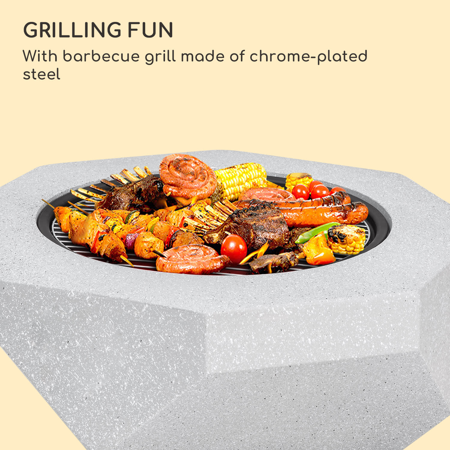 Oheň pod hviezdnou oblohou a pohodlné grilovanie: vychutnajte si neopakovateľnú atmosféru otvoreného ohňa a šťavnaté upečené pochúťky v spoločnosti rodiny a priateľov s ohniskom a grilom v jednom Diamond od blumfeldt.Pútavé ohnisko je vyrobené z robustného a ľahkého MGO (Magnesium Fiberclay) a kvalitného oceľového plášťa. Špeciálny tvar s dizajnom drahých kameňov je skutočnou pastvou pre oči a ideálne sa hodí do každej záhrady. Keď na vrch položíte pochrómovaný oceľový grilovací rošt, pohoda plynúca z plápolajúcich plameňov sa rázom zmení na prskajúce chute grilovaných klobás, steakov, zeleninových špízov alebo dokonca grilovaného syra. Súčasťou balenia je aj praktický ochranný kryt proti iskrám, ktorý chráni všetky okolostojace osoby a okolie pred nekontrolovaným odletom iskier. Vďaka dvom bočným držadlám na prenášanie možno ohnisko s grilom Diamon od blumfeldt kedykoľvek ľahko premiestniť.