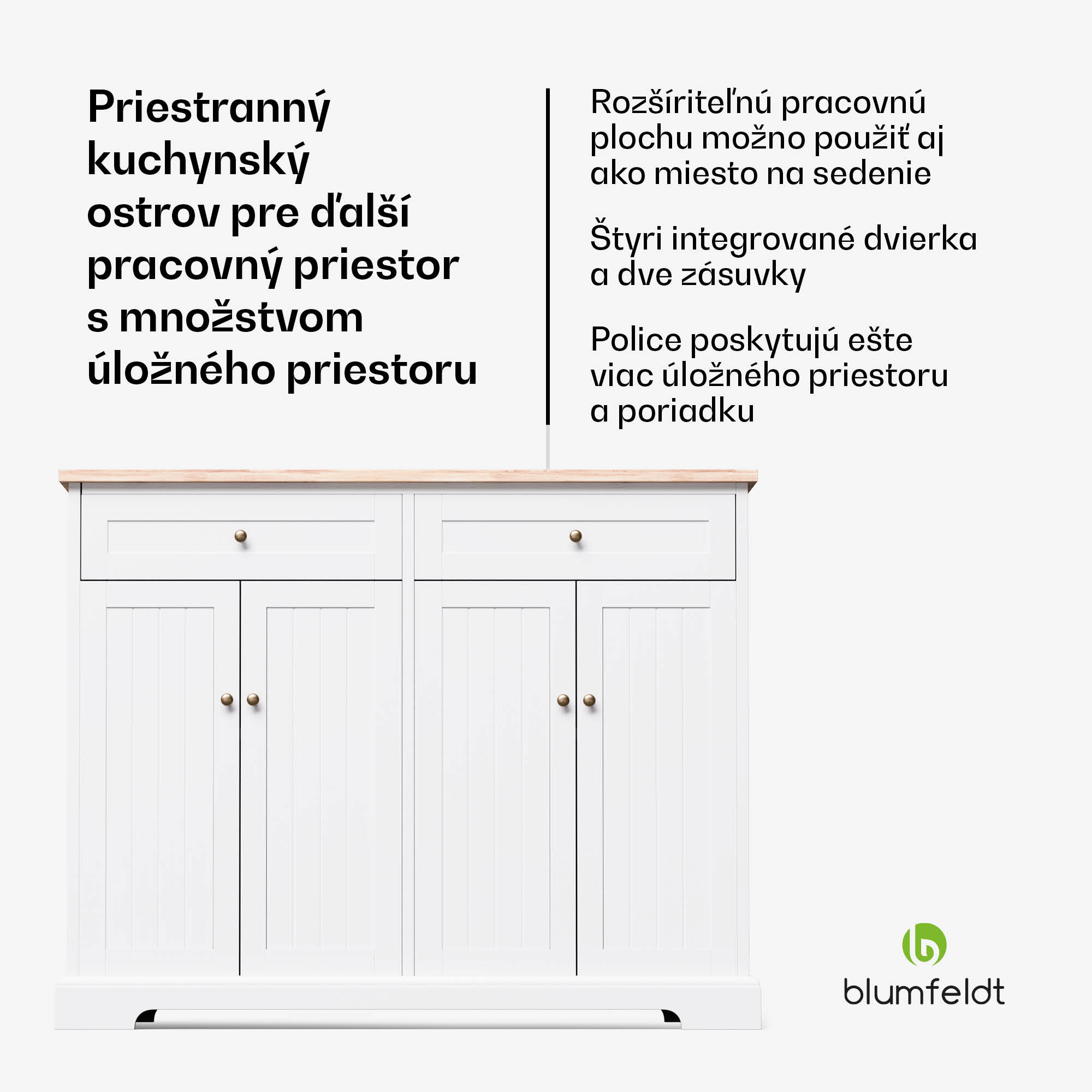 Kuchynský ostrov Blumfeldt Etsu spája funkčnosť s nadčasovou eleganciou a stáva sa ústredným prvkom každej kuchyne. Vďaka veľkorysému dizajnu a inteligentným funkciám ponúka nielen dostatok úložného priestoru, ale aj všestranné možnosti využitia.Vďaka výsuvnej pracovnej doske je kuchynský ostrov ideálny do malých kuchýň, pretože ponúka ďalší priestor na prípravu jedál. 2 zásuvky a 4 dvierka umožňujú organizované ukladanie kuchynského náčinia, zatiaľ čo výsuvnú pracovnú dosku možno využiť aj ako pohodlné sedenie.Nadčasový dizajn kuchynského ostrova kombinuje moderné a tradičné prvky, vďaka čomu sa bez problémov hodí do každej kuchyne. Svetlé farby mu dodávajú vzdušnú a príjemnú atmosféru.Kuchynský ostrov Blumfeldt Etsu je nielen funkčný, ale aj estetický a určite sa stane stredobodom vašej kuchyne. Zakúpte si tento všestranný kus nábytku a zažite dokonalú kombináciu elegancie a funkčnosti!