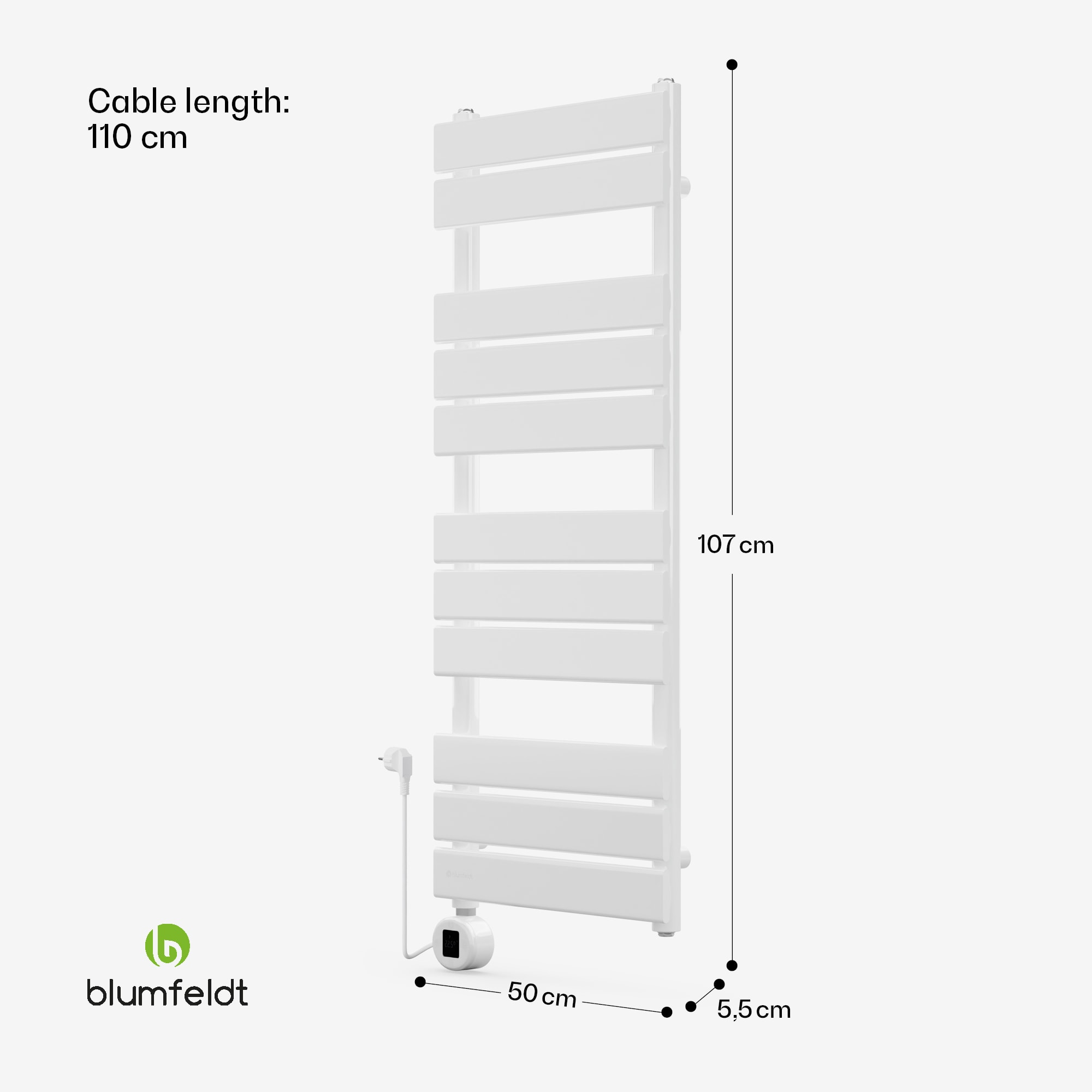 Zažite syntézu maximálneho pohodlia a modernej elegancie s radiátorom blumfeldt Fairmont Smart. Tento elektrický ohrievač uterákov s veľkorysými rozmermi 107 × 50 cm a žiarivou bielou farbou dokonale zapadne do vašej kúpeľne, dodá jej luxusný nádych a zároveň poslúži ako štýlový dizajnový prvok. Jednoduchá montáž na stenu a hmotnosť 12,5 kg robia z ohrievača Fairmont nielen praktický, ale aj estetický doplnok.Inovatívna obsluha pomocou aplikácie umožňuje pohodlné ovládanie a prispôsobené programovanie radiátora blumfeldt Fairmont Smart priamo z vášho smartfónu. Integrovaný termostat zabezpečuje presnú reguláciu teploty, zatiaľ čo funkcia časovača vám umožňuje ovládať radiátor podľa vašich individuálnych potrieb. Zabudovaná detská poistka v termostate dodatočne zabezpečuje kúpeľňu a zaručuje nielen teplo, ale aj bezpečnosť vašej rodiny.
