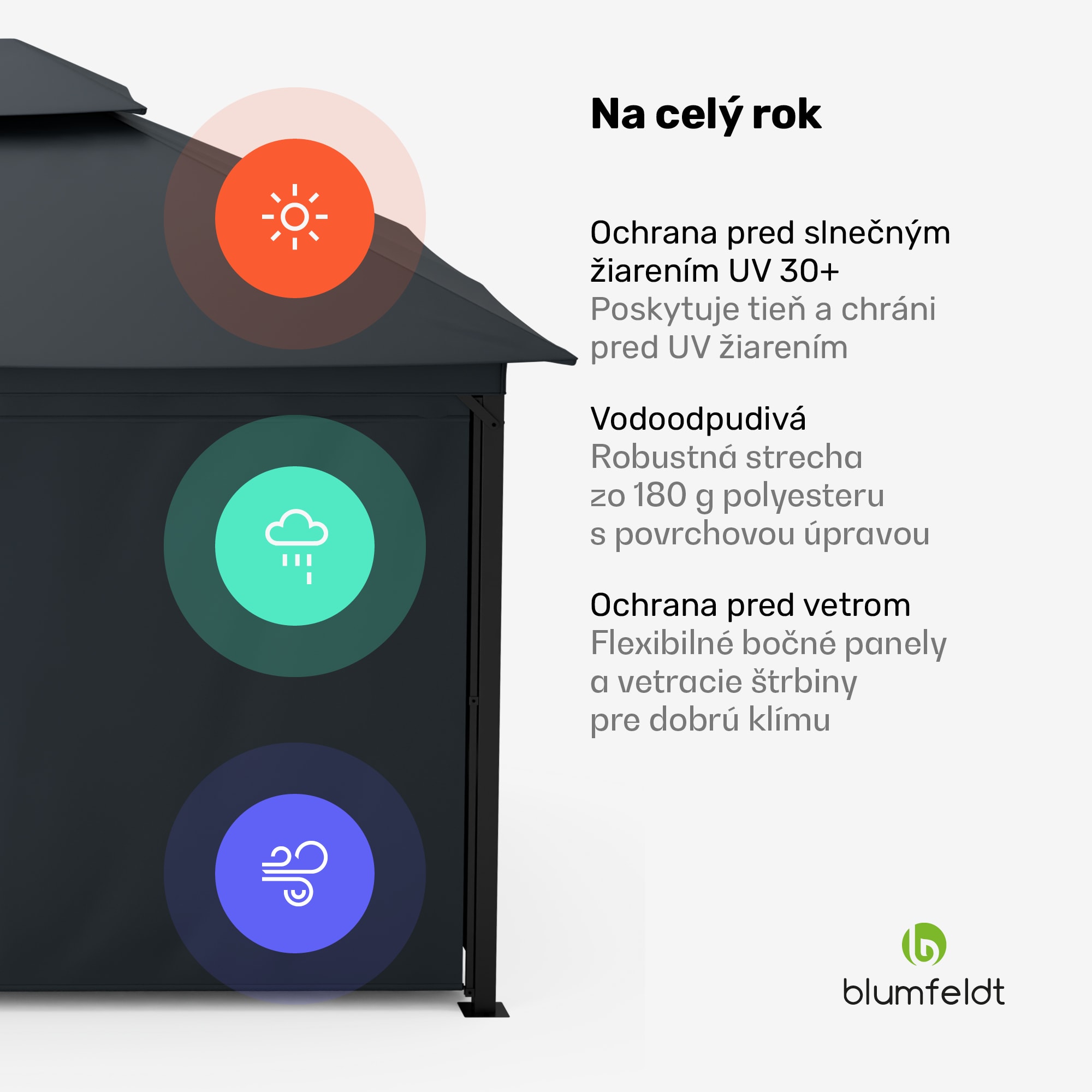 Užite si leto na čerstvom vzduchu – bez ohľadu na počasie! Záhradný altánok blumfeldt Grandezza Cortina je vzdušným tienistým miestom a útočiskom odolným voči poveternostným vplyvom.Strávte príjemné hodiny s priateľmi a rodinou v útulnej idylke na záhrade: Grandezza Cortina so zastrešenou plochou takmer 3 x 4 metre ponúka dostatok priestoru na relax pod sviežou strechou vyrobenou z 180 g/m² polyesteru s vodoodpudivým a proti plesniam odolným náterom. Oceľový rám s hrúbkou 6 x 6 cm zaručuje maximálnu stabilitu a vďaka práškovému lakovaniu je chránený proti korózii.4 flexibilné bočné panely, ktoré sa dajú individuálne otvárať a zatvárať pomocou pohodlného rolovacieho a sťahovacieho mechanizmu a sú vyrobené z umývateľného polyesteru, sú obzvlášť užitočné, keď je slnko, vietor alebo dážď. Pri montáži konštrukcie je vhodné dbať na to, aby boli nohy ukotvené najmä zvisle v zemi, aby sa zaistil rovnomerný proces navíjania a odvíjania bez krčenia.Poskytuje tieň počas horúcich letných dní a spoľahlivú ochranu pred vetrom a dažďom: záhradný altánok Grandezza Cortina od spoločnosti blumfeldt.