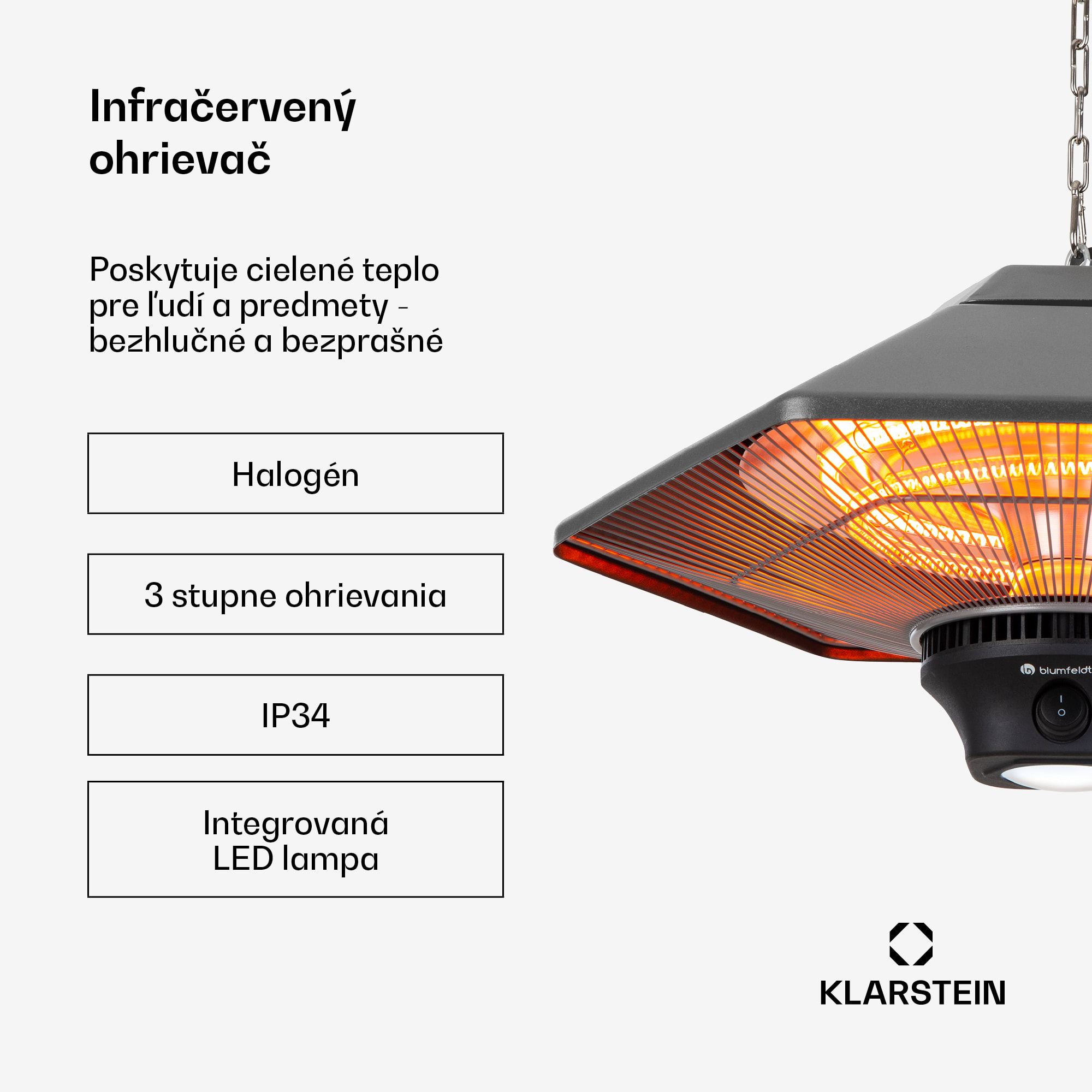 Aby bolo teplo všade: infračervený ohrievač blumfeldt Heat Hexa prináša jemné teplo na balkón a terasu pre pohodlie na čerstvom vzduchu aj počas chladných dní a nocí.Keď klesnú teploty, jednoducho stlač tlačidlo a zapni stropný ohrievač, zvoľ požadovanú úroveň tepla a vdýchni nový život každej párty. Infračervený stropný ohrievač blumfeldt Heat Hexa pritom nielen spoľahlivo poskytuje teplo, ale tiež jasne osvetľuje priestor na sedenie aj stoly.Ohrievač blumfeldt Heat Hexa sa nekomplikovane zavesí na strop reťazou s dĺžkou 50 cm a rýchlo a efektívne poskytne tebe aj tvojim hosťom až do 2000 W vykurovacieho výkonu. Systém IR ComfortHeat nielen že dodáva teplo veľmi rýchlo, ale odovzdáva ho vďaka svojmu vysoko účinnému hliníkovému reflektoru a dlhovlnnému infračervenému žiareniu cielene na osoby a objekty v jeho blízkosti bez zohrievania vzduchu. Uži si príjemné teplo od prvej sekundy! Jemným stlačením integrovaného dotykového panela si môžeš v priebehu pár sekúnd vybrať spomedzi troch úrovní tepla – 800 alebo 1200 W, vďaka čomu je ľahké reagovať na potreby tvojich hostí. Alebo môžeš ovládať tepelné svetlo pohodlne pomocou diaľkového ovládača. Naplánuj si bezstarostne večerné jedlo na balkóne alebo na terase bez obáv o teploty, pretože bezprostredne po zapnutí vytvoria halogénové vykurovacie prvky príjemné, domáce a bezpečné teplo bez dlhého zahrievania zariadenia. Šesťhranný infračervený ohrievač blumfeldt Heat Hexa je vyrobený z ocele, takže je nielen robustný, ale aj elegantný na pohľad. Jeho integrovaná LED lampa môže byť zapnutá samostatne a postarať sa o svetlo v tmavých hodinách. Pre bezpečné používanie v exteriéri je konštrukcia odolná proti striekajúcej vode podľa štandardu IP34 a bez problémov ju môžete použiť aj počas vlhkých večerov.Oslavujte až do neskorej noci, užívajte si čas s priateľmi alebo strávte romantický večer pri víne a sviečkach na terase. Terasový ohrievač blumfeldt Heat Hexa vždy poskytuje požadované teplo.Upozornenie: Ohrievač je určený iba na použitie vo vonkajšom prostredí.