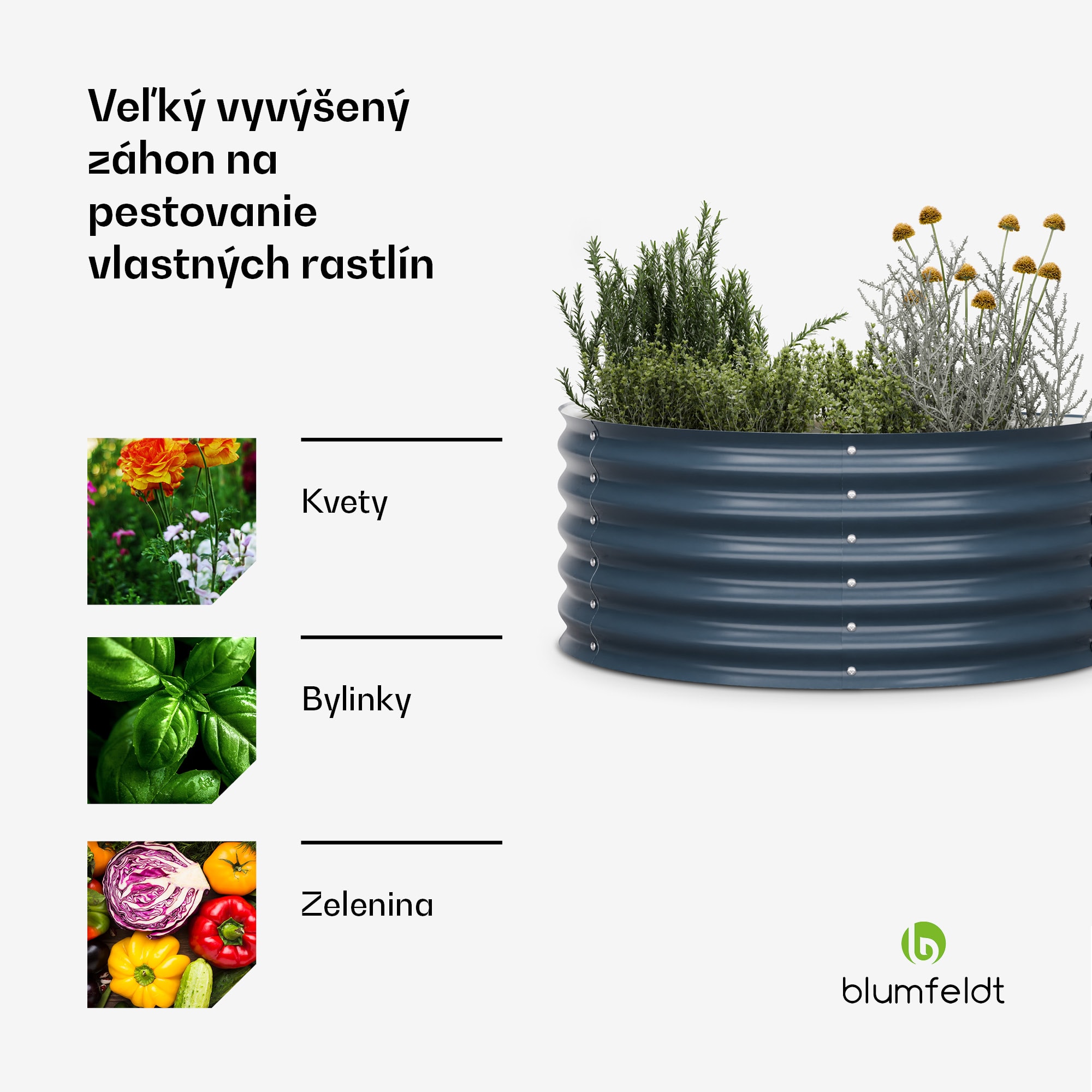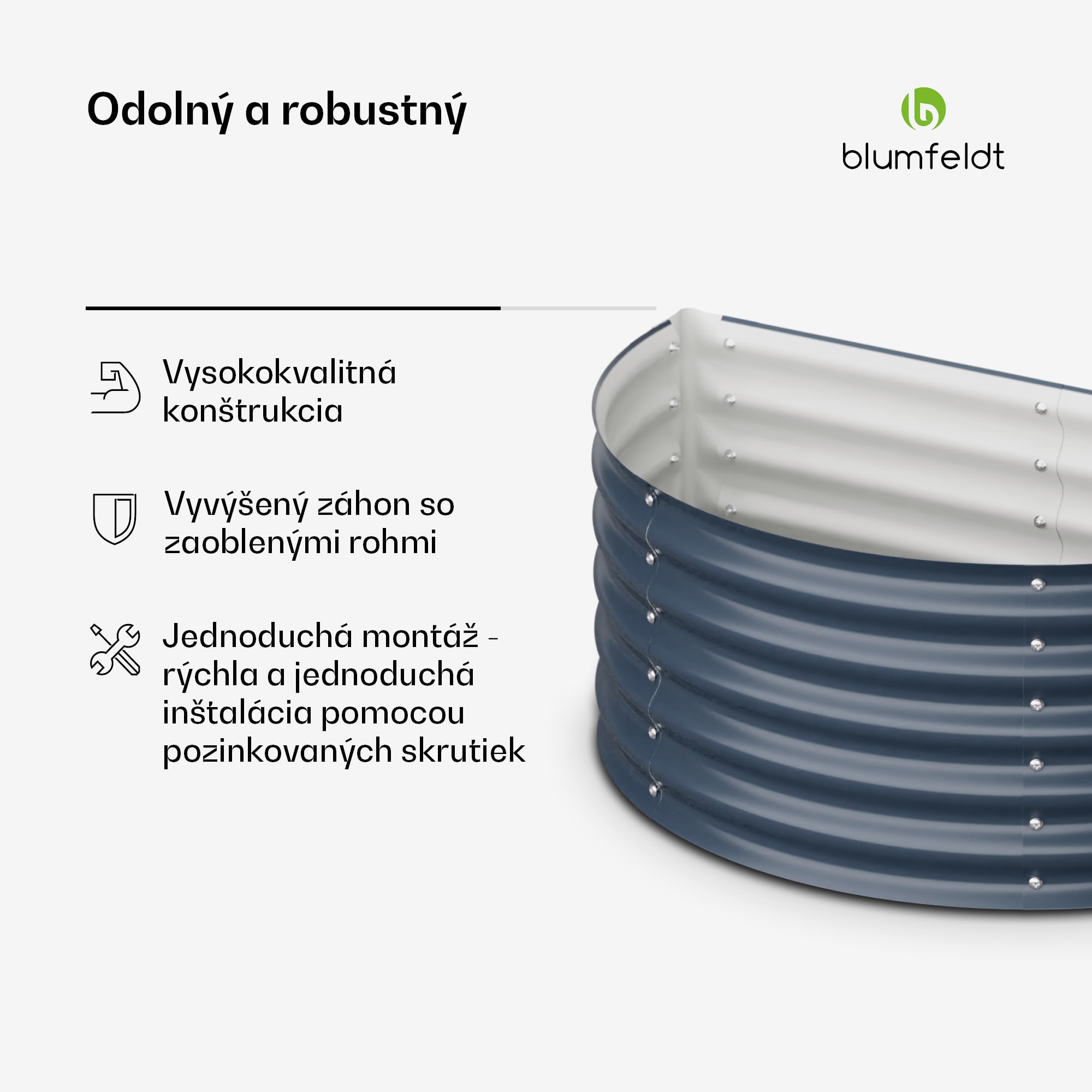 Chutné, čerstvé a z vlastného záhona: S vyvýšeným záhonom blumfeldt High Grow Half Circle máte ešte viac priestoru na to, aby ste si sami vypestovali svoju dennú porciu zeleniny a premenili terasy, dvory alebo predzáhradky na zelené oázy. Pestovanie šťavnatých paradajok, sladkých jahôd, chrumkavých cukiet a aromatických byliniek je vďaka optimálnym pestovateľským podmienkam hračka. Jednoročné rastliny a celoročné záhradnícke pôžitky: Stabilná rámová konštrukcia záhradného záhonu blumfeldt je vyrobená z vlnitej ocele a je odolná voči hrdzi a mrazu vďaka špeciálnej zliatine zinku. High Grow odoláva vetru a počasiu po celý rok. Vďaka polkruhovému tvaru je okrasný vyvýšený záhon od blumfeldt stabilný a zároveň je vizuálnym pútačom po celý rok.Farebná pastva pre oči a zdravá pochúťka: Blumfeldt High Grow Half Circle vytvára optimálne rastové podmienky. To umožňuje relatívne vyššie výnosy ako u plochých záhonov. Pohodlie v stoji a predovšetkým šetrnosť k vášmu chrbtu robí záhradkárčenie oveľa príjemnejším. Pohodlná pracovná výška 60 cm je mimoriadne praktická aj pre deti. To znamená, že aj tí najmenší môžu pomáhať pri sadení, polievaní a zbere. Napriek tomu pre škodcov, akými sú slimáky, zostáva záhon neprekonateľnou bariérou.Čas urobiť niečo užitočné: S okrasným vyvýšeným záhonom blumfeldt High Grow Half Circle môže každý objaviť svoju zelenú záľubu.