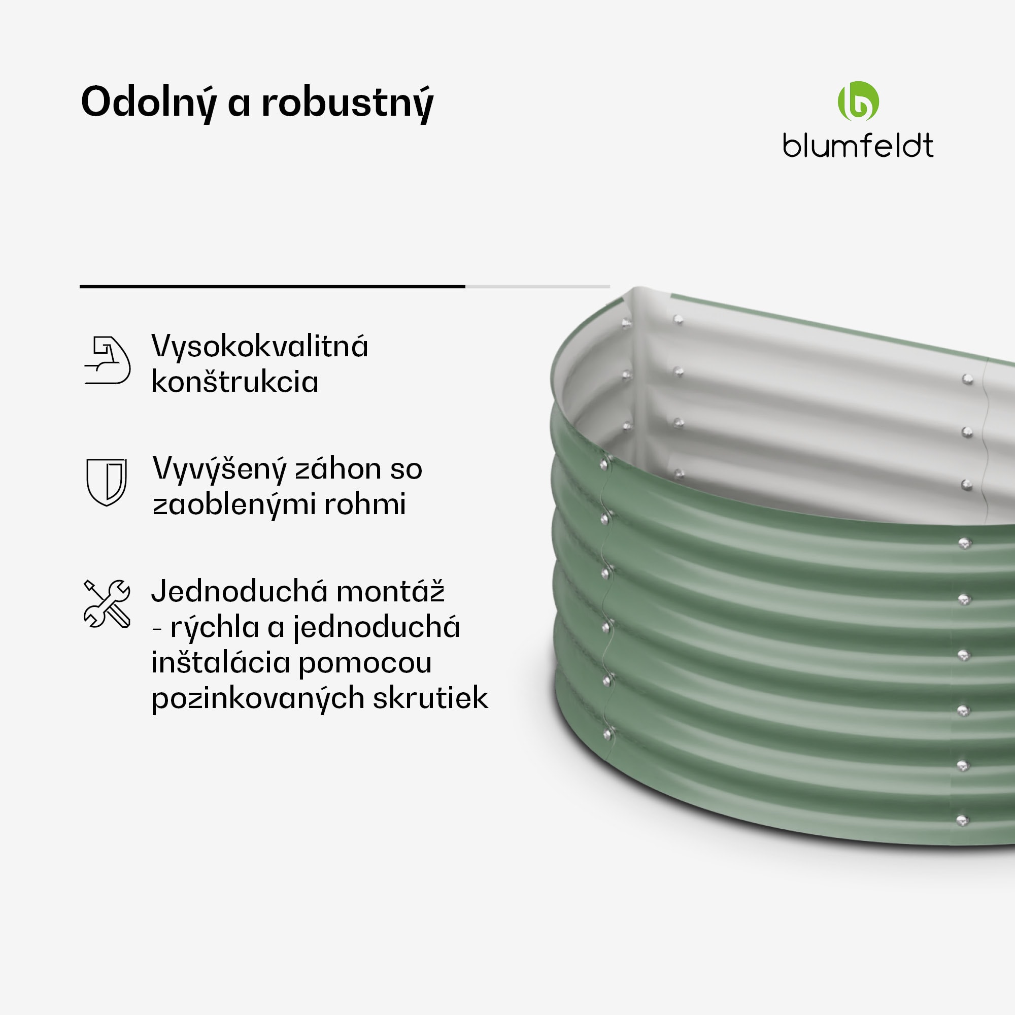 Chutné, čerstvé a z vlastného záhona: S vyvýšeným záhonom blumfeldt High Grow Half Circle máte ešte viac priestoru na to, aby ste si sami vypestovali svoju dennú porciu zeleniny a premenili terasy, dvory alebo predzáhradky na zelené oázy. Pestovanie šťavnatých paradajok, sladkých jahôd, chrumkavých cukiet a aromatických byliniek je vďaka optimálnym pestovateľským podmienkam hračka. Jednoročné rastliny a celoročné záhradnícke pôžitky: Stabilná rámová konštrukcia záhradného záhonu blumfeldt je vyrobená z vlnitej ocele a je odolná voči hrdzi a mrazu vďaka špeciálnej zliatine zinku. High Grow odoláva vetru a počasiu po celý rok. Vďaka polkruhovému tvaru je okrasný vyvýšený záhon od blumfeldt stabilný a zároveň je vizuálnym pútačom po celý rok.Farebná pastva pre oči a zdravá pochúťka: Blumfeldt High Grow Half Circle vytvára optimálne rastové podmienky. To umožňuje relatívne vyššie výnosy ako u plochých záhonov. Pohodlie v stoji a predovšetkým šetrnosť k vášmu chrbtu robí záhradkárčenie oveľa príjemnejším. Pohodlná pracovná výška 60 cm je mimoriadne praktická aj pre deti. To znamená, že aj tí najmenší môžu pomáhať pri sadení, polievaní a zbere. Napriek tomu pre škodcov, akými sú slimáky, zostáva záhon neprekonateľnou bariérou.Čas urobiť niečo užitočné: S okrasným vyvýšeným záhonom blumfeldt High Grow Half Circle môže každý objaviť svoju zelenú záľubu.