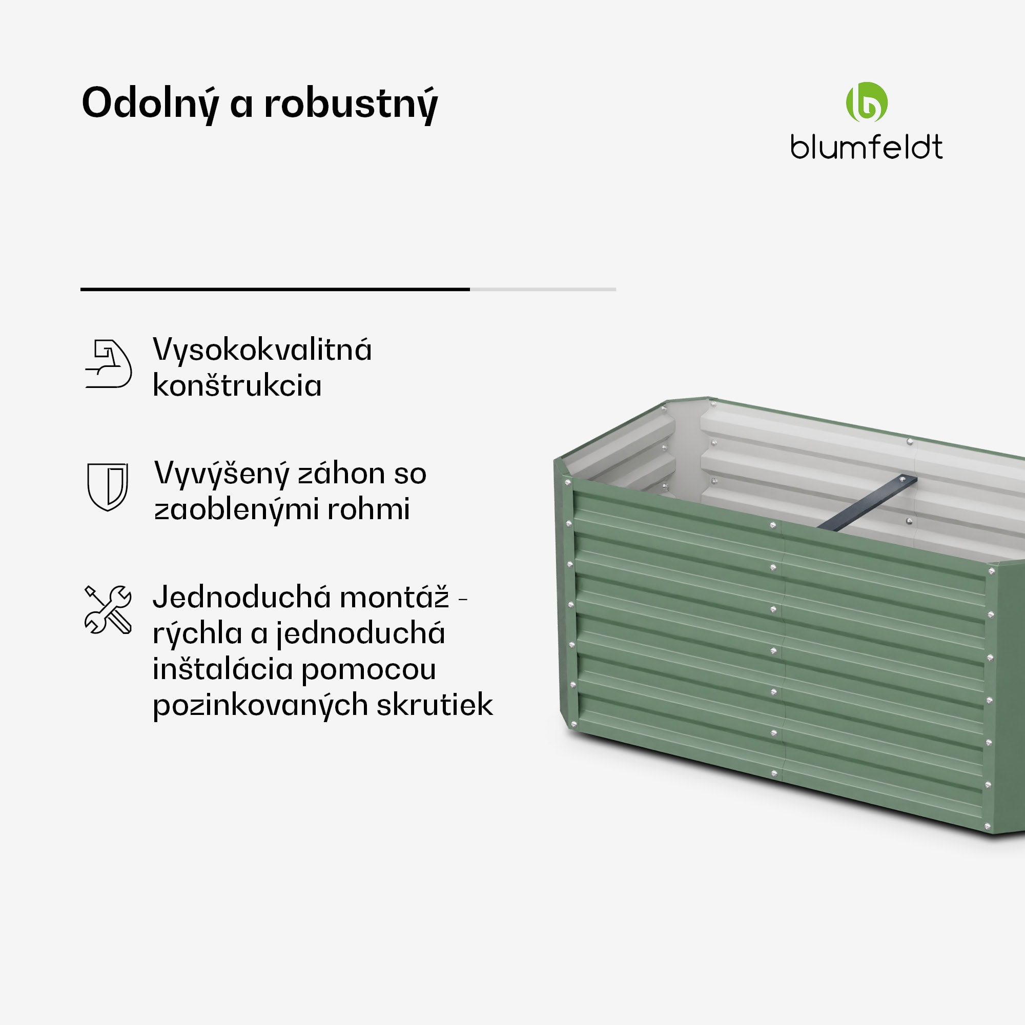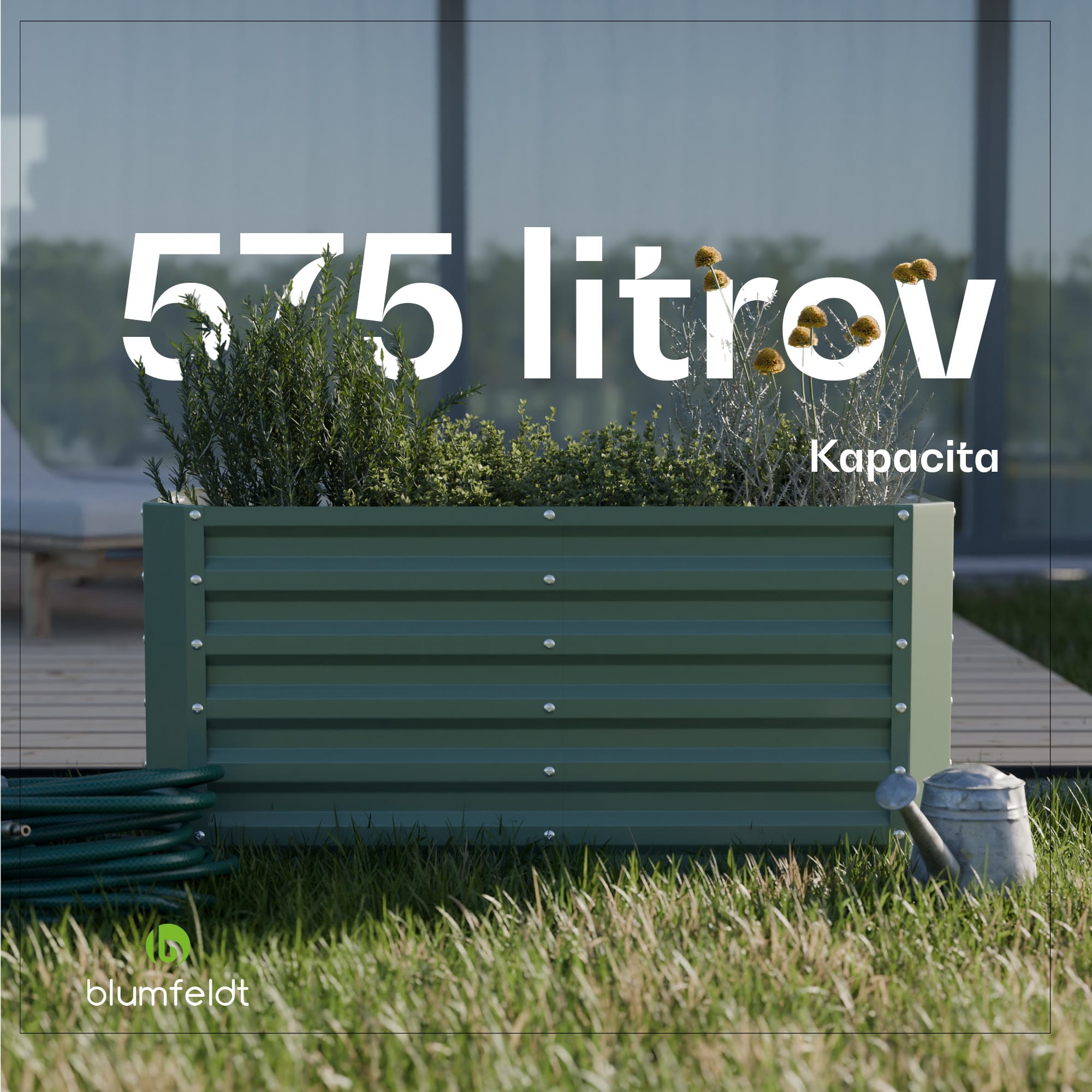 Chutné, čerstvé a z vlastného záhona: S vyvýšeným záhonom blumfeldt High Grow Straight máte ešte viac priestoru na to, aby ste si sami vypestovali svoju dennú porciu zeleniny a premenili terasy, dvory alebo predzáhradky na zelené oázy. Tento okrasný vyvýšený záhon je ideálny pre každého záhradkára.Pestovanie šťavnatých paradajok, sladkých jahôd, chrumkavých cukiet a aromatických byliniek je vďaka optimálnym pestovateľským podmienkam hračka. Jednoročné rastliny a celoročné záhradnícke pôžitky: Stabilná rámová konštrukcia záhradného záhonu blumfeldt je vyrobená z vlnitej ocele a je odolná voči hrdzi a mrazu vďaka špeciálnej zliatine zinku. High Grow odoláva vetru a počasiu po celý rok.Farebná pastva pre oči a zdravá pochúťka: Blumfeldt High Grow Straight vytvára optimálne rastové podmienky. To umožňuje relatívne vyššie výnosy ako u plochých záhonov. Pohodlie v stoji a predovšetkým šetrnosť k vášmu chrbtu robí záhradkárčenie oveľa príjemnejším. Pohodlná pracovná výška 60 cm je mimoriadne praktická aj pre deti. To znamená, že aj tí najmenší môžu pomáhať pri sadení, polievaní a zbere. Napriek tomu pre škodcov, akými sú slimáky, zostáva záhon neprekonateľnou bariérou. Do vyvýšeného záhonu s objemom 575 litrov možno pridať množstvo vrstiev humusu, takže sa dá použiť aj priamo ako kompostér: Jednoducho umiestnite zelený odpad medzi vrstvy pôdy – to nielen priláka dážďovky, ktoré pôdu kypria, ale aj trvalo zásobuje záhon čerstvými živinami.Čas urobiť niečo užitočné: S okrasným vyvýšeným záhonom blumfeldt High Grow Straight môže každý objaviť svoju zelenú záľubu.