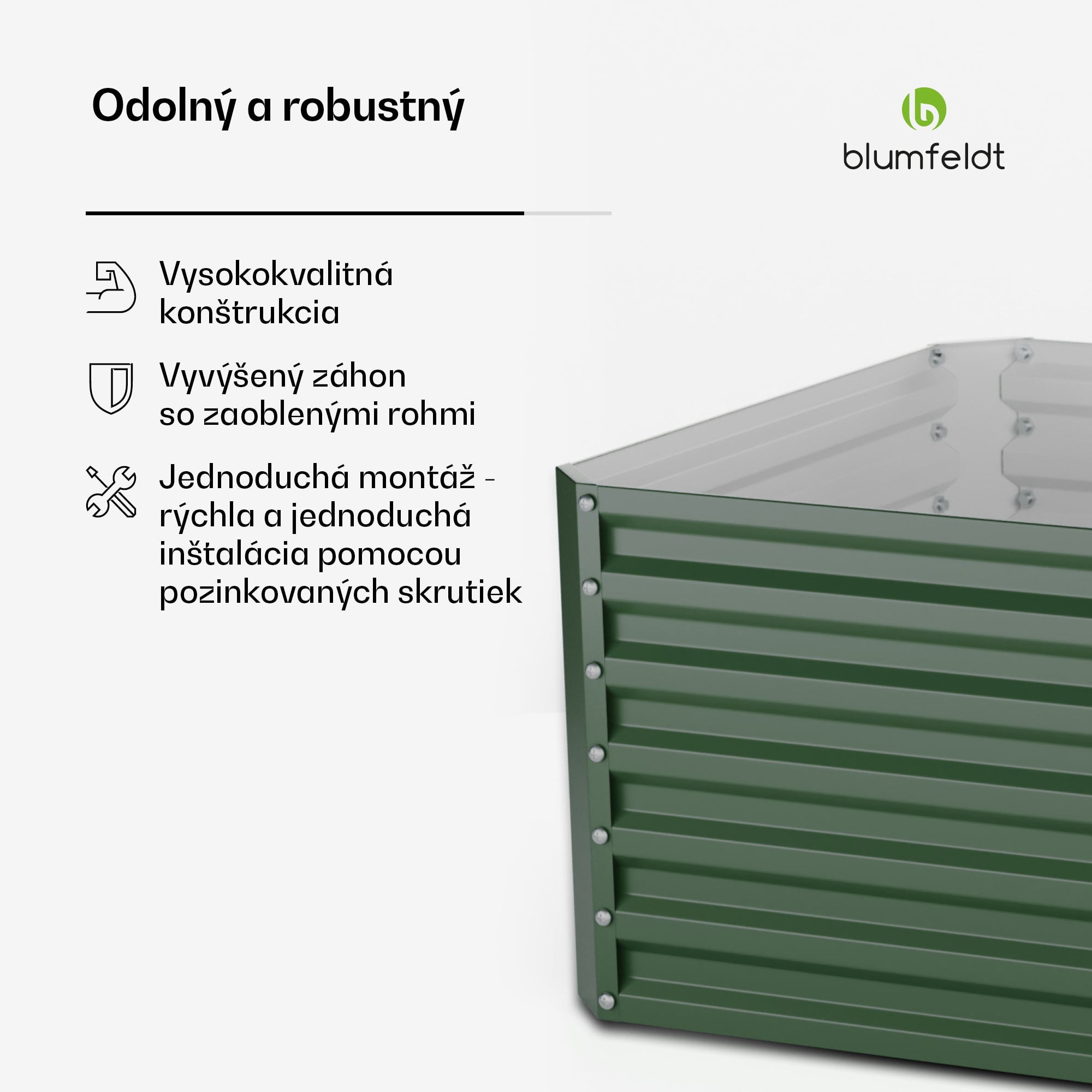 Vyvýšený záhon Blumfeldt High Grow Straight umožňuje ergonomické, odolné a udržateľné záhradkárčenie. S objemom 1200 litrov ponúka dostatok priestoru na kvety, bylinky alebo zeleninu.Vyvýšený záhon Blumfeldt High Grow Straight zaujme svojím premysleným obĺžnikovým tvarom a veľkorysým objemom 1200 litrov, vďaka ktorému môžete realizovať rôzne pestovateľské nápady. Je vyrobený z robustnej galvanizovanej ocele, odoláva všetkým poveternostným podmienkam a poskytuje spoľahlivú ochranu proti hrdzi a korózii – ideálny na celoročné používanie v exteriéri. Otvorené dno zlepšuje odvodnenie a podporuje rast koreňov, takže rastliny sú optimálne zásobované živinami. Vyvýšený tvar umožňuje ergonomickú prácu, ktorá minimalizuje namáhanie chrbta a znižuje potrebu ohýbať sa pri sadení a ošetrovaní. Vďaka premyslenej konštrukcii a sklopným bezpečnostným rohom je vyvýšený záhon mimoriadne bezpečný a ľahko sa montuje, takže je vhodný pre začiatočníkov aj skúsených záhradkárov.Dajte priechod svojej kreativite a zažite bezstarostné záhradkárčenie – objavte okrasný vyvýšený záhon Blumfeldt High Grow Straight už teraz!