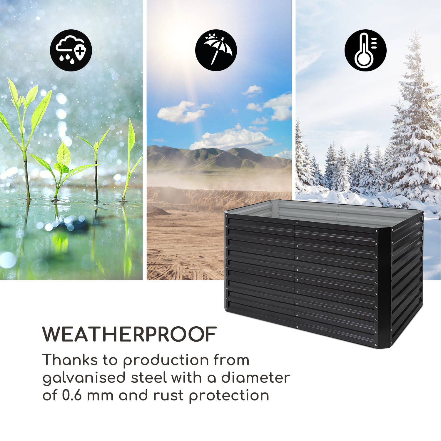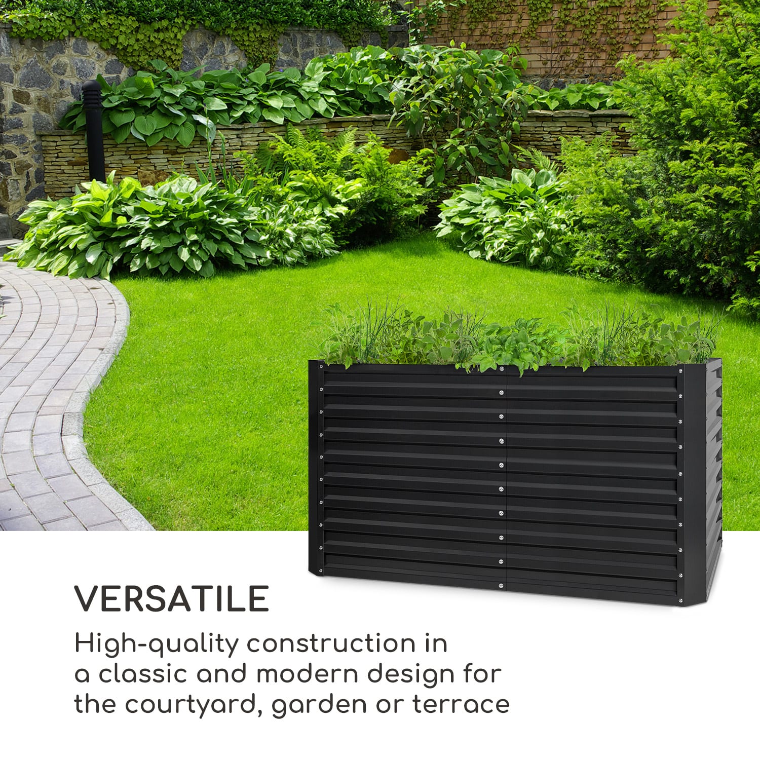 Chutne, čerstvo a z vlastného záhonu: s vyvýšeným záhonom blumfeldt High Grow Straight si svoje denné porcie zeleniny dopestujete sami a terasy, dvory alebo záhradky sa premenia na zelené oázy. Tento okrasný vyvýšený záhon nielenže skrášli váš priestor, ale aj poskytne ideálne podmienky pre pestovanie.Pretože šťavnaté paradajky, sladké jahody, chrumkavé cukety a aromatické bylinky sa dajú jednoducho vypestovať vďaka optimálnym podmienkam rastu. Pevná rámová konštrukcia vyvýšeného záhona je vyrobená z pozinkovanej ocele s ochranou proti hrdzi a tým je chránený pred poveternostnými vplyvmi. Vďaka tomu odoláva High Grow Straight vetru a počasiu po celý rok. 4 hliníkové ochranné lišty okrem toho zabezpečujú maximálnu stabilitu celej konštrukcie.Pestré potešenie a zdravé pochúťky: s blumfeldt High Grow Straight budú dosiahnuté optimálne podmienky rastu. Umožňuje to pomerne vyššie výnosy ako ploché záhony. Záhradníci sa potešia z pohodlia pri státí a z ochrany svojho chrbta. Pracovná výška 90 cm sa okrem toho ukazuje ako prekážka pre škodcov, akými sú slimáky. Pri objeme 1800 litrov je možné umiestniť do vyvýšeného záhonu viaceré humusové vrstvy, takže ho hneď možno využiť aj ako kompostér: stačí len vložiť medzi vrstvy zeme zelený odpad – to priláka nielen pôdu prekyprujúce dážďovky, ale tiež sa tým trvalo poskytujú záhonu čerstvé živiny.Čas všetko urýchliť: S vyvýšeným záhonom blumfeldt High Grow Straight môže každý objaviť svoj záhradnícky talent.
