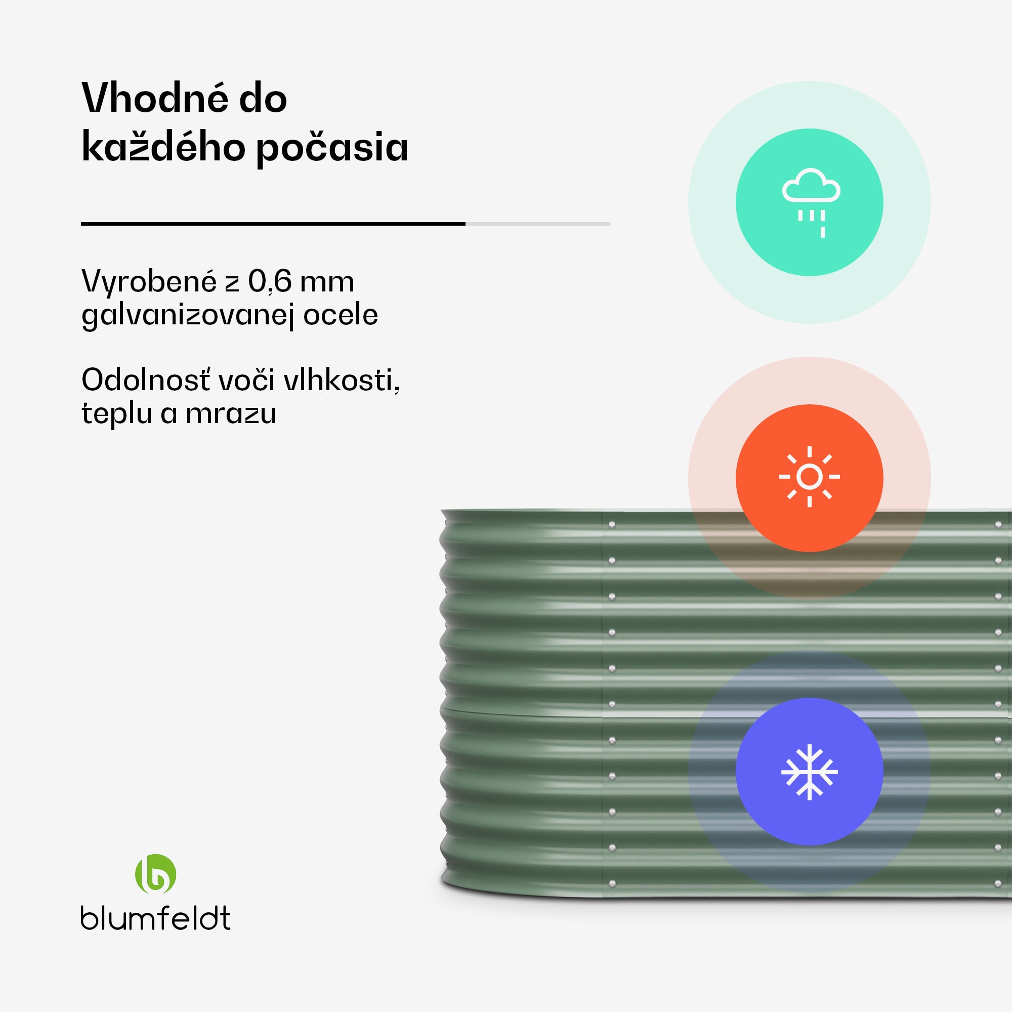 Chutné, čerstvé a z vlastného záhona: S vyvýšeným záhonom blumfeldt High Grow máte ešte viac priestoru na to, aby ste si sami vypestovali svoju dennú porciu zeleniny a premenili terasy, dvory alebo predzáhradky na zelené oázy. Tento okrasný vyvýšený záhon je ideálny pre každého záhradkára.Pestovanie šťavnatých paradajok, sladkých jahôd, chrumkavých cukiet a aromatických byliniek je vďaka optimálnym pestovateľským podmienkam hračka. Jednoročné rastliny a celoročné záhradnícke pôžitky: Stabilná rámová konštrukcia záhradného záhonu blumfeldt je vyrobená z vlnitej ocele a je odolná voči hrdzi a mrazu vďaka špeciálnej zliatine zinku. High Grow odoláva vetru a počasiu po celý rok.Farebná pastva pre oči a zdravá pochúťka: Blumfeldt High Grow vytvára optimálne rastové podmienky. To umožňuje relatívne vyššie výnosy ako u plochých záhonov. Pohodlie v stoji a predovšetkým šetrnosť k vášmu chrbtu robí záhradkárčenie oveľa príjemnejším. Zaoblené rohy zabezpečujú ľahký prístup k záhonu. Pracovná výška 80 cm je prekážkou aj pre škodcov, ako sú slimáky.Čas urobiť niečo užitočné: S orasným vyvýšeným záhonom blumfeldt High Grow môže každý objaviť svoju zelenú záľubu.