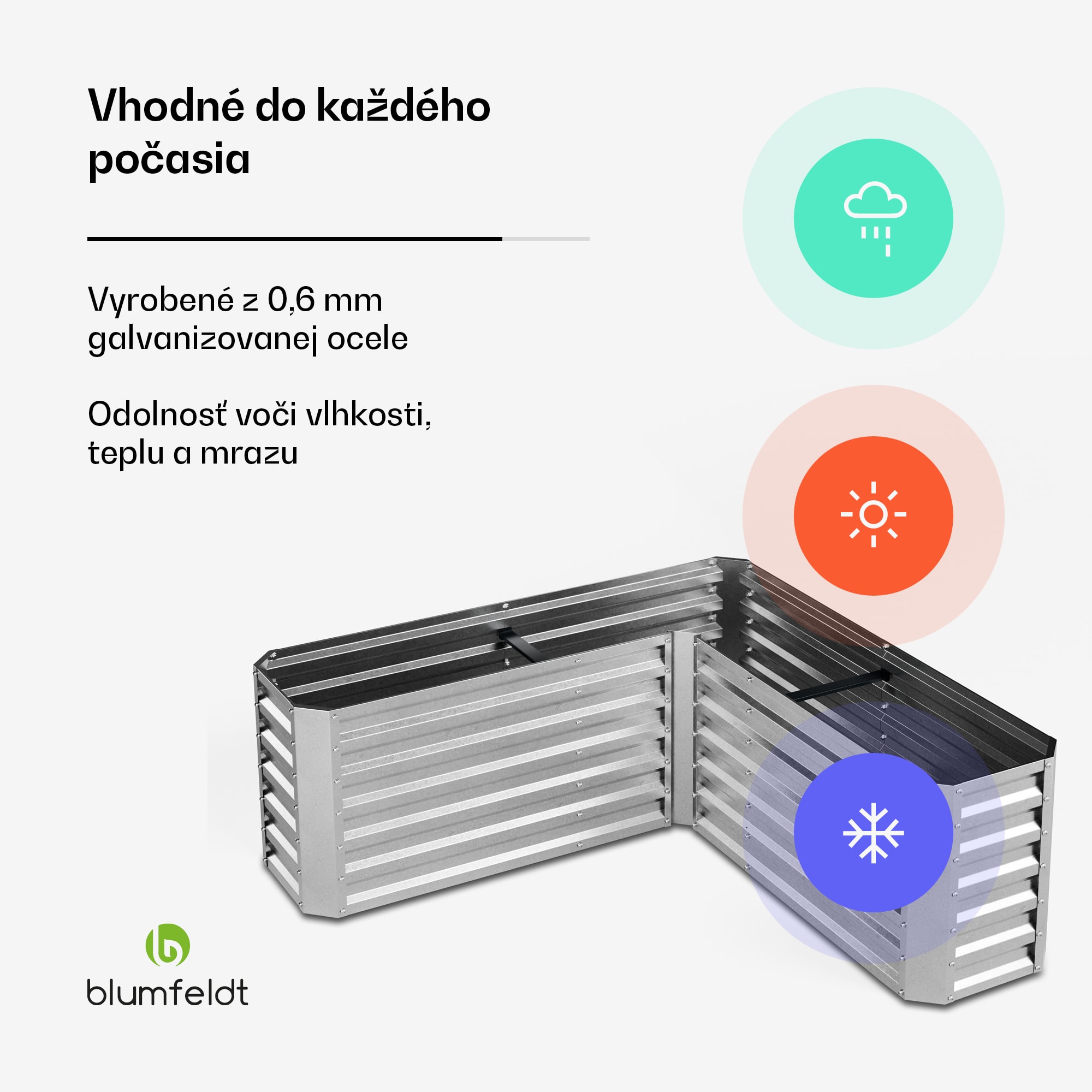 Vyvýšený záhon Blumfeldt High Grow v tvare písmena L kombinuje veľkorysý pestovateľský priestor s odolnou konštrukciou odolnou voči poveternostným vplyvom, ktorá je ideálna na efektívne využitie záhradných zákutí a zdravé pestovanie rastlín. Tento okrasný vyvýšený záhon je nielen funkčný, ale aj esteticky príťažlivý.Vyvýšený záhon Blumfeldt v tvare písmena L s rozmermi 160 x 160 cm ponúka veľký objem 742 litrov, ktorý je ideálny na maximálne využitie zákutí v záhrade. Je vyrobený z robustnej galvanizovanej ocele s hrúbkou 0,6 mm, odoláva každému počasiu a poskytuje dlhodobú ochranu proti hrdzi a korózii. Otvorená základňa umožňuje ideálnu drenáž a nerušený rast koreňov, vďaka čomu môžu rastliny účinne prijímať živiny z pôdy. Vyvýšená konštrukcia záhonu uľahčuje prácu v záhrade, pretože minimalizuje ohýbanie, a preto je nenáročná na chrbát. Vďaka jednoduchej montáži a zaobleným bezpečnostným rohom je vyvýšený záhon atraktívny pre začiatočníkov aj skúsených záhradkárov.Premeňte svoj záhradný kút na zelenú oázu – objednajte si teraz vyvýšený záhon Blumfeldt High Grow v tvare L!