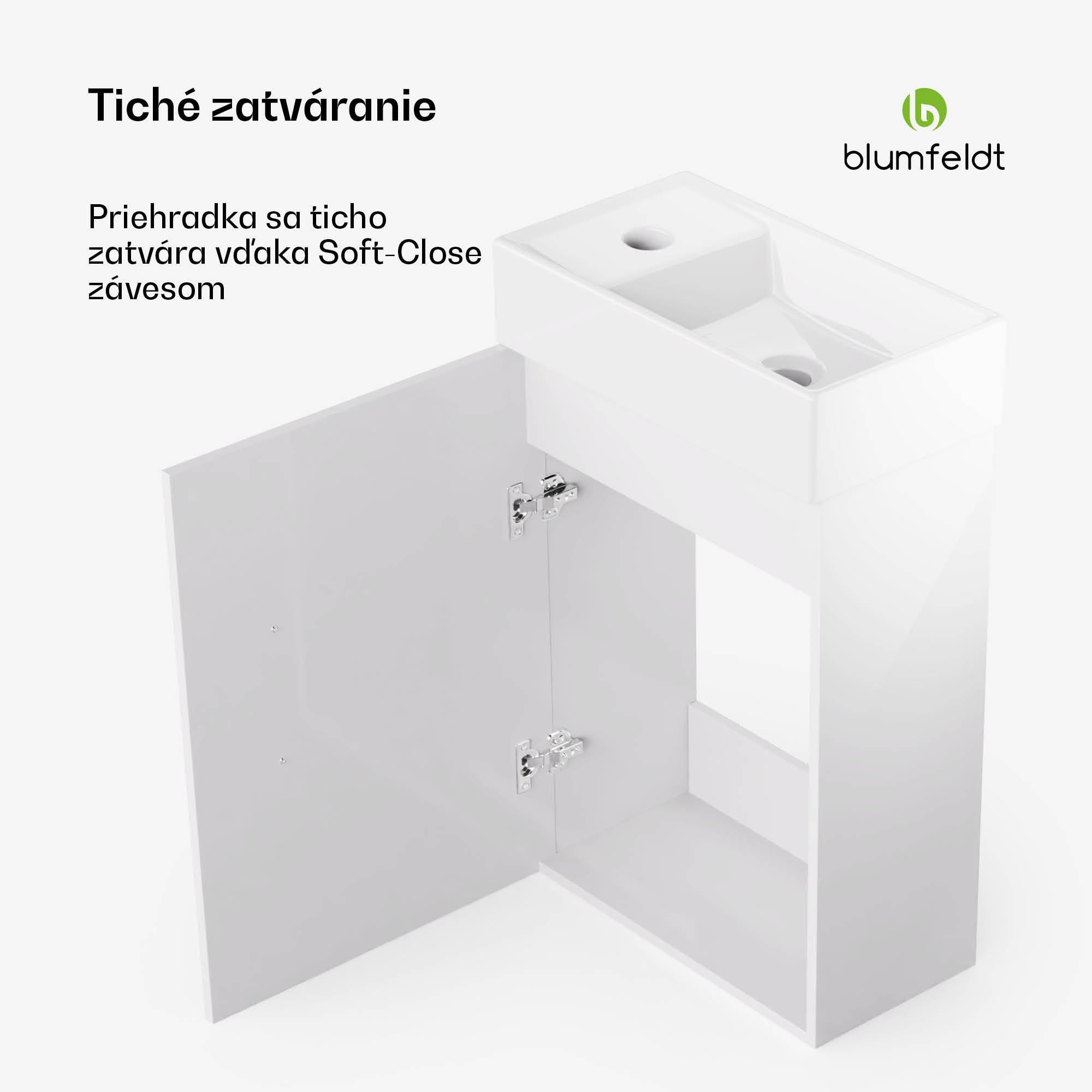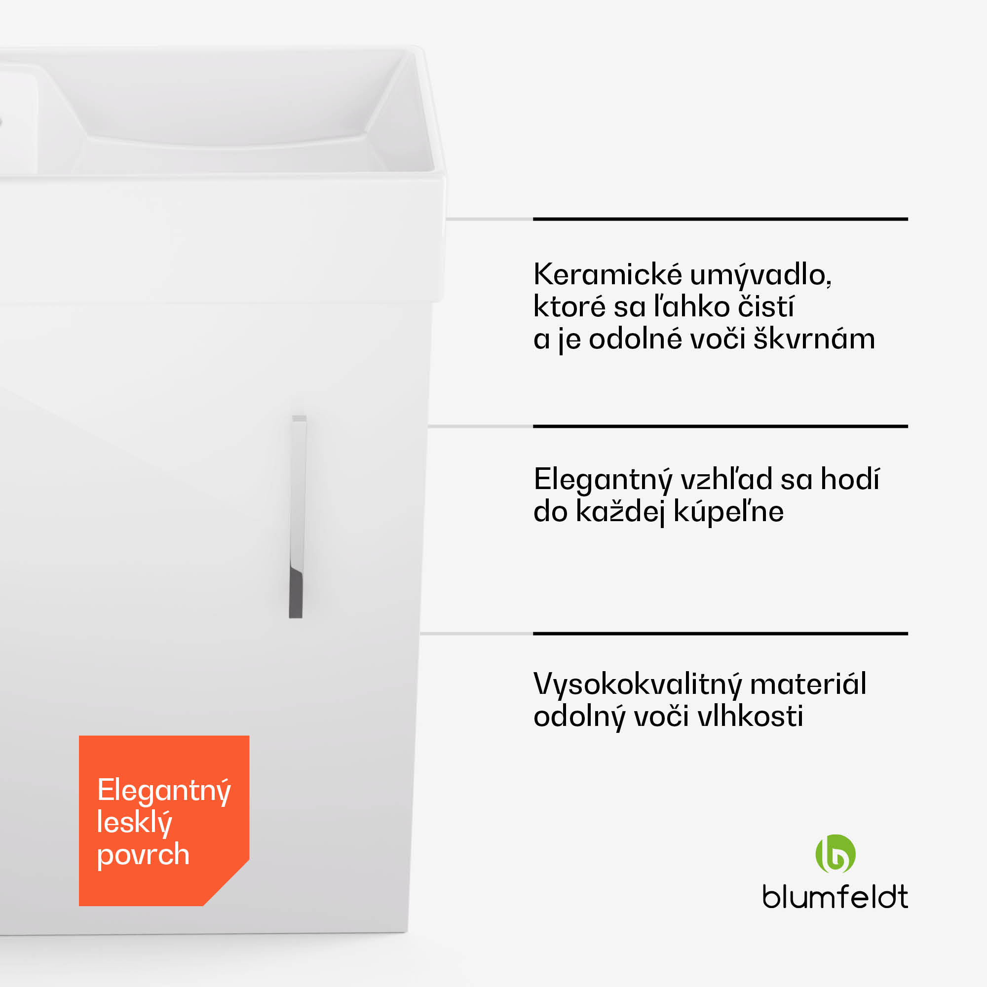 Blumfeldt Johnstone je štýlová a funkčná kúpeľňová skrinka, ktorá vám pomôže udržať v kúpeľni poriadok. So šírkou 40 cm je Johnstone ideálna do menších kúpeľní alebo ako ďalší úložný nábytok. Skrinka je vyrobená z vysokokvalitného materiálu odolného voči vlhkosti, a preto je ideálna na použitie vo vlhkom prostredí, ako je kúpeľňa. Dizajn skrinky Johnstone je elegantný a hodí sa do každého interiéru. Skrinka má keramické umývadlo, ktoré sa nielen ľahko čistí, ale je aj odolné voči škvrnám a poškriabaniu. Vďaka závesom so Soft-Close je otváranie a zatváranie skrinky nehlučné. Skrinka vám ponúka aj praktické možnosti úložného priestoru s priehradkou na kúpeľňové náčinie, aby ste v ňom mali prehľad. Skrinka pod umývadlo Blumfeldt Johnstone sa dodáva so zariadením pre montáž na stenu, ktoré umožňuje jednoduchú a bezpečnú inštaláciu. Vďaka jasným a podrobným návodom je montáž hračkou. Upozorňujeme však, že vodovodný kohútik nie je súčasťou dodávky.