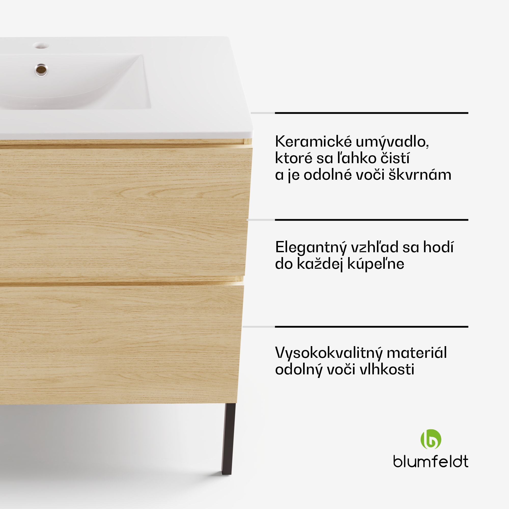 Sada Blumfeldt Johnstone je kvalitné a štýlové umývadlo so skrinkou do vašej kúpeľne. Vďaka svojmu elegantnému dizajnu z prírodného dreva dokonale zapadne do každého interiéru a dodá vašej kúpeľni hrejivú a útulnú atmosféru. Skrinka je vyrobená z vysokokvalitného materiálu odolného voči vlhkosti, ktorý zaručuje dlhú životnosť aj vo vlhkom prostredí. Keramické umývadlo sa ľahko čistí a je odolné voči škvrnám, takže ho môžete bez námahy udržiavať čisté. Skrinka pod umývadlo má dve priestranné zásuvky na pohodlné ukladanie. Vďaka závesom so Soft-Close je otváranie a zatváranie skrinky nehlučné. Umývadlo sa dodáva so súpravou pre montáž na stenu, ktorá obsahuje všetky potrebné pokyny na jednoduchú montáž. Okrem toho je táto skrinka vybavená aj nožičkami, ktoré jej dodávajú elegantný, industriálny vzhľad. Vychutnajte si štýlový a funkčný prvok vo vašej kúpeľni so skrinkou a umývadlom Blumfeldt Johnstone. Objednajte si teraz a urobte zo svojej kúpeľne miesto, kde môžete relaxovať a odpočívať.