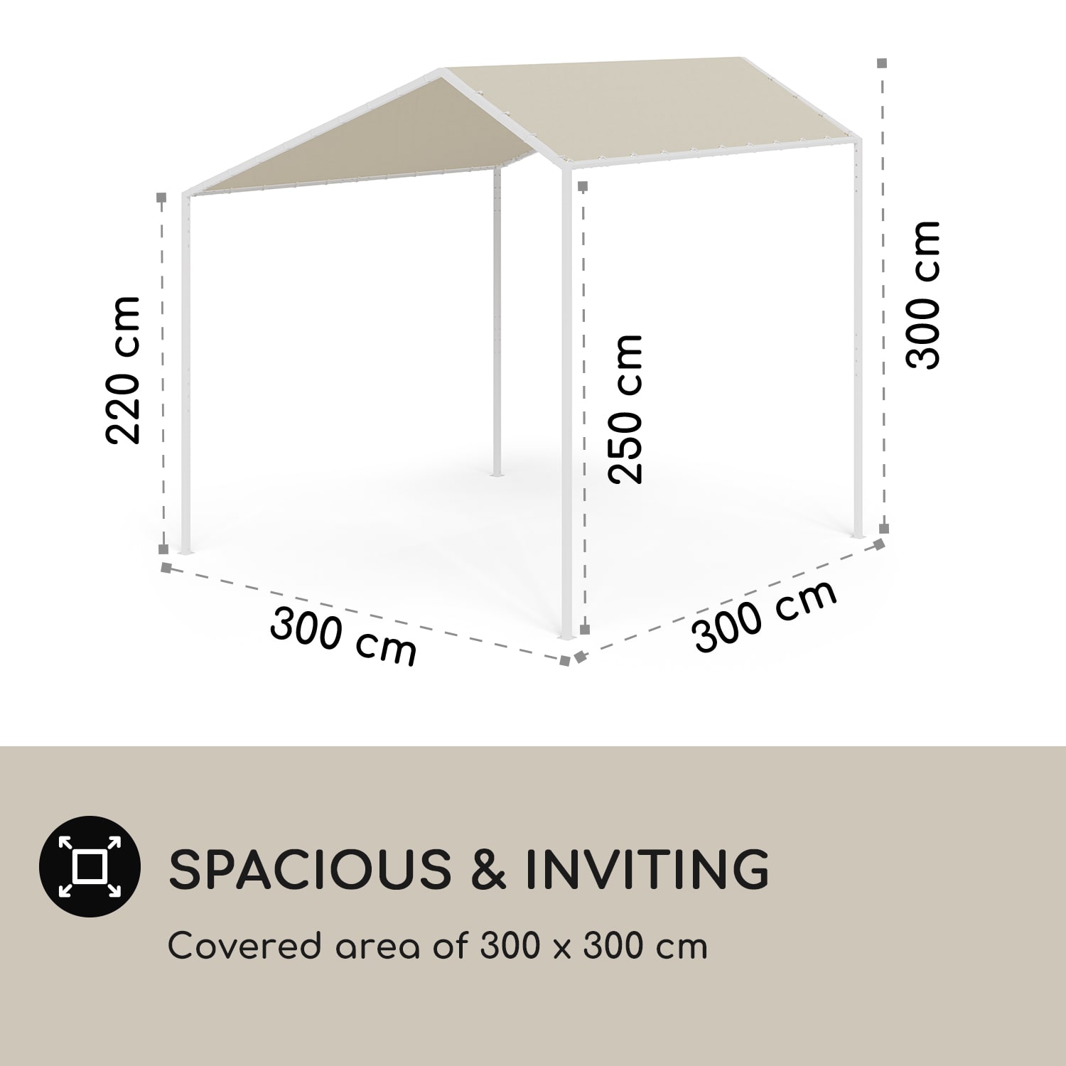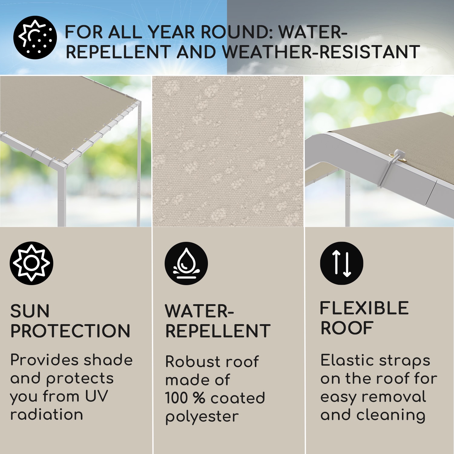 S Gazebo La Rochelle od blumfeldt sa budete cítiť ako Boh vo Francúzsku. Markíza spoľahlivo zatieni plochu 3 x 3 m a vďaka jednoduchému systému poskladania ju rýchlo zostavíte vo vašej záhrade. Strechu altánku môžete jednoducho upevniť pomocou priložených gumičiek. Štíhly dizajn so šikmou strechou krásne zapadne do vášho vonkajšieho priestoru. Jeho hliníkový rám zabezpečuje stabilitu a vodoodpudivý strešný povrch chráni pred priamym slnečným žiarením vďaka triede ochrany proti UV žiareniu 50+. Pergola La Rochelle od blumfeldt premení miesta na sedenie vo vašej záhrade na komfortné zóny plné oddychu.