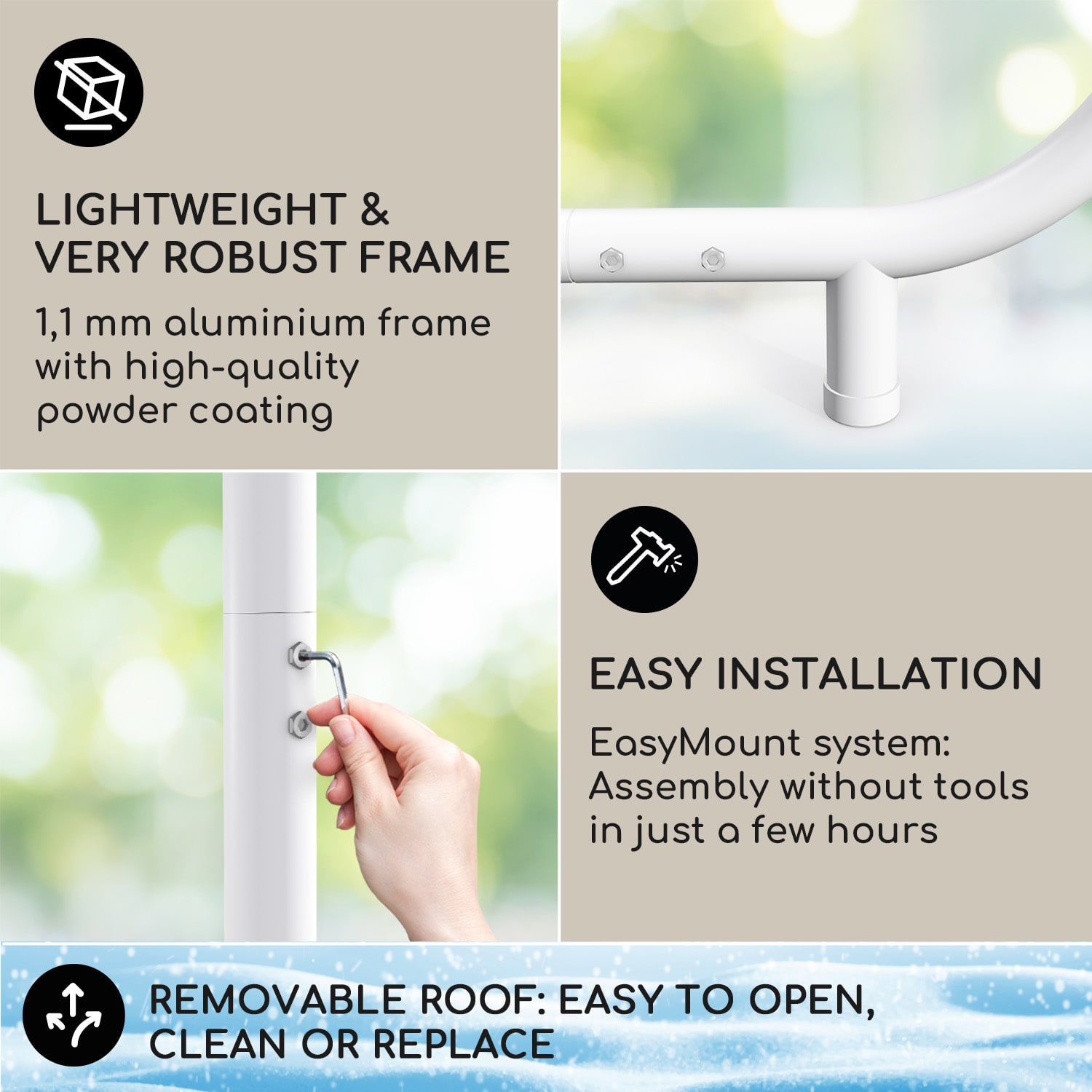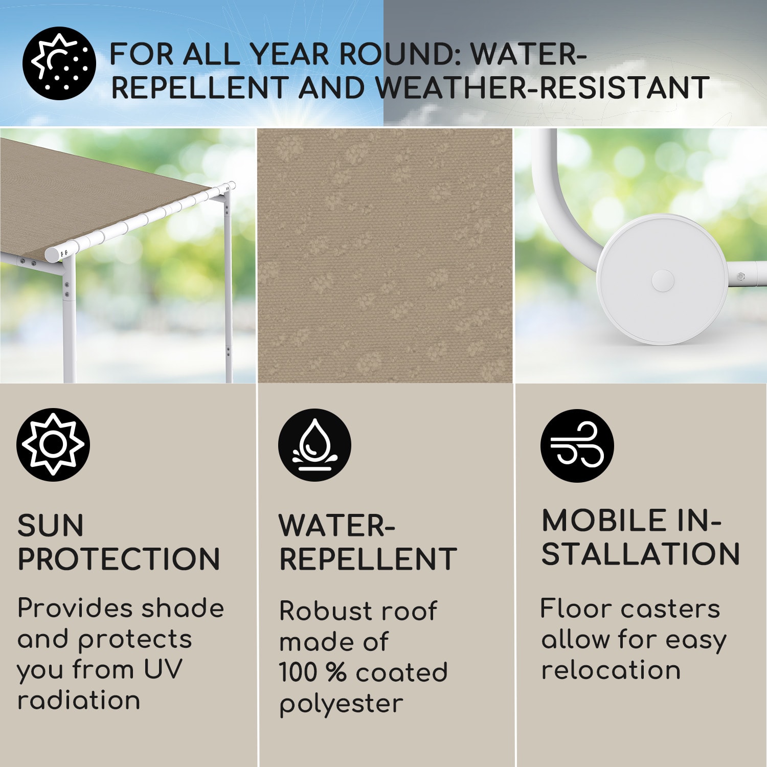 Altánok Nantes od blumfeldt premení terasu alebo miesto na sedenie v záhrade na relaxačné letné sídlo.S pergolou Nantes od blumfeldt spravíte zo svojej terasy alebo záhradného posedenia príjemne tienenú oddychovú zónu. V kompletnej súprave nájdte všetko potrebné aby ste s minimálnym úsilím vytvorili tienenú plochu s rozlohou 3 x 3 m. Rám z práškovo lakovaných oceľových rúrok je robustný, veľmi ľahký a odolný voči poveternostným vplyvom. Perfektné pre dlhodobé potešenie z oddychu vo vonkajšom prostredí – úplne bez škvŕn od hrdze na podlahe terasy. A vďaka integrovaným podlahovým kolieskam je aj plne mobilná – takže svoje miesto v tieni budete mať vždy presne tam, kde sa vám to páči. Praktická strieška z pevného polyesteru s gramážou 200 g/m³ je odolná voči vode a UV žiareniu. Strecha je mierne sklonená, aby umožnila ľahký odtok dažďovej vody. Pre jednoduchšie čistenie alebo pri silnom vetre môžete textilný poťah v niekoľkých krokoch odstrániť a znovu pripevniť. Pre ešte väčšiu stabilitu možno rám ukotviť do zeme pomocou priložených kolíkov. Užívajte si slnko a relaxujte v tieni: s mobilnou terasovou strechou Nantes od blumfeldt môžete nerušene tráviť čas vo voľnej prírode.