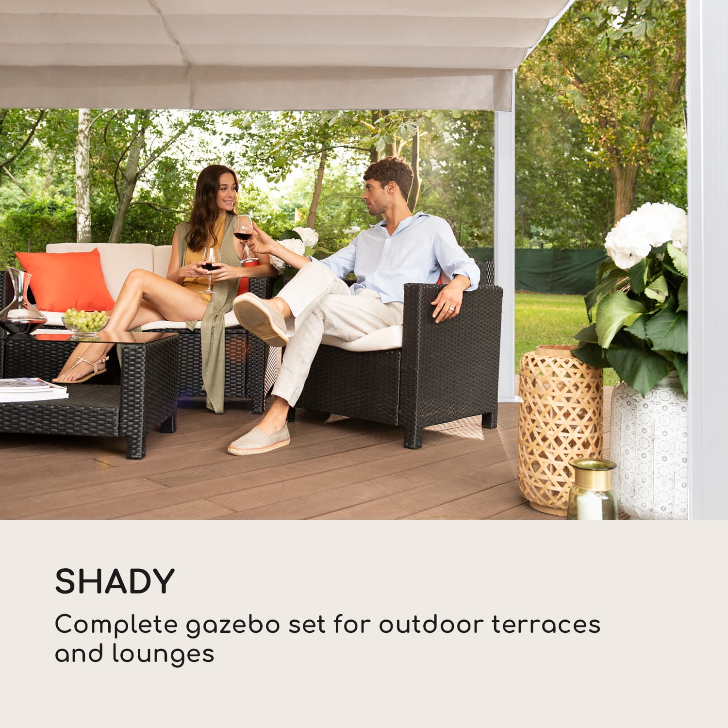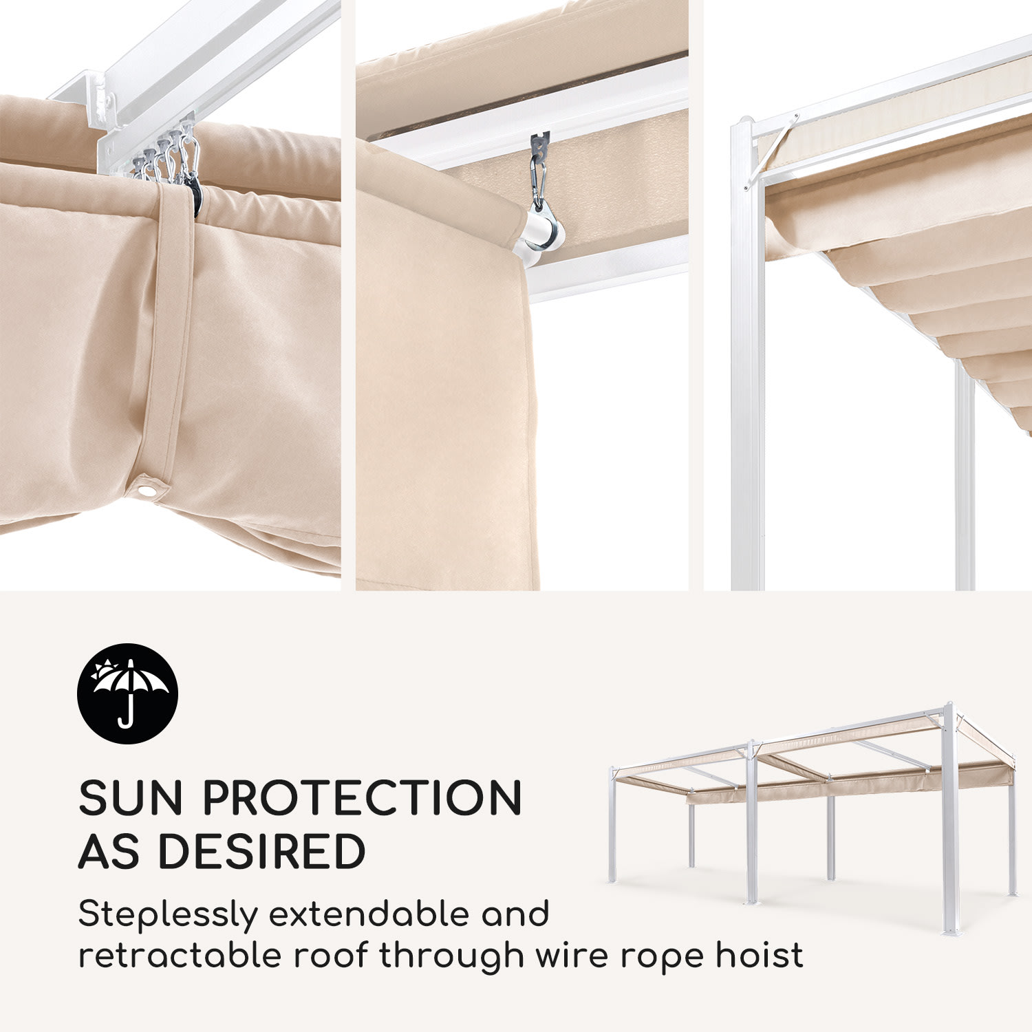 Pergola blumfeldt Pantheon Cortina premení terasu alebo záhradné posedenie na zónu oddychu. So svojím elegantným dizajnom pergola zapadne do každého záhradného prostredia.Kompletná súprava pergly obsahuje všetko, čo je potrebné na to, aby sa plocha 3 × 6 metrov zmenila s malým úsilím na tienené letné miesto. Konštrukcia z 10 × 10 cm stĺpikov s hrúbkou materiálu 1 mm je nielen maximálne stabilná. Vďaka zhotoveniu z práškovo lakovaného hliníka je tiež veľmi ľahká. Perfektný na dlhodobý oddych vo vonkajšom prostredí – bez hrdzavenia.S plynule nastaviteľnou látkovou strechou z 180 g/m² polyesteru získaš úplnú kontrolu nad tieňom a slnkom. Lanko umožňuje, že dá sa strecha pergoly plynulo pohybovať dopredu a dozadu vo vodiacich koľajničkách, zatiaľ čo vodovzdorný povlak ju chráni pred plesňou aj krátkymi dažďovými prehánkami. Vďaka pružným a zrolovateľným bočným častiam z 160 g/m² polyesterovej tkaniny zostaneš po celú dobu chránený pred vetrom.Užívaj si slnko a relaxuj v tieni: pergola Pantheon Cortina od značky blumfeldt.