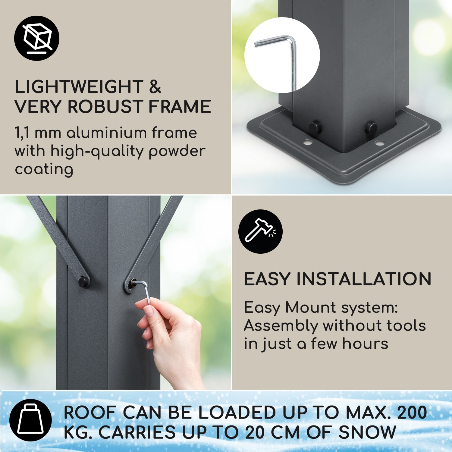 Príjemné hodiny v záhrade alebo na terase pod ochranou prístrešku: pergola blumfeldt Pantheon Cortina Solid Sky s hliníkovým rámom, pevnou strechou a bočnými stenami to umožňuje!Čo môže byť krajšie ako tráviť spoločný čas vonku s rodinou a priateľmi? S pergolou Pantheon Cortina Solid Sky budeš vždy chránený pred dažďom a môžeš stráviť horúce letné dni v chladivom tieni. Vďaka stabilnej plochej streche z polykarbonátu (PC) a ľahkému hliníkovému rámu s práškovým lakovaním. Skrutky z nehrdzavejúcej ocele, odolné proti poveternostným vplyvom a s dlhou živostnosťou tiež zabezpečujú vysokú stabilitu celej konštrukcie. Pergola blumfeldt Pantheon Cortina Solid Sky sa dá jednoducho upevniť na vhodné podlahy pomocou dodávaných kolíkov alebo sa dá pevne zoskrutkovať s terasou. Pavilón obohatí tvoje sedenie v záhrade alebo na terase ako bezpečná ochrana pred dažďom a slnečným žiarením. Pre prípadnú ochranu súkromia a individuálnu ochranu pred vetrom je každá bočná stena vybavená výsuvnou roletou z polyesteru.Veľmi kvalitná, všestranná a pevná: pergola blumfeldt Pantheon Cortina Solid Sky poskytuje hodiny odpočinku v záhrade alebo na terase so spoľahlivou ochranou pred dažďom a slnkom a s bočnými roletami sa postará o ochranu pred pohľadmi aj vetrom. V prípade tažkej snehovej pokrývky je potrebné sneh zo strechy odstrániť, keďže tento produkt nie je stavaný na tento účel.