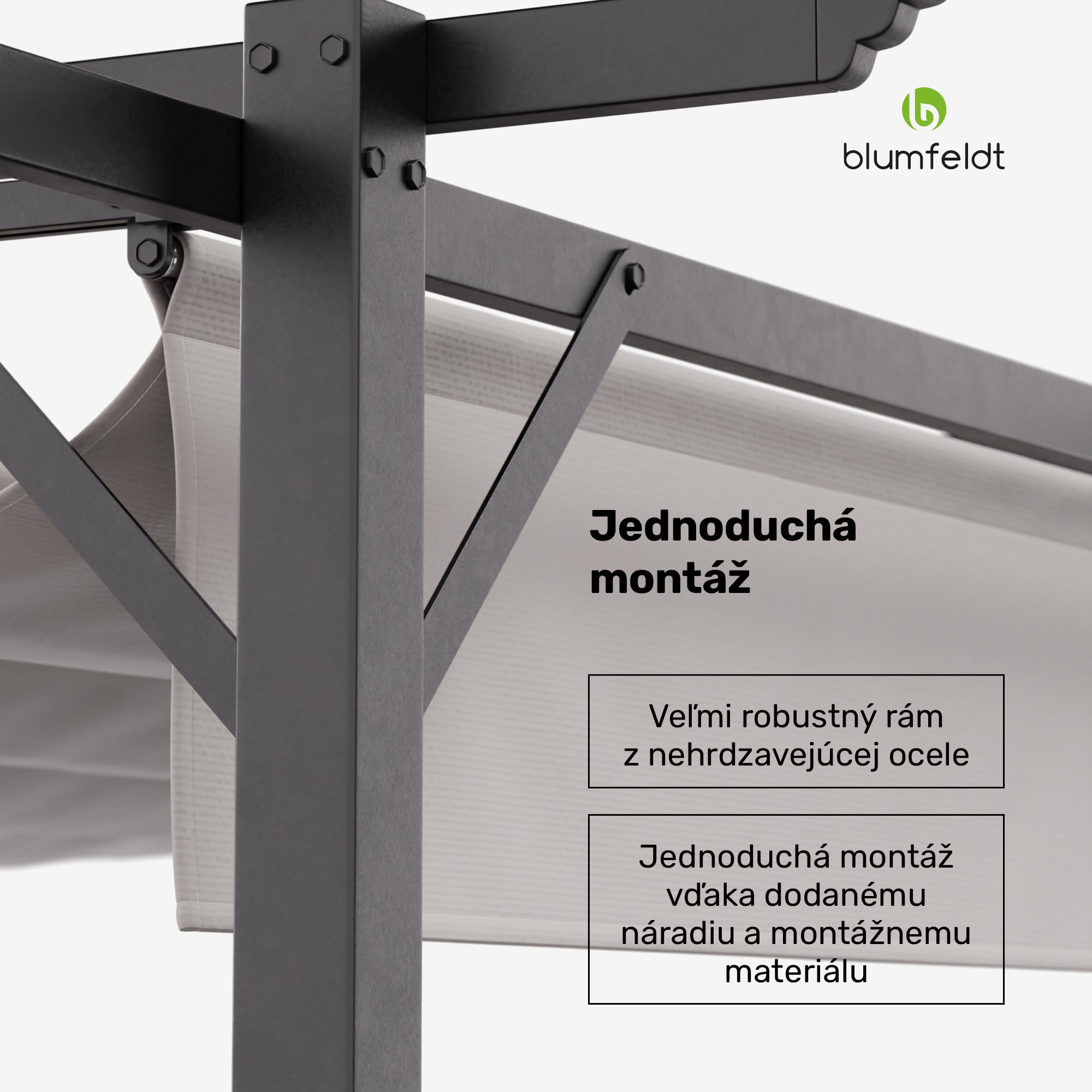Pergola Blumfeldt Pantheon Robust je ideálnym doplnkom vášho vonkajšieho priestoru, či už v záhrade, na terase alebo na dvore. Vďaka elegantnému dizajnu a robustnej konštrukcii poskytuje ochranu pred slnkom a dažďom a vytvára vonku útulnú atmosféru. Oceľový rám s práškovou povrchovou úpravou zaisťuje vysokú stabilitu a nosnosť, zatiaľ čo strecha z polyesteru s gramážou 160 g/m² s vodoodpudivou PU vrstvou je odolná voči poveternostným vplyvom a poskytuje UV ochranu. Vďaka ochrannej streche a roletám môžete pergolu Blumfeldt Pantheon Robust používať po celý rok, aby ste si mohli naplno užívať pobyt vonku bez obáv z nepriaznivého počasia. Montáž je jednoduchá a priamočiara, pretože všetko príslušenstvo potrebné na montáž je súčasťou balenia, takže si môžete za okamih vychutnať svoju súkromnú vonkajšiu oázu pohody.