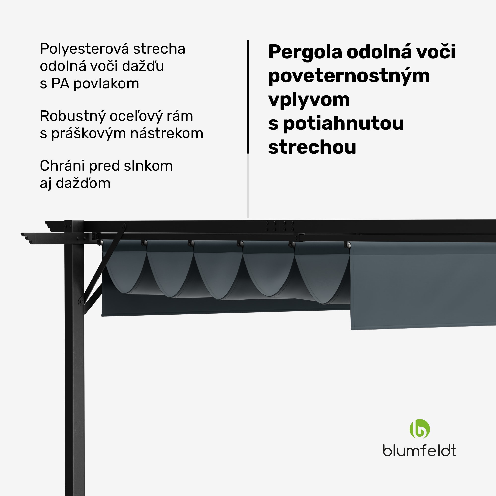 Pergola Blumfeldt Pantheon Robust je ideálnym doplnkom vášho vonkajšieho priestoru, či už v záhrade, na terase alebo na dvore. Vďaka elegantnému dizajnu a robustnej konštrukcii poskytuje ochranu pred slnkom a dažďom a vytvára vonku útulnú atmosféru. Oceľový rám s práškovou povrchovou úpravou zaisťuje vysokú stabilitu a nosnosť, zatiaľ čo strecha z polyesteru s gramážou 160 g/m² s vodoodpudivou PU vrstvou je odolná voči poveternostným vplyvom a poskytuje UV ochranu. Vďaka ochrannej streche môžete pergolu Blumfeldt Pantheon Robust používať po celý rok, aby ste si mohli naplno užívať pobyt vonku bez obáv z nepriaznivého počasia. Montáž je jednoduchá a priamočiara, pretože všetko príslušenstvo potrebné na montáž je súčasťou balenia, takže si môžete za okamih vychutnať svoju súkromnú vonkajšiu oázu pohody.