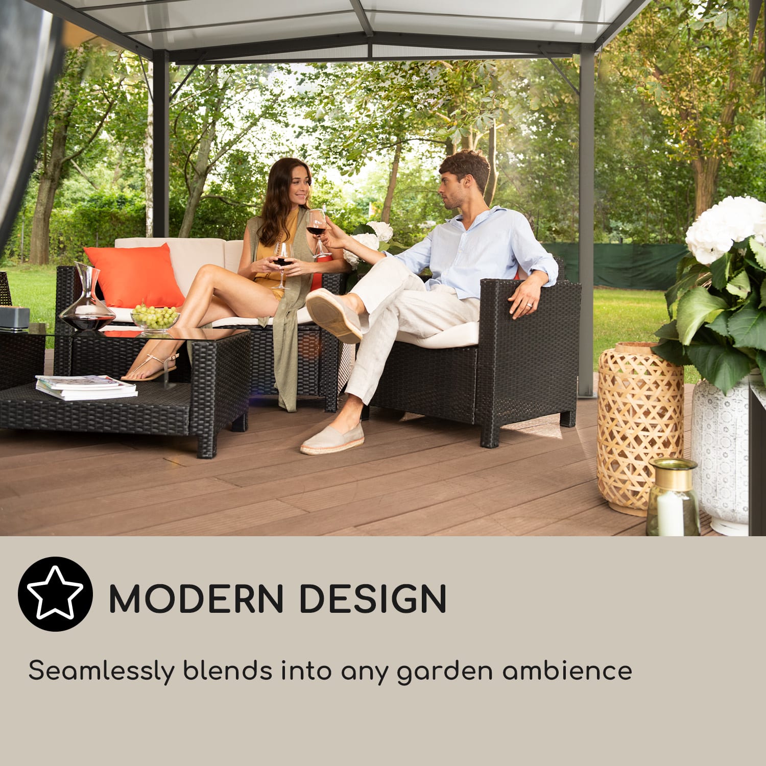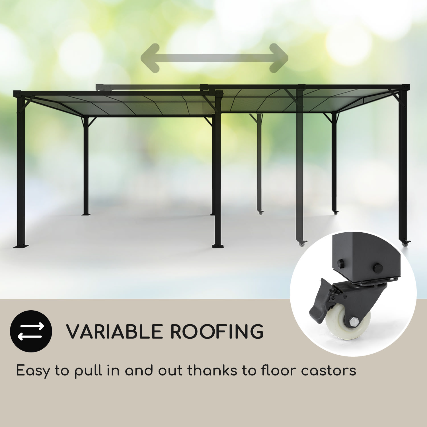 So záhradnou pergolou blumfledt Pantheon Solid Sky Expand sa slovo spontánnosť píše jednoznačne veľkými písmenami. Jedno, či pod ním budú 2, 4 alebo 10 osôb, pod dvojitou pergolou si vďaka možnosti roztiahnutia nájdu všetci svoje miesto.Pekná, stabilná a flexibilná, taká má byť záhradná pergola, aby sa pobyt v záhrade alebo na terase stal zážitkom. Pergola blumfeldt Pantheon Solid Sky Expand prekoná tvoje očakávania: pergola s rozlohou 3 x 5,6 m (max. veľkosť) nerobí dobrú formu len vďaka jednoduchému dizajnu a decentnej farbe. Jej konštrukcia s hliníkových tyčí, lakovaných práškovou metódou, jej dodáva vysokú stabilitu a je obzvlášť ľahká. Okrem iného presviedča pegrola svojou jednoduchou montážou bez ďalšieho náradia. O ochranu za každých okolností sa stará ľahko naklonená strecha zo 6 mm hrubých, vode odolných a jemne tónovaných platní z polykarbonátu. Takto nemá dážď dvakrát takú šancu aby pokazil dobrú náladu. Vďaka dvom stĺpikom s kolieskami sa dá veľkosť strechy nastaviť flexibilne, jednoducho a podľa individuálnych predstáv. Pergolu môžeš použiť aj ako parkovacie miesto alebo prístrešok na bicykle, záhradné prístroje alebo náradie.Užívaj si leto v prírode s priateľmi a tvojou rodinou. Vďaka záhradnej pergole blumfeldt Pantheon Solid Sky Expand môžeš tvoj vonkajší priestor využívať všestranne – a jedno aké počasie bude.