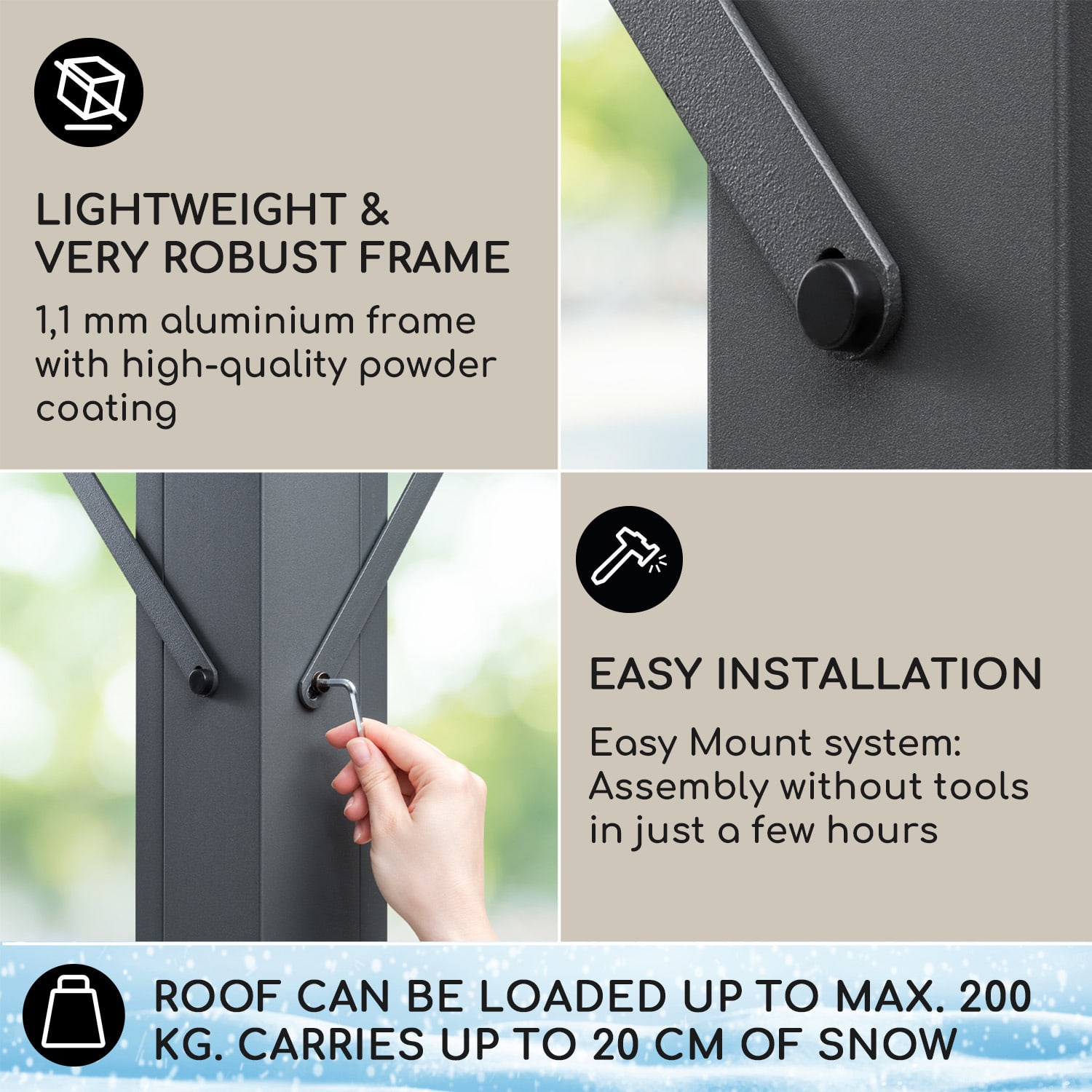 Príjemné hodiny v záhrade alebo na terase pod ochranou prístrešku: pergola blumfeldt Pantheon Solid Sky Flat s hliníkovým rámom a pevnou strechou to umožňuje!Čo môže byť krajšie ako tráviť spoločný čas vonku s rodinou a priateľmi? S pergolou Pantheon Solid Sky Flat budeš vždy chránený pred dažďom a môžeš stráviť horúce letné dni v chladivom tieni. Vďaka stabilnej plochej streche z polykarbonátu (PC) a ľahkému hliníkovému rámu s práškovým lakovaním. Skrutky z nehrdzavejúcej ocele, odolné proti poveternostným vplyvom a s dlhou životnosťou, tiež zabezpečujú vysokú stabilitu celej konštrukcie. Pergola blumfeldt Pantheon Solid Sky Flat sa dá jednoducho upevniť na vhodný podklad pomocou dodávaných kolíkov alebo sa dá pevne zoskrutkovať s terasou. Pavilón obohatí tvoje sedenie v záhrade alebo na terase o bezpečnú ochranu pred dažďom a slnečným žiarením. Môže, samozrejme, slúžiť aj ako praktický prístrešok na záhradné náradie alebo bicykle.Veľmi kvalitná, všestranná a pevná: pergola blumfeldt Pantheon Solid Sky Flat poskytuje hodiny odpočinku v záhrade alebo na terase so spoľahlivou ochranou pred dažďom aj slnečným žiarením.