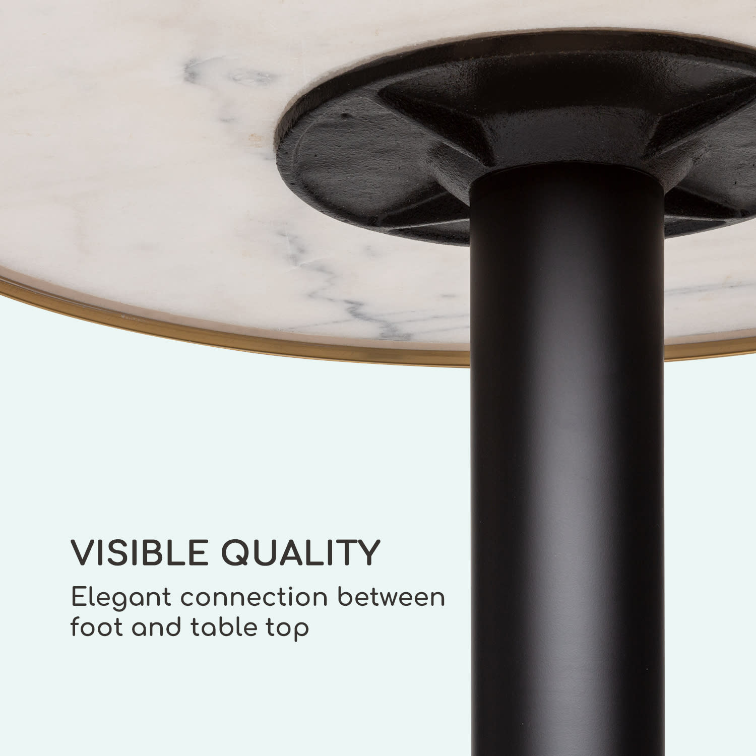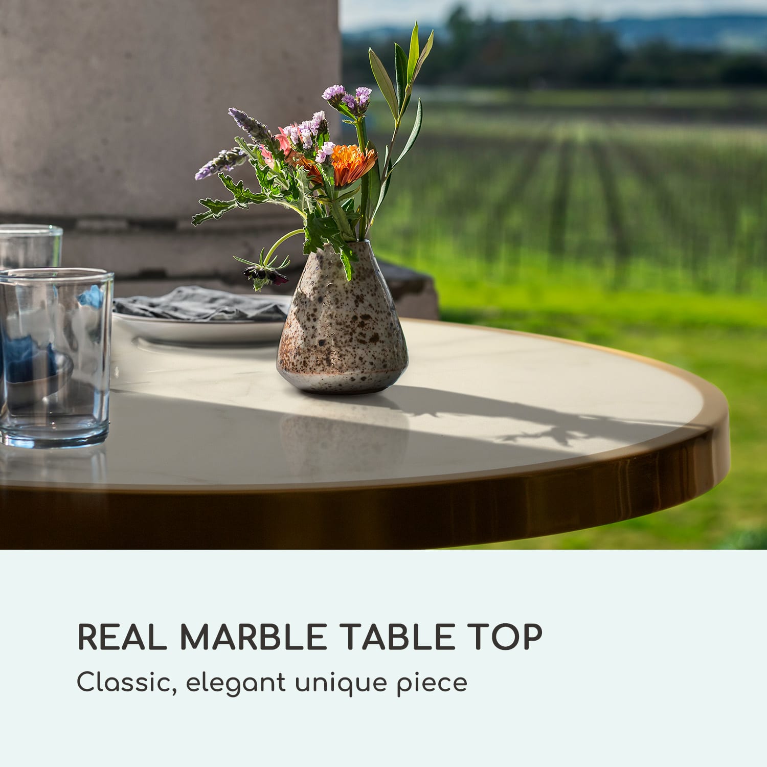 S bistro stolíkom blumfeldt Patras Jewel znovu ožívajú zlaté dvadsiate roky.Luxusný pôžitok so secesnou atmosférou – presne to sľubuje záhradný stôl blumfeldt Patras Jewel. Okrúhla doska stola je vyrobená zo starostlivo lešteného pravého mramoru. Tento stolík je teda unikát – vzor a farba horniny vždy prinášajú celkom jedinečný charakter. Ten vynikajúco zdôrazňuje zlatý lem dosky stola a luxusný vzhľad ešte umocňuje liatinový stojan stola. Raňajky na balkóne, príjemná káva na terase alebo romantická večera pri sviečkach pod hviezdami: mramorový stôl blumfeldt Patras Jewel sa postará o výnimočné prostredie.Bistro stolík blumfeldt Patras Jewel šíri luxus a pozýva pobudnúť v špeciálnej secesnej atmosfére!