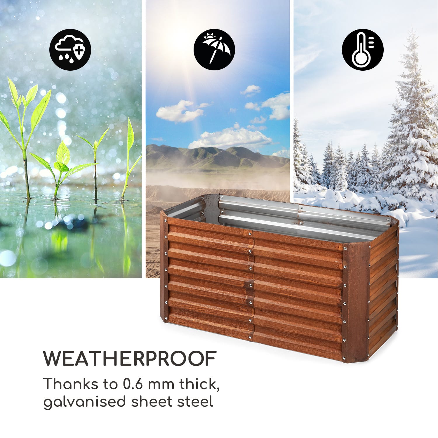 Chutne, čerstvo a z vlastného záhonu: s vyvýšeným záhonom blumfeldt Rust Grow si svoje denné porcie zeleniny dopestuješ sám a terasy, dvory alebo predzáhradky sa premenia na zelené oázy.Pretože šťavnaté paradajky, sladké jahody, chrumkavé cukety a aromatické bylinky sa dajú jednoducho vypestovať vďaka ideálnym podmienkam rastu. Pevná rámová konštrukcia vyvýšeného záhona z pozinkovaného oceľového vlnitého plechu je chránená pred poveternostnými vplyvmi. Vďaka tomu odoláva Rust Grow vetru a počasiu po celý rok. Dekoratívna hrdzavá úprava šikovne zakončuje pôsobivý celkový dojem.Pestré potešenie pre oči a zdravé pochúťky: s blumfeldt Rust Grow budú dosiahnuté optimálne podmienky rastu. Umožňuje to pomerne vyššie výnosy ako nízke záhony. Záhradníci sa potešia z pohodlia pri státí a z ochrany svojho chrbta. Vyvýšené záhony zároveň chránia tvoje rastliny pred škodcami, ako sú napríklad slimáky. Okrasný vyvýšený záhon je ideálnym riešením pre každého záhradníka.Čas všetko urýchliť: s vyvýšeným záhonom blumfeldt Rust Grow môže každý objaviť svoj záhradnícky talent.