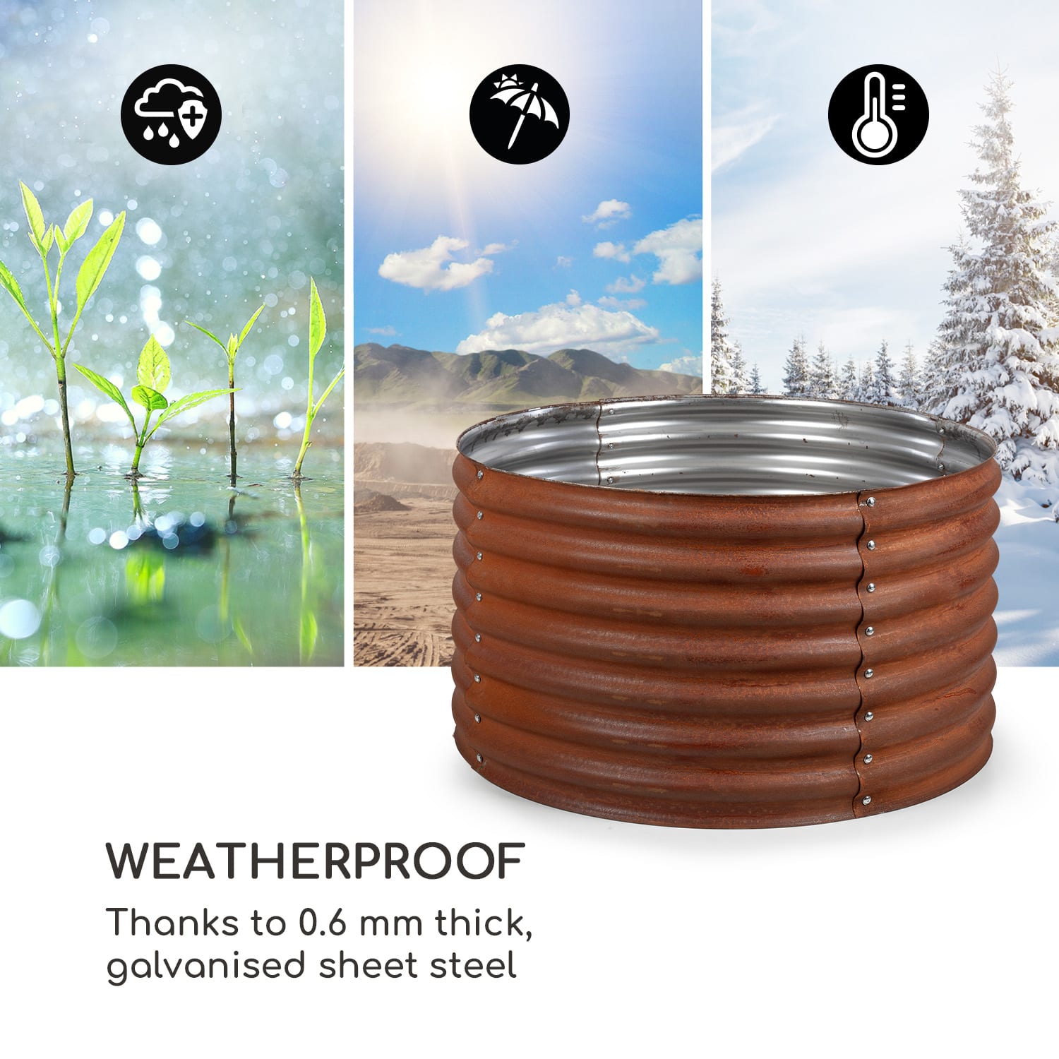 Chutne, čerstvo a z vlastného záhonu: s vyvýšeným záhonom blumfeldt Rust Grow si svoje denné porcie zeleniny dopestuješ sám a terasy, dvory alebo predzáhradky sa premenia na zelené oázy. Tento okrasný vyvýšený záhon dodá vašej záhrade estetický vzhľad.Pretože šťavnaté paradajky, sladké jahody, chrumkavé cukety a aromatické bylinky sa dajú jednoducho vypestovať vďaka ideálnym podmienkam rastu. Pevná rámová konštrukcia vyvýšeného záhona z pozinkovaného oceľového vlnitého plechu je chránená pred poveternostnými vplyvmi. Vďaka tomu odoláva Rust Grow vetru a počasiu po celý rok. Dekoratívna hrdzavá úprava šikovne zakončuje pôsobivý celkový dojem.Pestré potešenie pre oči a zdravé pochúťky: s blumfeldt Rust Grow budú dosiahnuté optimálne podmienky rastu. Umožňuje to pomerne vyššie výnosy ako nízke záhony. Záhradníci sa potešia z pohodlia pri státí a z ochrany svojho chrbta. Vyvýšené záhony zároveň chránia tvoje rastliny pred škodcami, ako sú napríklad slimáky.Čas všetko urýchliť: s vyvýšeným záhonom blumfeldt Rust Grow môže každý objaviť svoj záhradnícky talent.