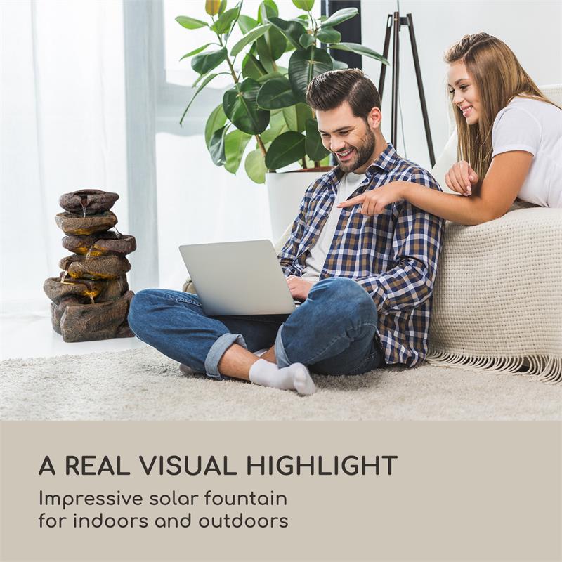 So solárnou fontánou Blumfeldt Savona sa vďaka kombinácii jemne tečúcej vody, pôsobivého osvetlenia a kamenného vzhľadu stane záhrada, balkón a obývacia izba oázou odpočinku.Savona, vybavená solárnym panelom a technológiou SunRiver Technology, pracuje úplne nezávisle od externého napájania a vďaka integrovanému lítiovo-iónovému akumulátoru môže byť v prevádzke až 5 hodín bez slnečného žiarenia. Vďaka zhotoveniu z polyresinu je solárna fontána nielen vizuálnym prvkom, ale je tiež mrazuvzdorná a extrémne odolná. Napriek svojej relatívne nízkej hmotnosti pevne stojí aj pri veternom počasí. Okrem jemného zvuku vody sa zariadenie Savona vyznačuje integrovaným LED osvetlením, ktoré ho na akomkoľvek mieste pôsobivo uvádza na scénu. V byte má okrem relaxačného efektu aj ďalší pozitívny vplyv na zdravie: automaticky zvlhčuje vzduch, zlepšuje vnútorné prostredie a umožňuje dýchať svieži vzduch. Aby sa fontána nikdy nevyčerpala, je udržiavaná v konštantnej cirkulácii vďaka koncepcii LoopFlow Concept s nízkou spotrebou energie 2,8 W.Pre atmosféru osviežujúceho odpočinku v interiéri aj exteriéri: solárna fontána Blumfeldt Savona je udržateľným riešením pre všetkých priateľov pôsobivých fontán.