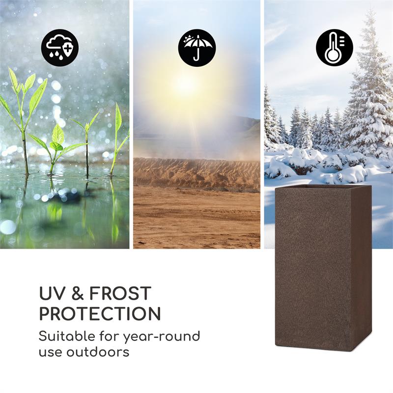 Vytvorte prirodzený vzhľad vo vnútornom aj vonkajšom prostredí s kvetináčom Blumfeldt Solid Grow Rust a oživte svoje okolie zeleňou a farebnými kvetmi.Okrasný kvetináč s rozmermi 40 x 80 x 40 cm (Š x V x H) ponúka dostatok priestoru pre kvety, izbové a záhradné rastliny, ako aj pre vlastné bylinky a zeleninu. Vďaka vyhotoveniu z robustného fibreclay, špeciálnej zmesi zo sklolaminátu a hliny, ktorá je mimoriadne vhodná na kvetináče, je kvetináč Solid Grow Rust nielen odolný voči poveternostným vplyvom, ale tiež chránený pred UV žiarením a mrazom. Môže sa preto používať a uchovávať vonku po celý rok. Ďalšou výhodou tohto materiálu je jeho relatívne nízka hmotnosť, ktorá výrazne uľahčuje premiestňovanie aj prepravu kvetináča. Vďaka svojmu hrdzavému sfarbeniu a svojmu prirodzenému a rustikálnemu vzhľadu sa Solid Grow Rust perfektne hodí do každej záhrady a bývania.Štýlový, všestranný a jednoducho prenosný kvetináč do vnútorného a vonkajšieho priestoru: Solid Grow Rust od spoločnosti Blumfeldt!