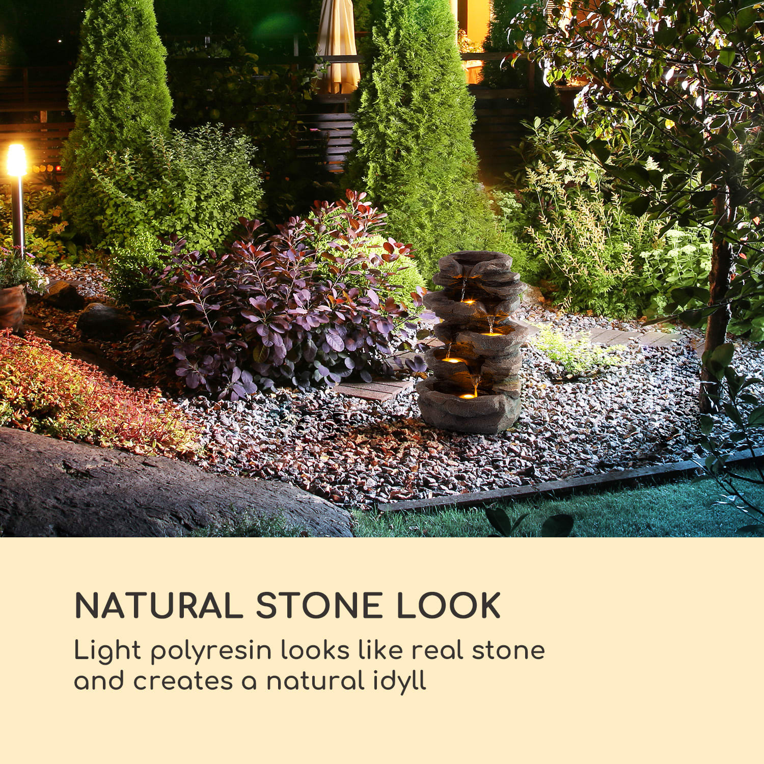 Zaži dokonalý odpočinok ako v prírode so solárnou fontánou Blumfeldt Stonehenge: harmonická hra vody s pôsobivým osvetlením do záhrady, na terasu alebo do obývačky.Vďaka zaoblenému dizajnu so sofistikovaným kamenným vzhľadom je solárna fontána Blumfeldt Stonehenge krásnym doplnkom a každému miestu poskytne oddychovú atmosféru. Pozoruj trblietavú hru svetla prostredníctvom LED osvetlenia pod vodnou hladinou, nechaj sa unášať jemnými zvukmi a snívaj. Dokonalá relaxácia je zaručená, pričom fontána sa postará aj o príjemne sviežu a zdravú klímu. V uzavretom vodnom obehu prúdi chladná voda v nepretržitom cykle zo stupňa na stupeň. Vďaka tomu nie je potrebné žiadne pripojenie k externému zdroju vody.Predovšetkým večer poskytuje solárna fontána Blumfeldt Stonehenge príjemnú idylku. Pretože každá nádoba je vybavená LED svetlom vo vode. Pohyby vody vytvárajú nádherné, živé efekty.Ekologická a úsporná: na zásobovanie fontány energiou stačí čistá solárna energia. Má totiž k dispozícii externý solárny panel, ktorý môžeš vďaka dlhému káblovému pripojeniu optimálne umiestniť na slnko. Cez deň alebo v noci je v prevádzke vďaka 7,4 V iónovému akumulátoru až do 5 hodín aj bez priameho slnečného žiarenia.Vytvor si doma svoju vlastnú oázu pokoja s ekonomickou solárnou fontánou Blumfeldt Stonehenge. Zjednocuje udržateľnosť s krásnym dizajnom a relaxačný vodný prvok sa postará o dokonalý relax.