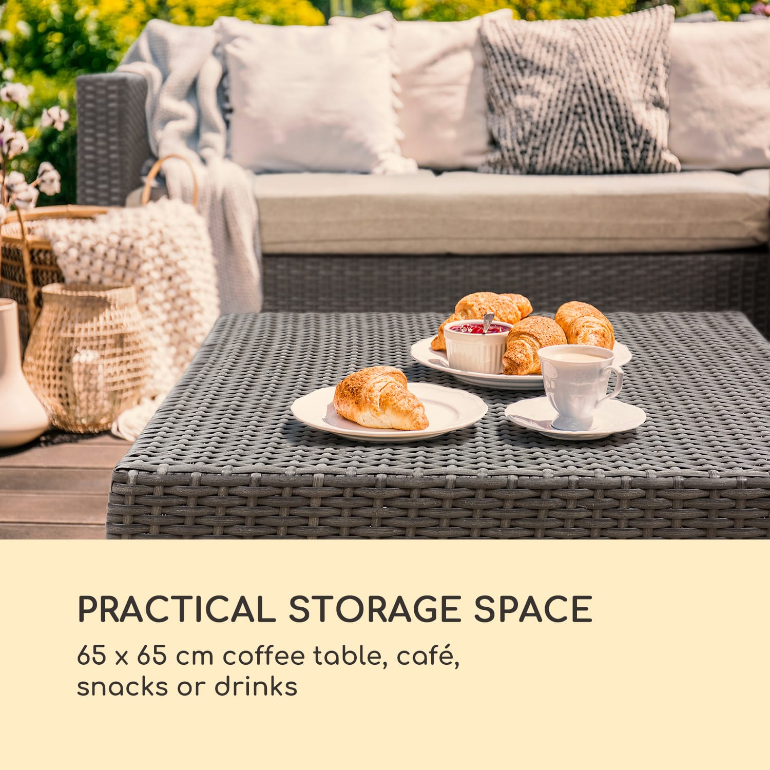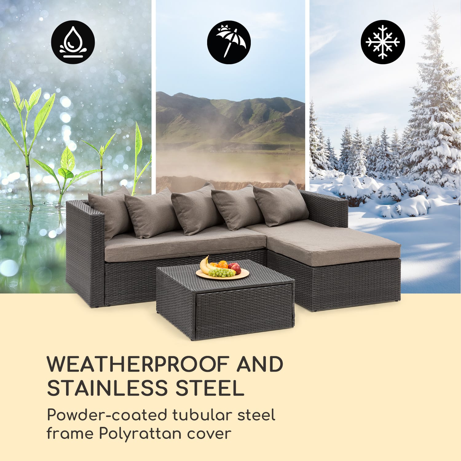 Vonku ako doma: záhradná súprava Blumfeldt Theia Lounge Set robí zo záhrady alebo terasy obývaciu izbu v prírode. Relaxujte na čerstvom vzduchu s celou rodinou a priateľmi. So sedacou súpravou Blumfeldt Theia Lounge Set si každý člen rodiny nájde vonku svoje miesto, kde sa cíti dobre: či už na gauči pri ležaní, alebo na veľkom stolčeku – až štyri osoby sa môžu na tejto súprave usadiť a vychutnať si spoločný čas. Potešením sú aj plyšovo mäkké vankúše sedadiel, ktoré s hrúbkou 10 cm splnia všetky požiadavky na oddych. Príjemné relaxovanie ďalej zabezpečuje päť jemných gaučových vankúšov s hrúbkou 20 cm. Obzvlášť praktická je koncepcia sedacej súpravy Blumfeldt Theia Lounge Set EasyComfort Concept: stolček sa bez čalúnenej sedacej podušky v okamihu stane skutočne variabilným konferenčným stolíkom. Je ideálnym miestom na odloženie osviežujúcich nápojov, lahodného občerstvenia alebo šálok s kávou. Aby pôžitok zo záhradného nábytku Blumfeldt Theia Lounge Set trval čo najdlhšie, je odolný voči poveternostným vplyvom a tiež je extrémne stabilný: oceľové rámy nábytku sú plne pozinkované a práškovo lakované. Vzdorujú tak každému náznaku hrdze. Poťah z polyratanu v prútenom vzhľade je odolný voči UV žiareniu a je extrémne trvanlivý. Pre tvorivých návrhárov sú čalúnenie a vankúše dodávané bez poťahov, aby ste si sami mohli zostaviť svoju obľúbenú farebnú kombináciu s našimi tromi sadami poťahov. Urobte zo záhrady obývaciu izbu na čerstvom vzduchu: so sedacou súpravou Blumfeldt Theia Lounge Set ste aj vonku doma!