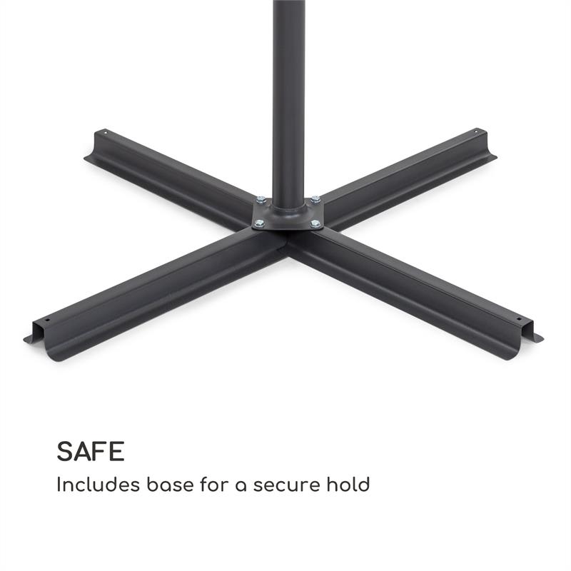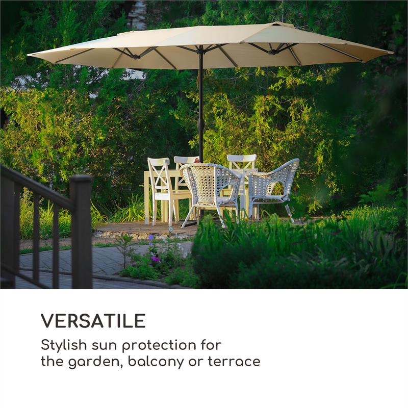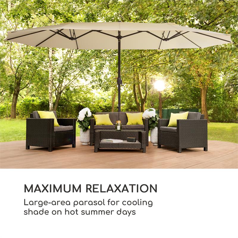 Nádherné hodiny v záhrade, na balkóne alebo na terase: slnečník Blumfeldt Twin Peaks s veľkou strechou proti slnku a s dvojitým vrcholom poskytuje chladný tieň v horúcich letných dňoch.Vďaka svojej pôsobivej veľkosti, ktorá pripomína kombináciu dvoch slnečníkov, ochráni Twin Peaks spoľahlivo všetky objekty a ľudí pred priamym slnečným žiarením. Strecha z polyesteru odpudzujúceho vodu s faktorom ochrany pred UV žiarením 50 odolá ľahkému dažďu a UV žiareniu. Robustná a ľahká hliníková tyč s ochranou proti hrdzaveniu zapôsobí nielen svojou vysokou stabilitou, ale tiež umožňuje ľahký prenos celej konštrukcie. Vďaka svojej inteligentnej konštrukcii s jednoduchým zatváracím mechanizmom je možné v okamihu slnečník otvoriť a zatvoriť. Po zatvorení ho môžete priestorovo úsporne uskladniť do ďalšieho použitia. Dodávaný podstavec zabezpečuje bezpečné postavenie za každých okolností.Pre letné chvíle oddychu vonku: slnečník Blumfeldt Twin Peaks presvedčí veľkým slnečníkom, robustnou a ľahkou hliníkovou tyčou a tiež dodávanou základňou.