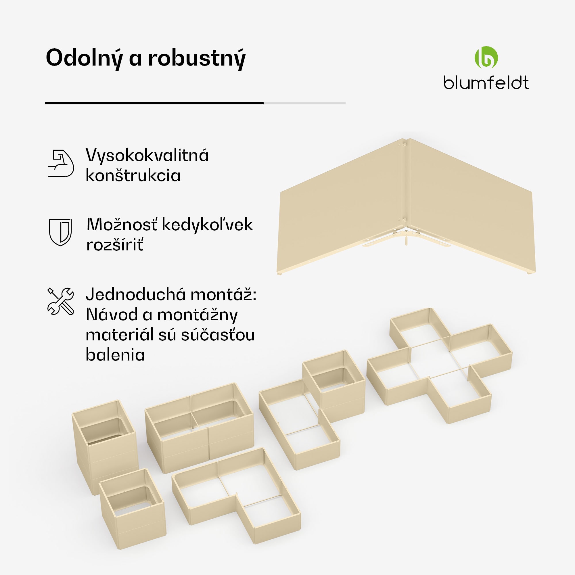 Chutné, čerstvé a z vlastného záhona: S vyvýšeným záhonom blumfeldt Versagrow máte ešte viac priestoru na to, aby ste si sami vypestovali svoju dennú porciu zeleniny a premenili terasy, dvory alebo predzáhradky na zelené oázy. Pestovanie šťavnatých paradajok, sladkých jahôd, chrumkavých cukiet a aromatických byliniek je vďaka optimálnym pestovateľským podmienkam hračka.Individuálny modulárny dizajn: okrasný vyvýšený záhon blumfeldt Versagrow sa skladá z dvanástich modulov, ktoré sa dajú navzájom rôzne spájať. Vďaka tomu môže mať záhon rôznu šírku, výšku a tvar. Vyberte si pracovnú výšku 30, 60 alebo 90 cm a vytvorte si priestor na mieru pre plytko a hlboko zakorenené rastliny. Deti môžu predviesť svoje záhradkárske zručnosti aj v nízkych výškach a záhon si nájde svoje miesto aj v kľukatých záhradách.Jednoročné rastliny a celoročné záhradnícke pôžitky: Stabilná rámová konštrukcia záhradného záhonu blumfeldt má robustné oceľové steny, ktoré sú vďaka práškovému lakovaniu odolné voči hrdzi a mrazu. Versagrow odoláva vetru a počasiu po celý rok a je stále pútačom pozornosti.Farebná pastva pre oči a zdravá pochúťka: Blumfeldt Versagrow vytvára optimálne rastové podmienky. To umožňuje relatívne vyššie výnosy ako u plochých záhonov. Vďaka pohodlnej pracovnej výške maximálne 90 cm môžete sadiť, polievať a zbierať úrodu bez toho, aby ste si namáhali chrbát.Čas urobiť niečo užitočné: S okrasným vyvýšeným záhonom blumfeldt Versagrow môže každý objaviť svoju zelenú záľubu.