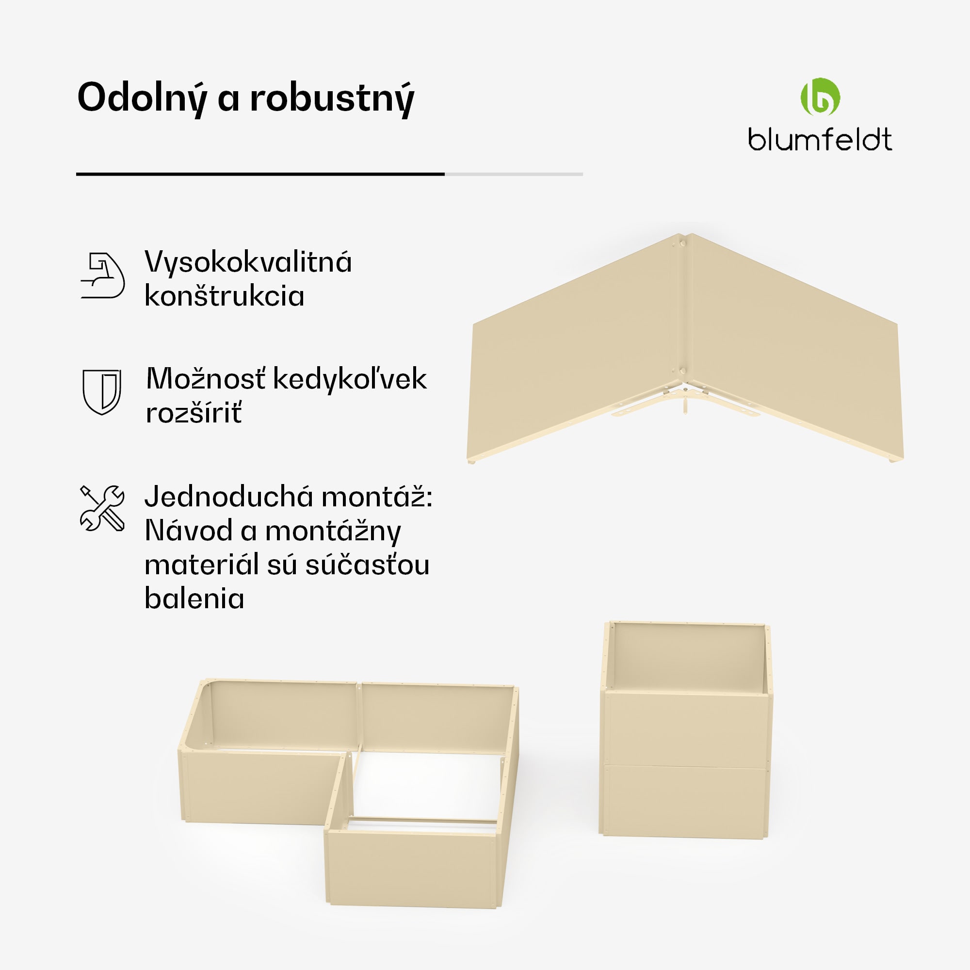 Chutné, čerstvé a z vlastného záhona: S vyvýšeným záhonom blumfeldt Versagrow máte ešte viac priestoru na to, aby ste si sami vypestovali svoju dennú porciu zeleniny a premenili terasy, dvory alebo predzáhradky na zelené oázy. Pestovanie šťavnatých paradajok, sladkých jahôd, chrumkavých cukiet a aromatických byliniek je vďaka optimálnym pestovateľským podmienkam hračka.Individuálny modulárny dizajn: okrasný vyvýšený záhon blumfeldt Versagrow sa skladá z ôsmich modulov, ktoré sa dajú navzájom rôzne spájať. Vďaka tomu môže mať záhon rôznu šírku, výšku a tvar. Vyberte si pracovnú výšku 30 alebo 60 cm a vytvorte si priestor na mieru pre plytko a hlboko zakorenené rastliny. Deti môžu predviesť svoje záhradkárske zručnosti aj v nízkych výškach a záhon si nájde svoje miesto aj v kľukatých záhradách.Jednoročné rastliny a celoročné záhradnícke pôžitky: Stabilná rámová konštrukcia záhradného záhonu blumfeldt má robustné oceľové steny, ktoré sú vďaka práškovému lakovaniu odolné voči hrdzi a mrazu. Versagrow odoláva vetru a počasiu po celý rok a je stále pútačom pozornosti.Farebná pastva pre oči a zdravá pochúťka: Blumfeldt Versagrow vytvára optimálne rastové podmienky. To umožňuje relatívne vyššie výnosy ako u plochých záhonov. Vďaka pohodlnej pracovnej výške maximálne 60 cm môžete sadiť, polievať a zbierať úrodu bez toho, aby ste si namáhali chrbát. Čas urobiť niečo užitočné: S okrasným vyvýšeným záhonom blumfeldt Versagrow môže každý objaviť svoju zelenú záľubu.