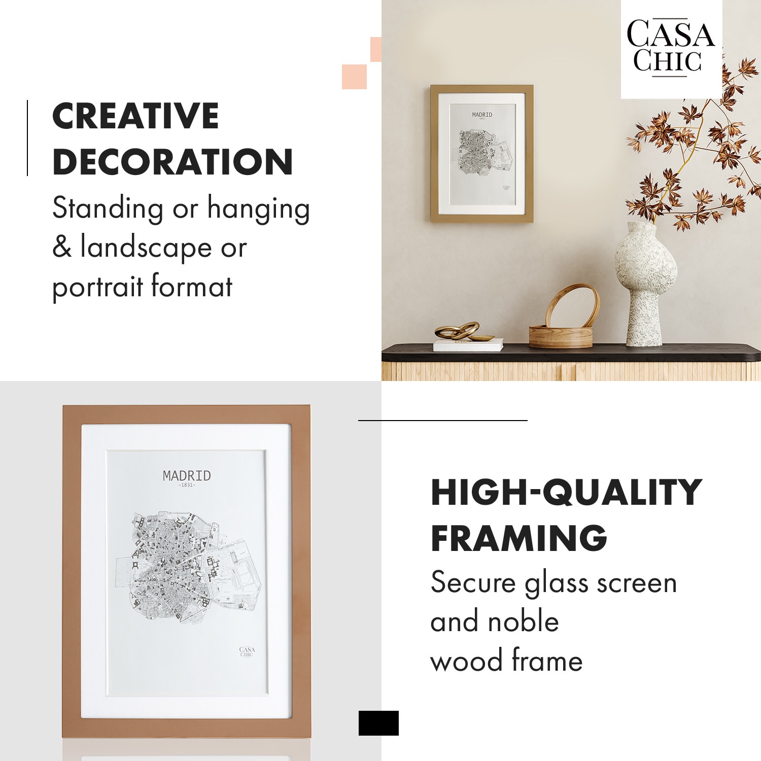 Rámčeky na obrazyBerwick od Casa Chic by blumfeldt vnesú do vášho domova novú eleganciu. Šikovne prezentujte svoje obľúbené fotografie – s paspartou alebo bez nej: ako stojan na výšku alebo na šírku alebo ako klasický nástenný rám. Za sklenenou tabuľou sa každý obrázok stane lákadlom pre oči. Kvalitný držiak na zadnej strane umožňuje mimoriadne jednoduché vkladanie alebo výmenu obrázkov. Každý deň vám vyčarí úsmev na tvári: V štýlových fotorámikoch Berwick nájdu vaše spomienky krásny domov.