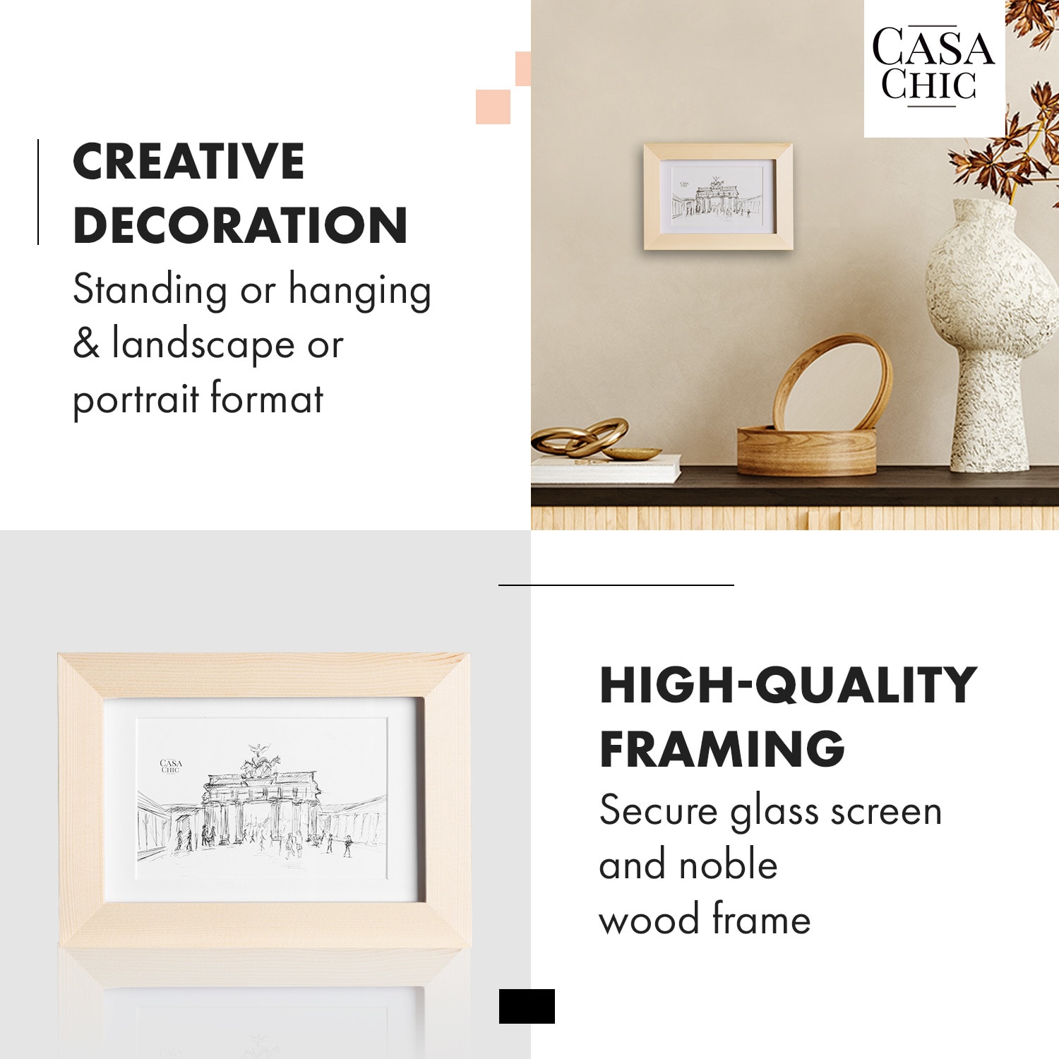 S jednoduchým fotorámom z pravého dreva Edinburgh od Casa Chic by blumfeldt zvýrazníte vaše fotky a obrázky vo formáte na výšku, ako aj na šírku. Vytvorte si krásne nástenné koláže alebo naaranžujte svoje obľúbené fotografie na príborník alebo poličku. S rámom Edinburgh ste flexibilní. Priložená pasparta ponecháva výber vhodnej obrazovej časti na vás. Jeho široký profil mu dodáva luxusný kontrast a predná strana zo skla chráni pred prachom a nečistotami.Jednoducho si zo svojich fotografií, obrázkov alebo umeleckých výtlačkov urobte viac: Fotorámik Edinburgh od Casa Chic by blumfeldt vám to umožní.