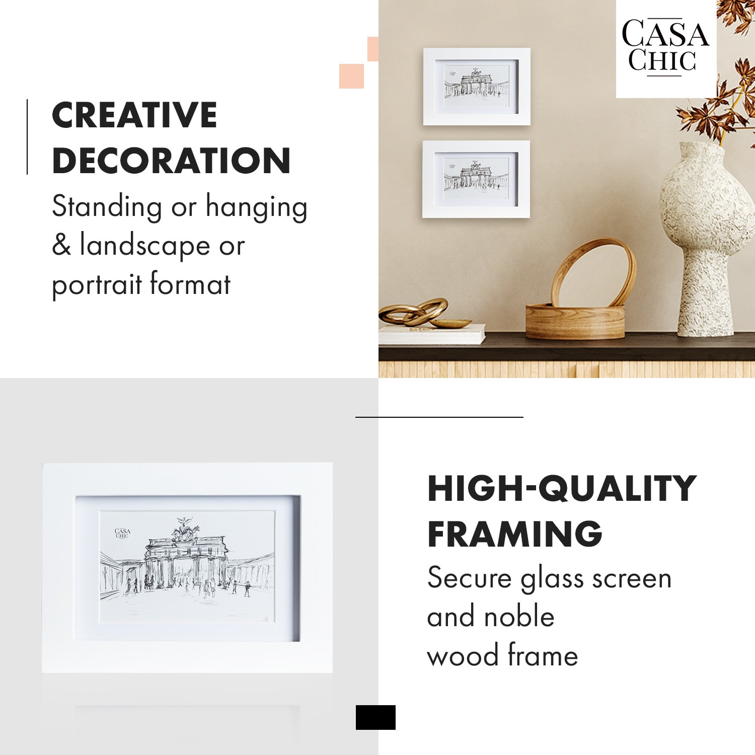 So sympatickými rámami na fotografie z pravého dreva v 3 dielnej sade Everton od Casa Chic by blumfeldt zvýrazníte vaše fotky a obrázky vo formáte na výšku, ako aj na šírku. Buďte flexibilní a vytvorte si krásne nástenné koláže alebo naaranžujte svoje obľúbené fotografie na príborník alebo poličku. Priložená pasparta ponecháva výber vhodnej obrazovej časti na vás. Jednoduchý profil rámu a predné sklo z pravého skla poskytujú eleganciu a najlepšiu ochranu.Pre domov plný krásnych spomienok: Sada 3 rámov na fotografie Everton od Casa Chic by blumfeldt šikovne prezentuje výnimočné okamihy.