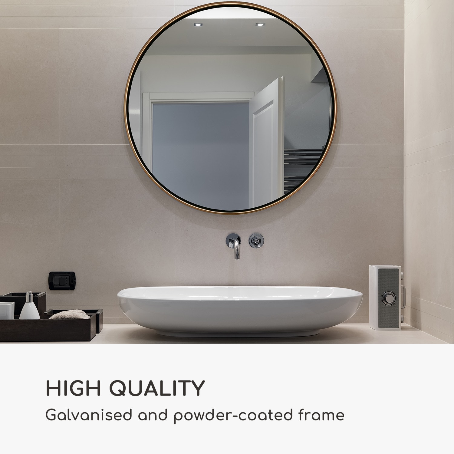 Nástenné zrkadlo Fournier od Casa Chic by blumfeldt s elegantným kovovým rámom obohatí každú vašu miestnosť. Ako dekoratívny prvok zažiari v obývacej izbe, vstupnej hale, či v spálni alebo kúpeľni. Rám je pozinkovaný a práškovo lakovaný, takže ho možno bez obáv zavesiť aj do vlhkých priestorov. Jeho okrúhly, nadčasový dizajn pripevnený na stene vytvára skutočný vizuálny pútač. Neokázalé, jednoduché a elegantné: nástenné zrkadlo Fournier od Casa Chic by blumfeldt.
